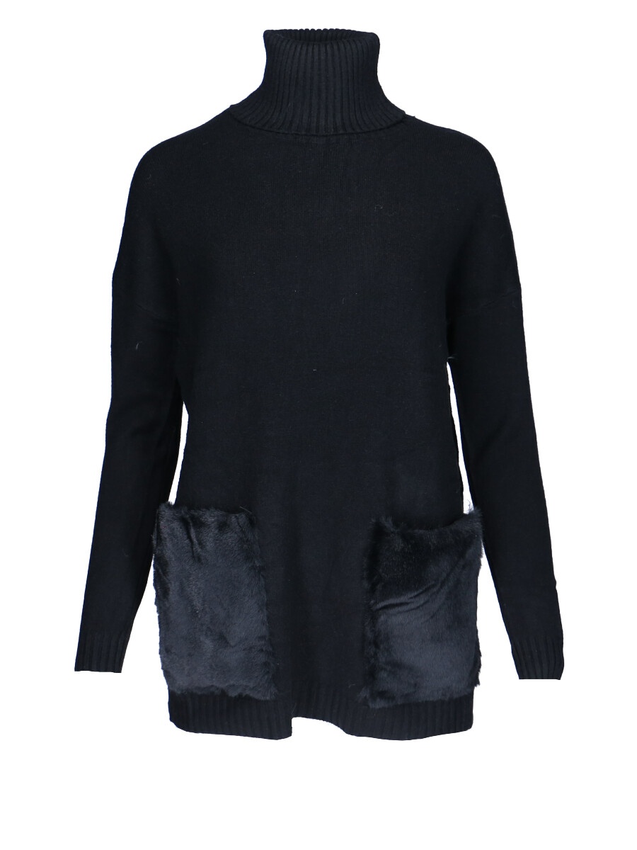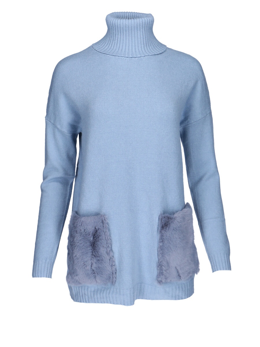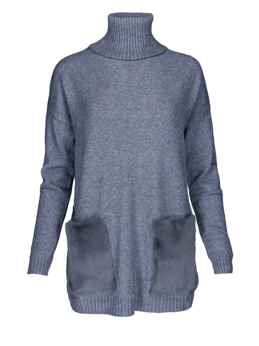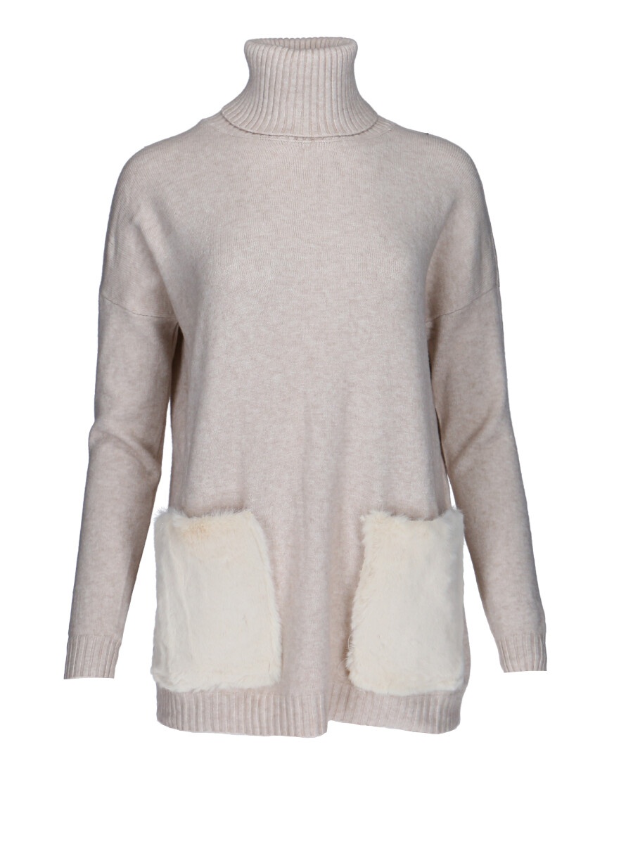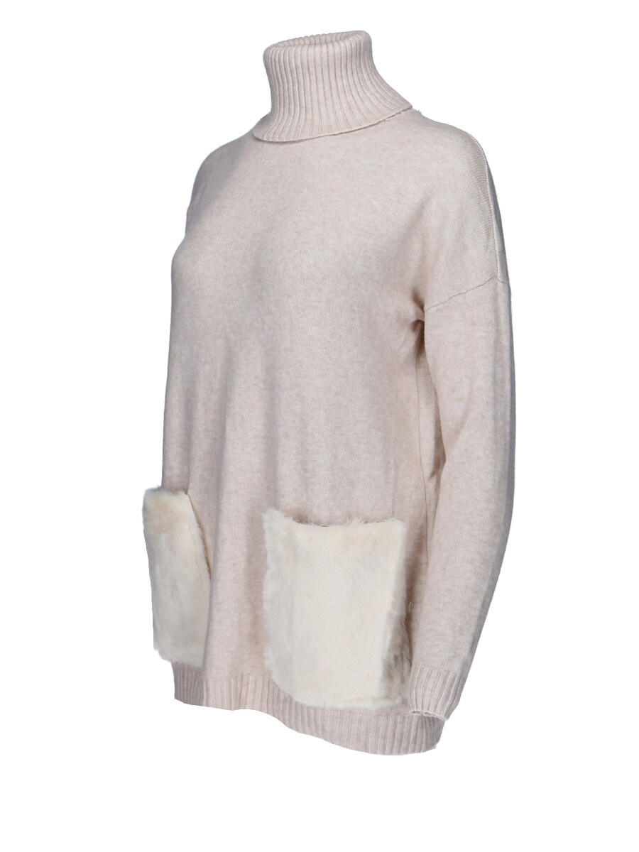 Svetřík s šálovým límcem s kožešinovou aplikací na kapsách