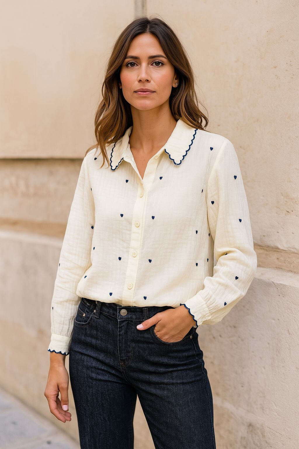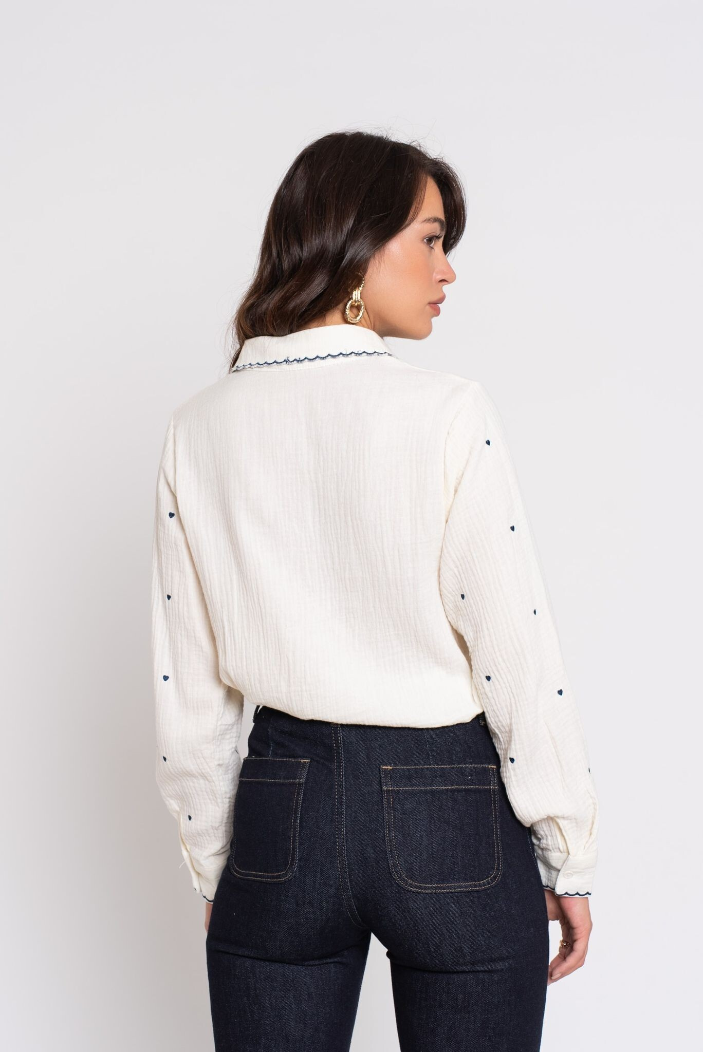 Stylová bavlněná mušelínová košile s aplikací vyšívaných srdíček. Košile má límeček, dlouhý rukáv a je propínací.