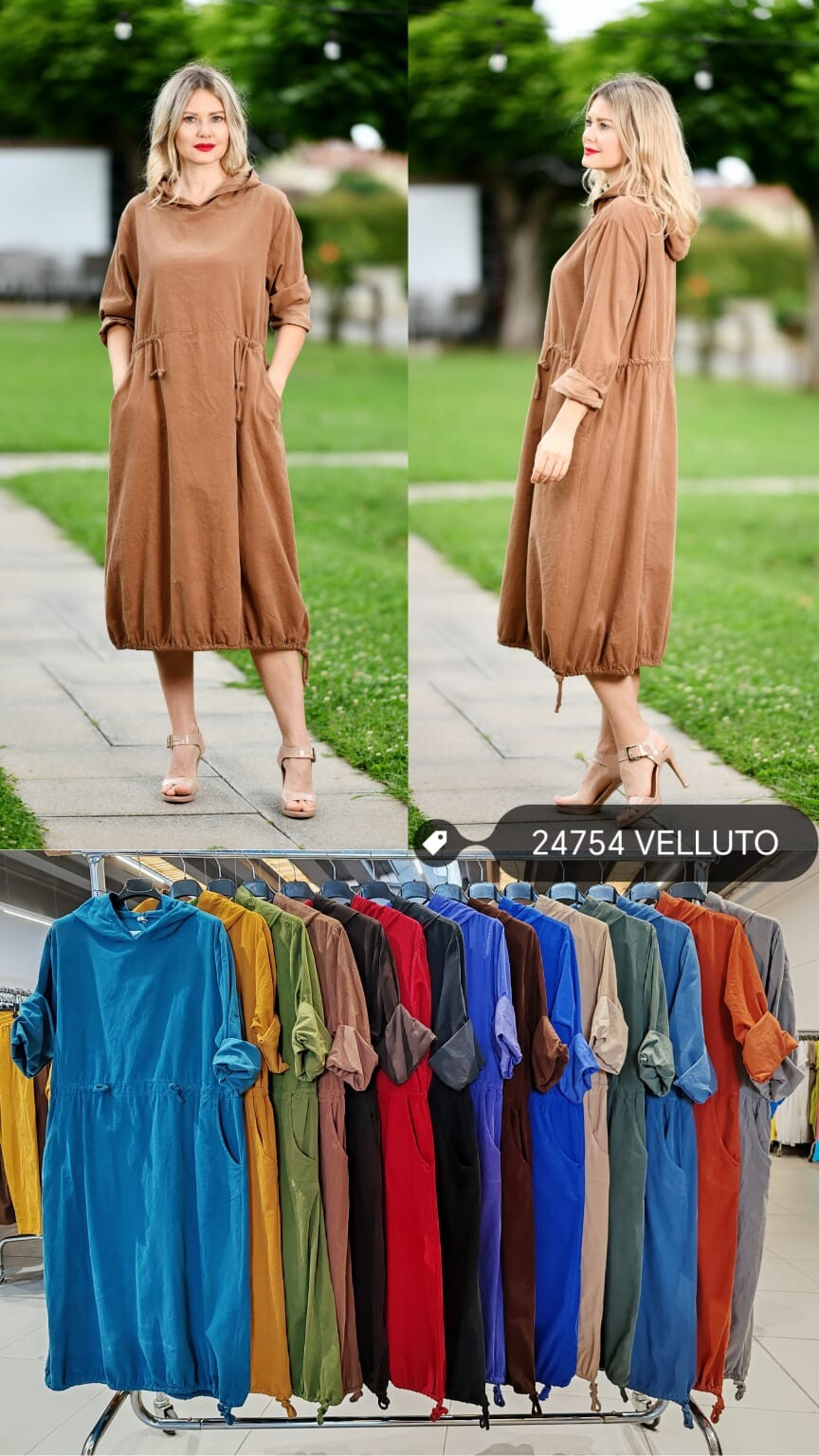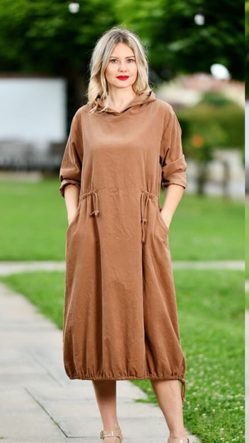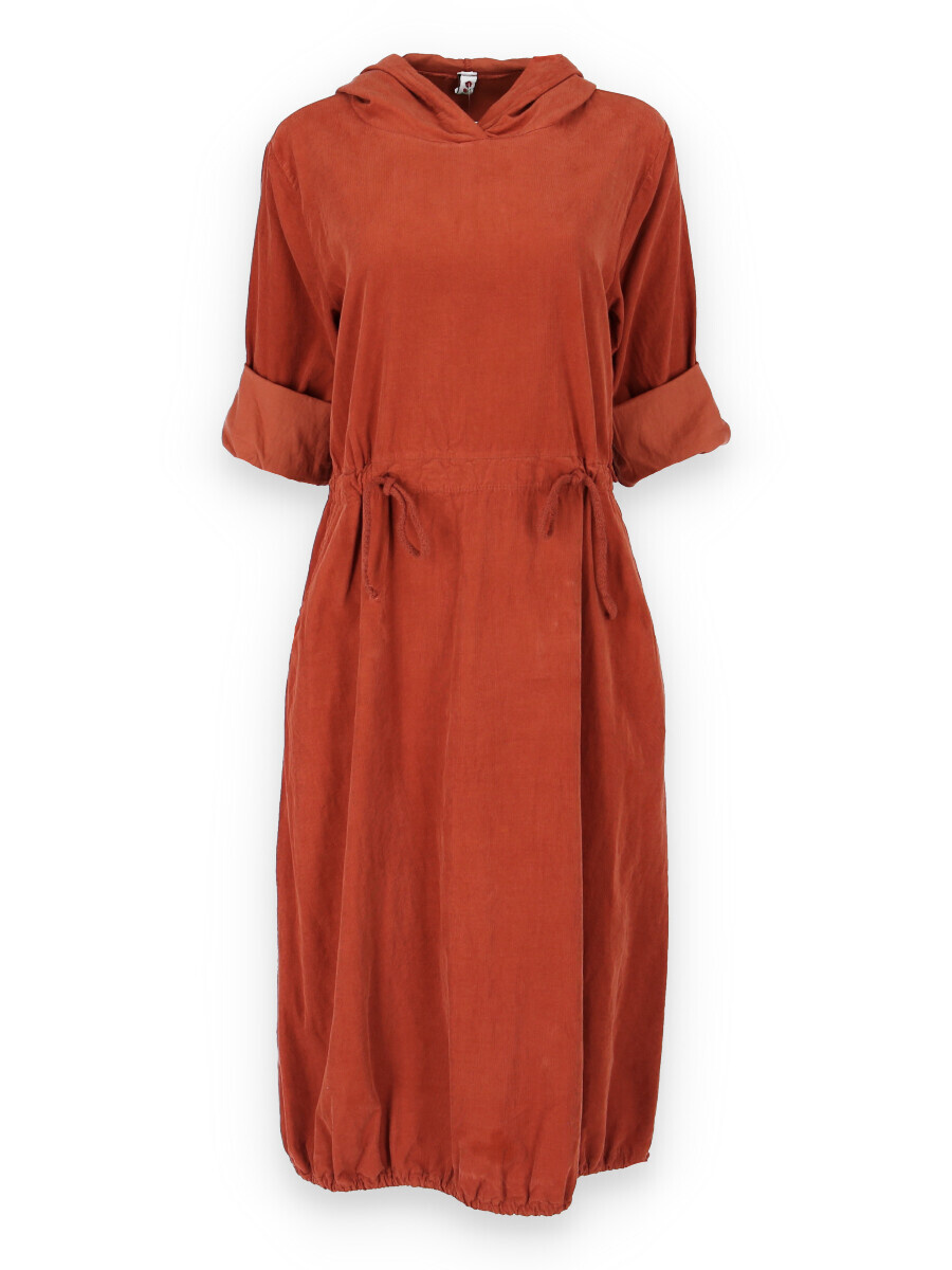 Bavlněné šaty s kapucí z bavlněného manšestru s dlouhým rukávem. Na přední straně jsou našité kapsy, regulace utažení v pase i ve spodní části.