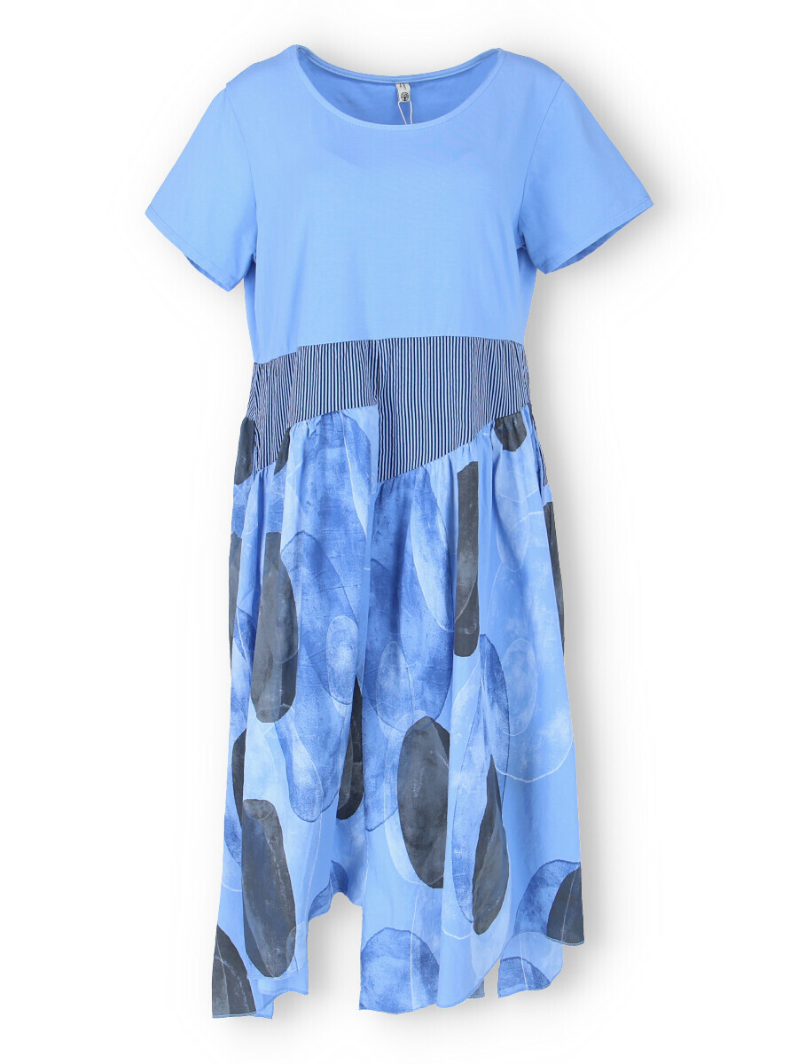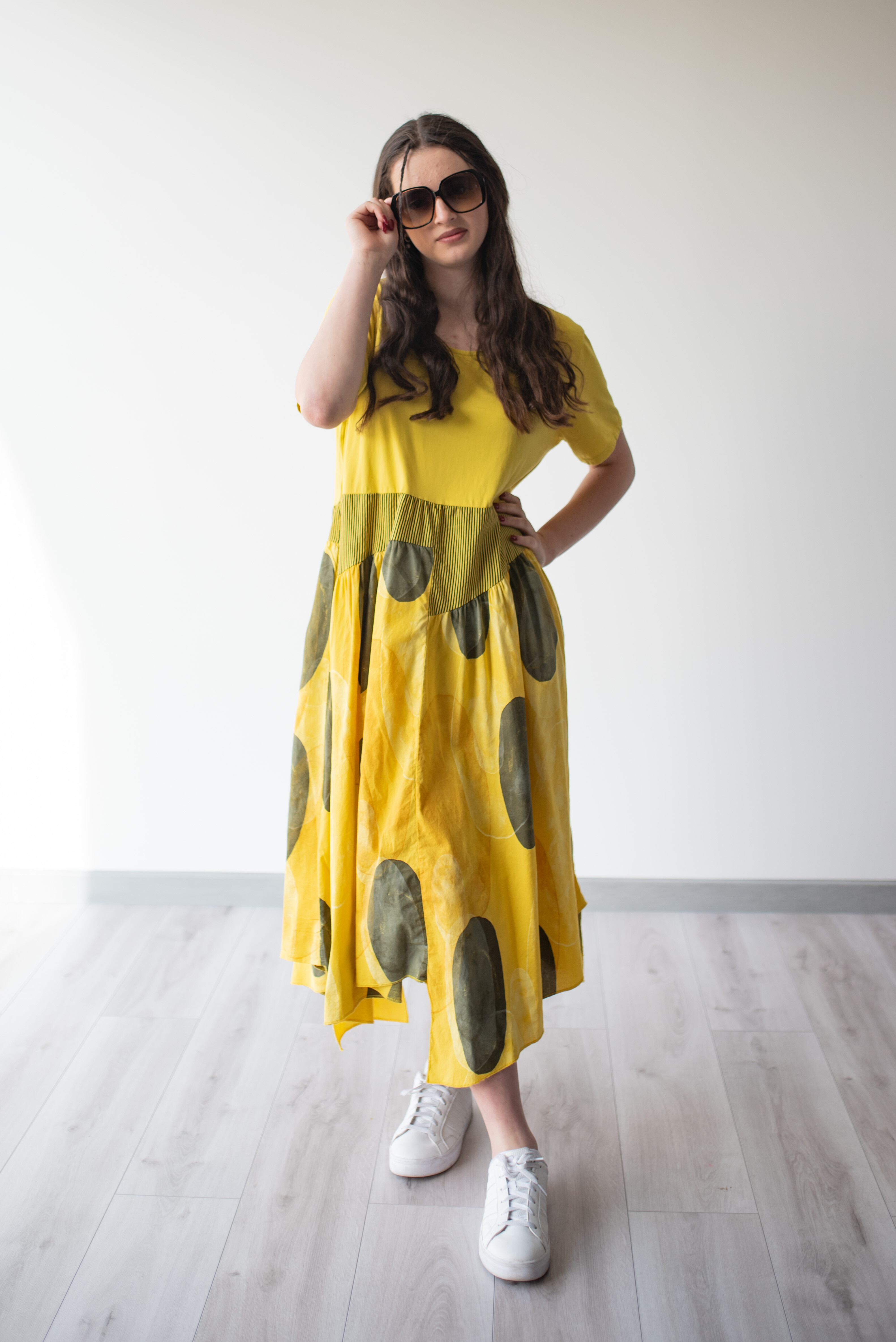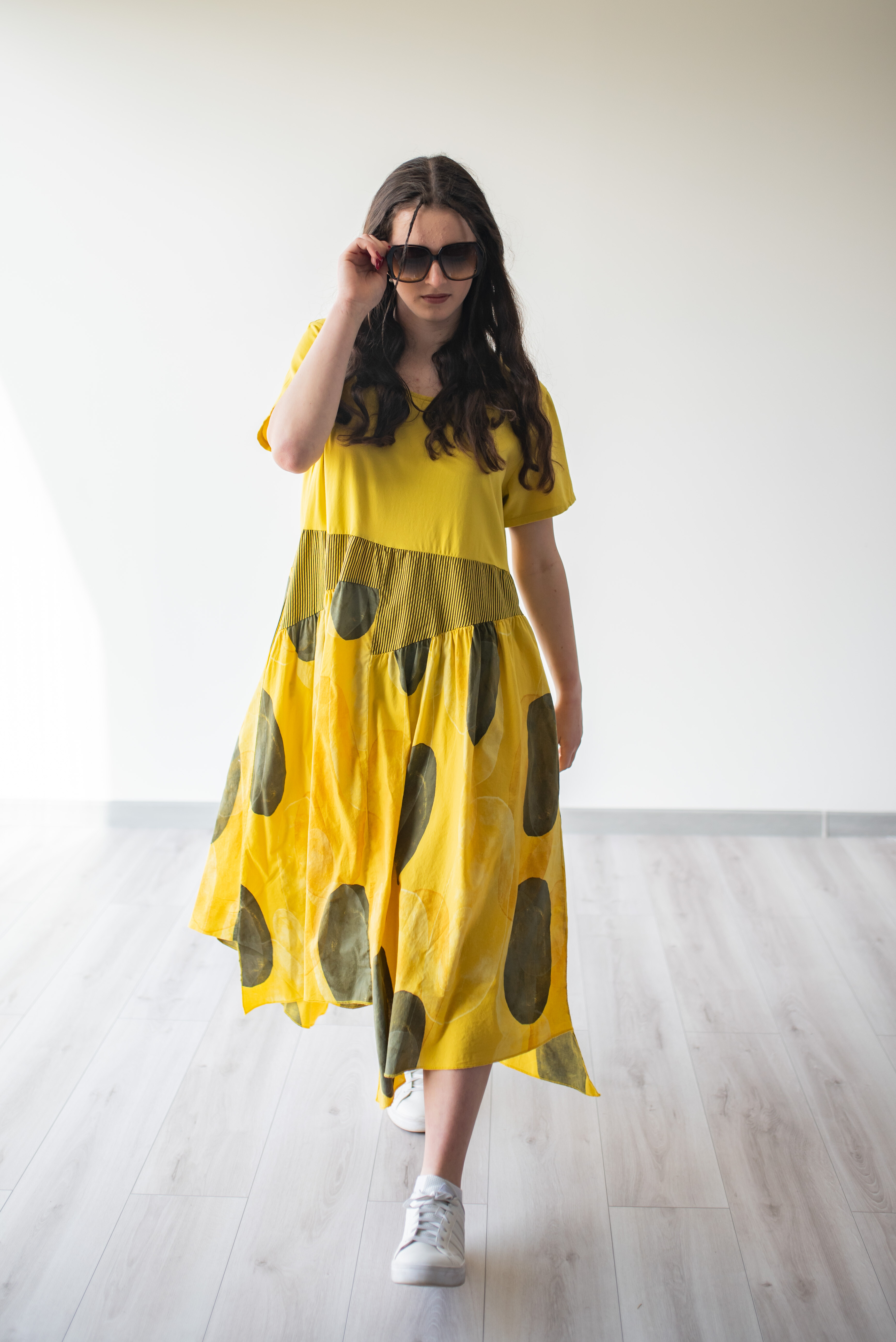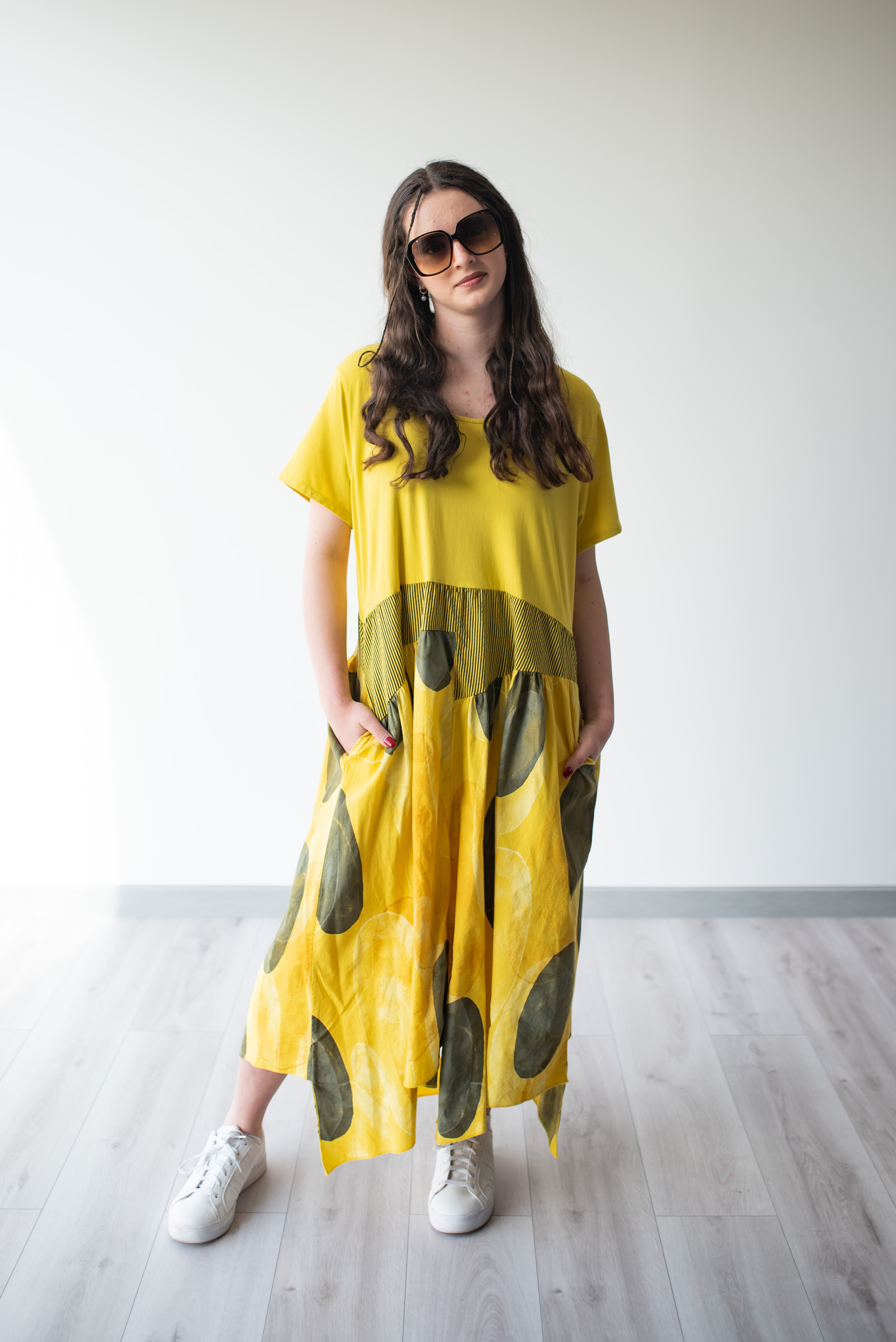 Dlouhé bavlněné šaty asymetricky zakončené ve spodní části. Šaty mají krátký rukáv, kulatý výstřih a na po stranách všité kapsy. Dovoz Itálie
