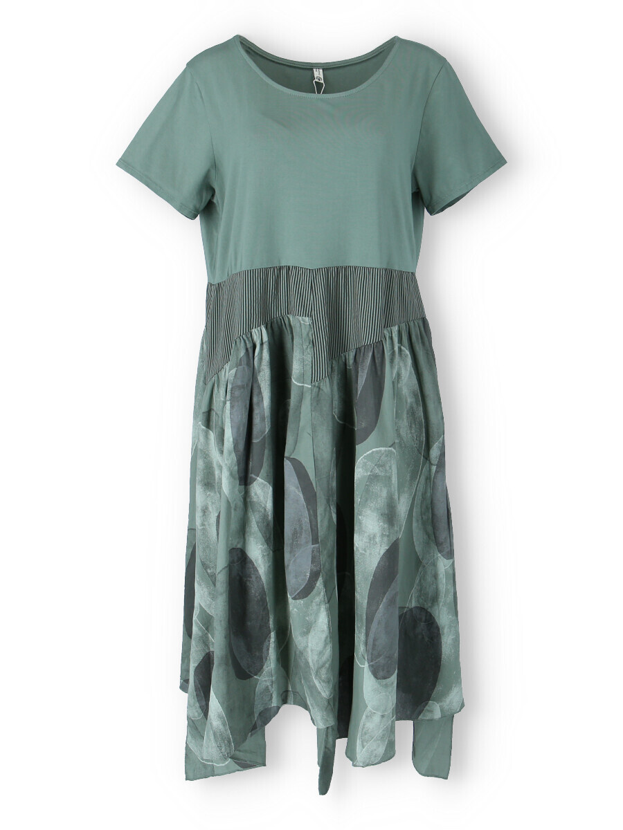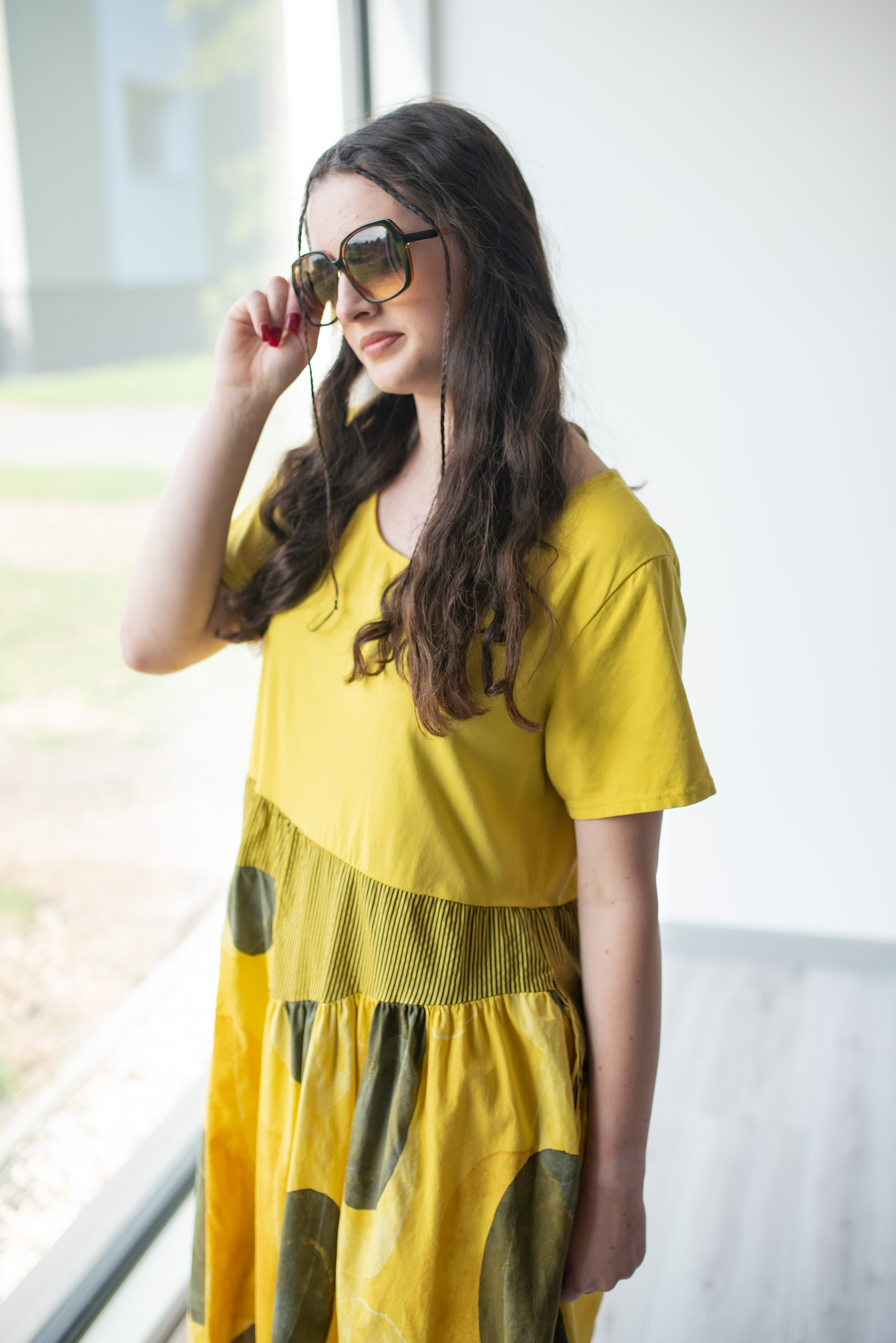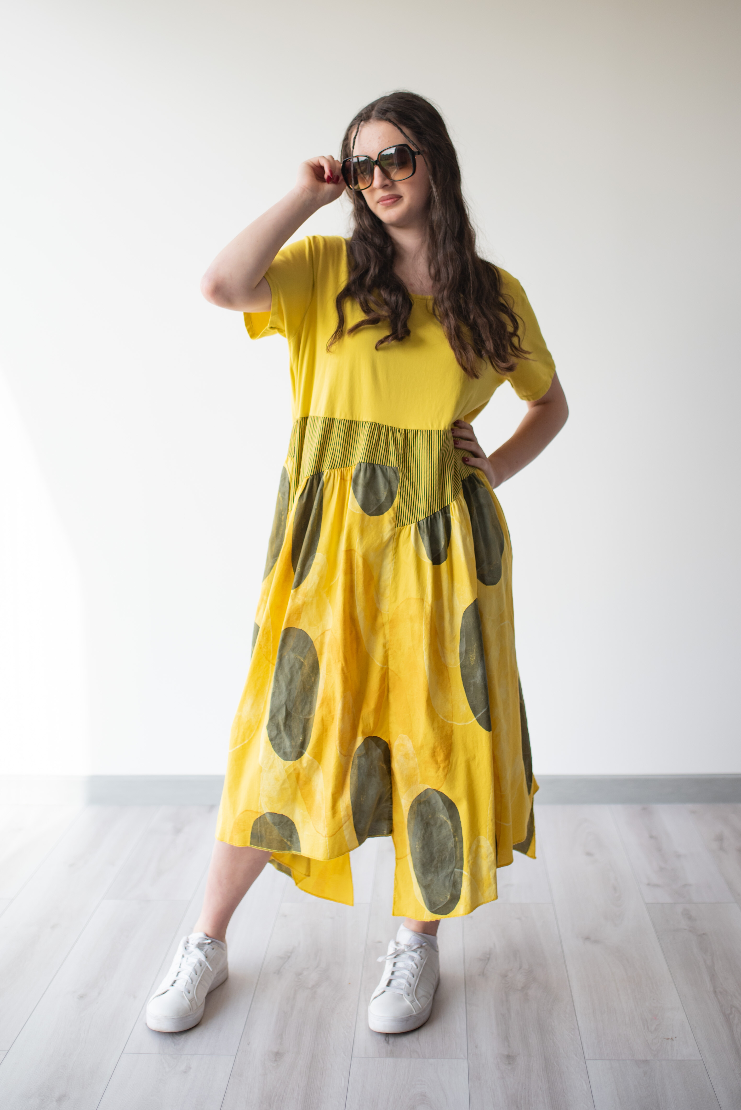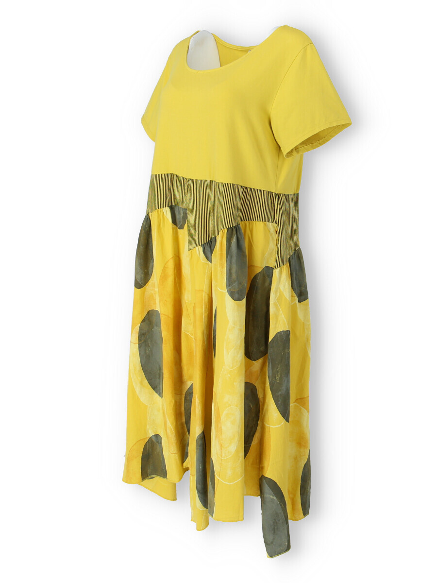 Dlouhé bavlněné šaty asymetricky zakončené ve spodní části. Šaty mají krátký rukáv, kulatý výstřih a na po stranách všité kapsy. Dovoz Itálie