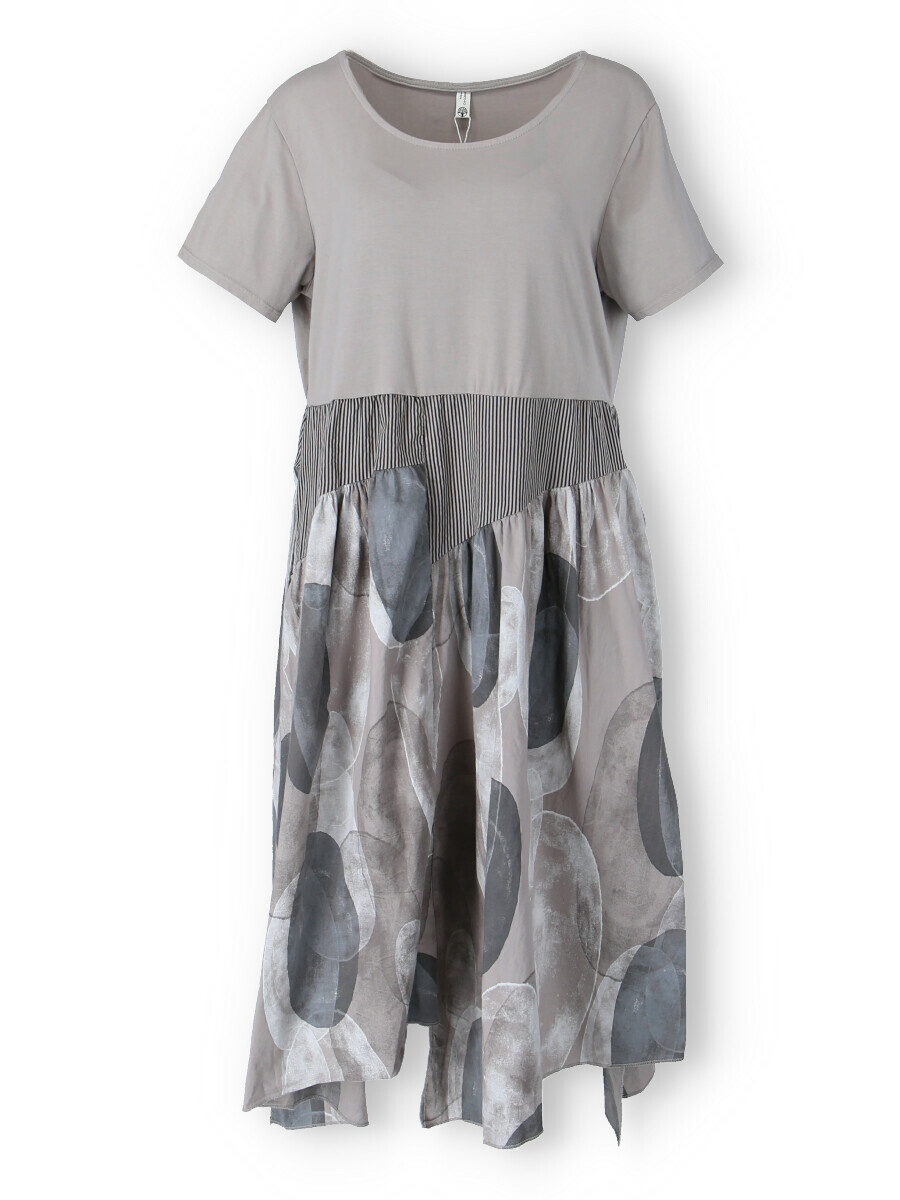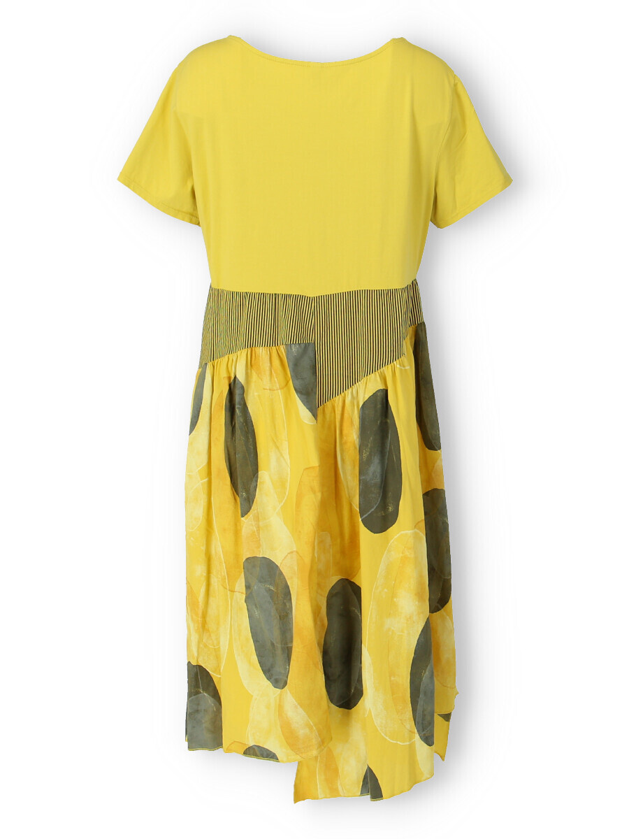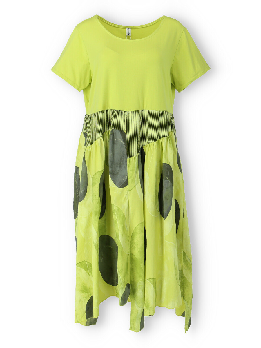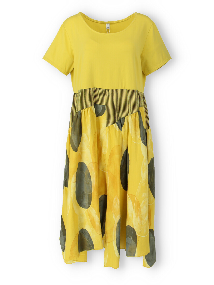 Dlouhé bavlněné šaty asymetricky zakončené ve spodní části. Šaty mají krátký rukáv, kulatý výstřih a na po stranách všité kapsy. Dovoz Itálie