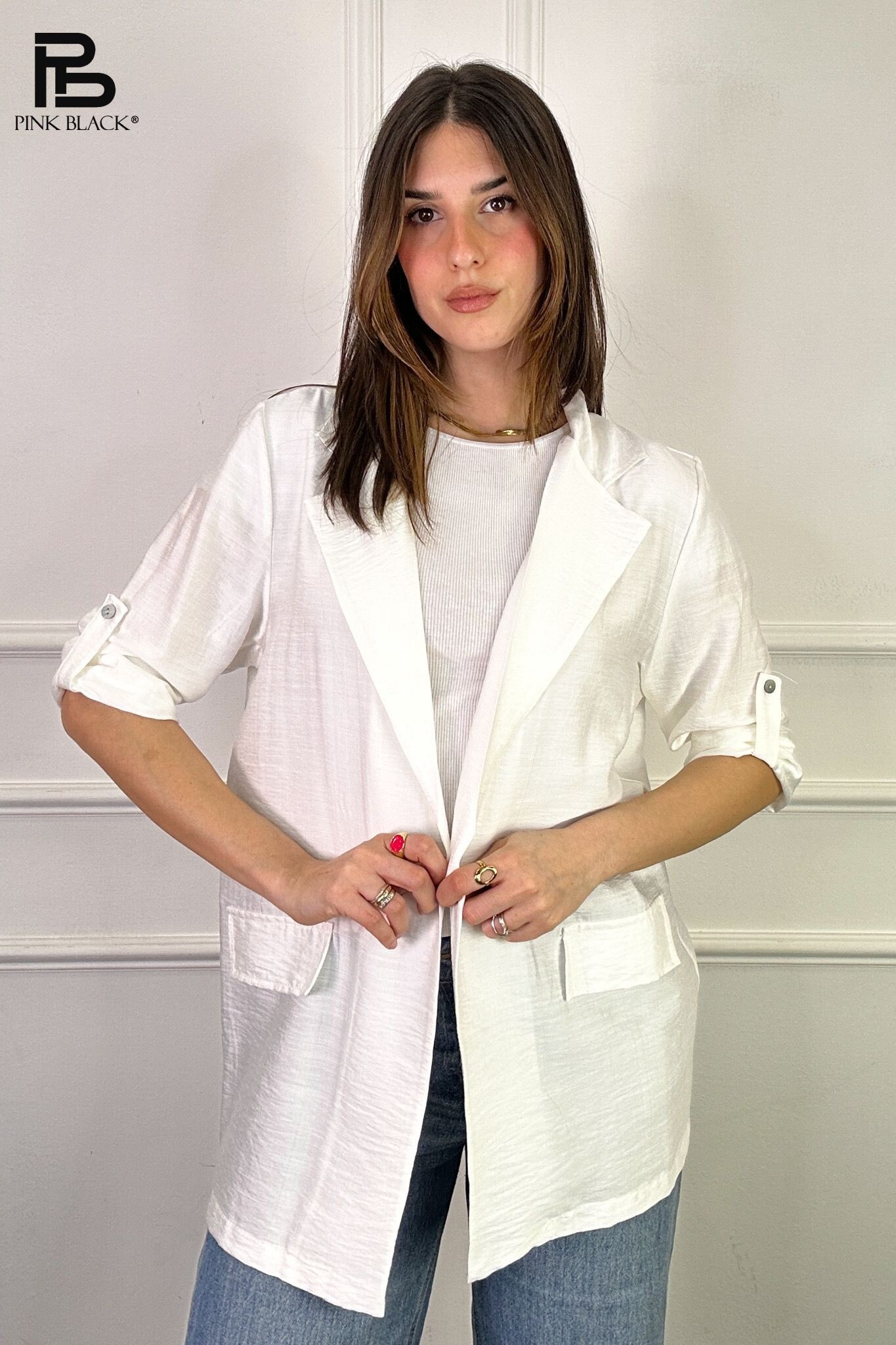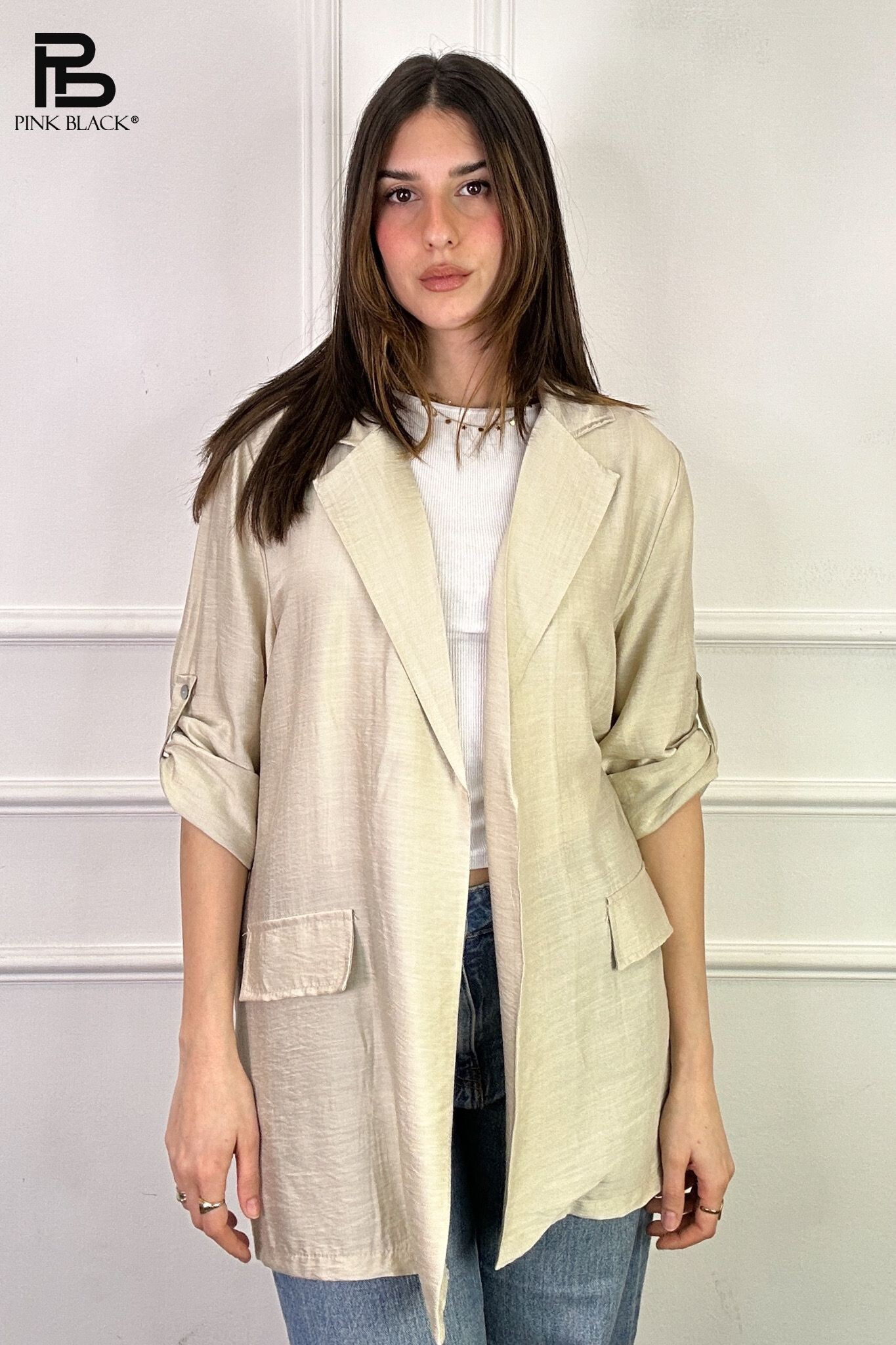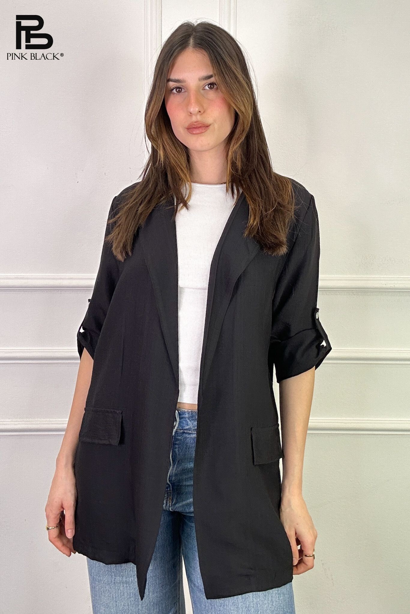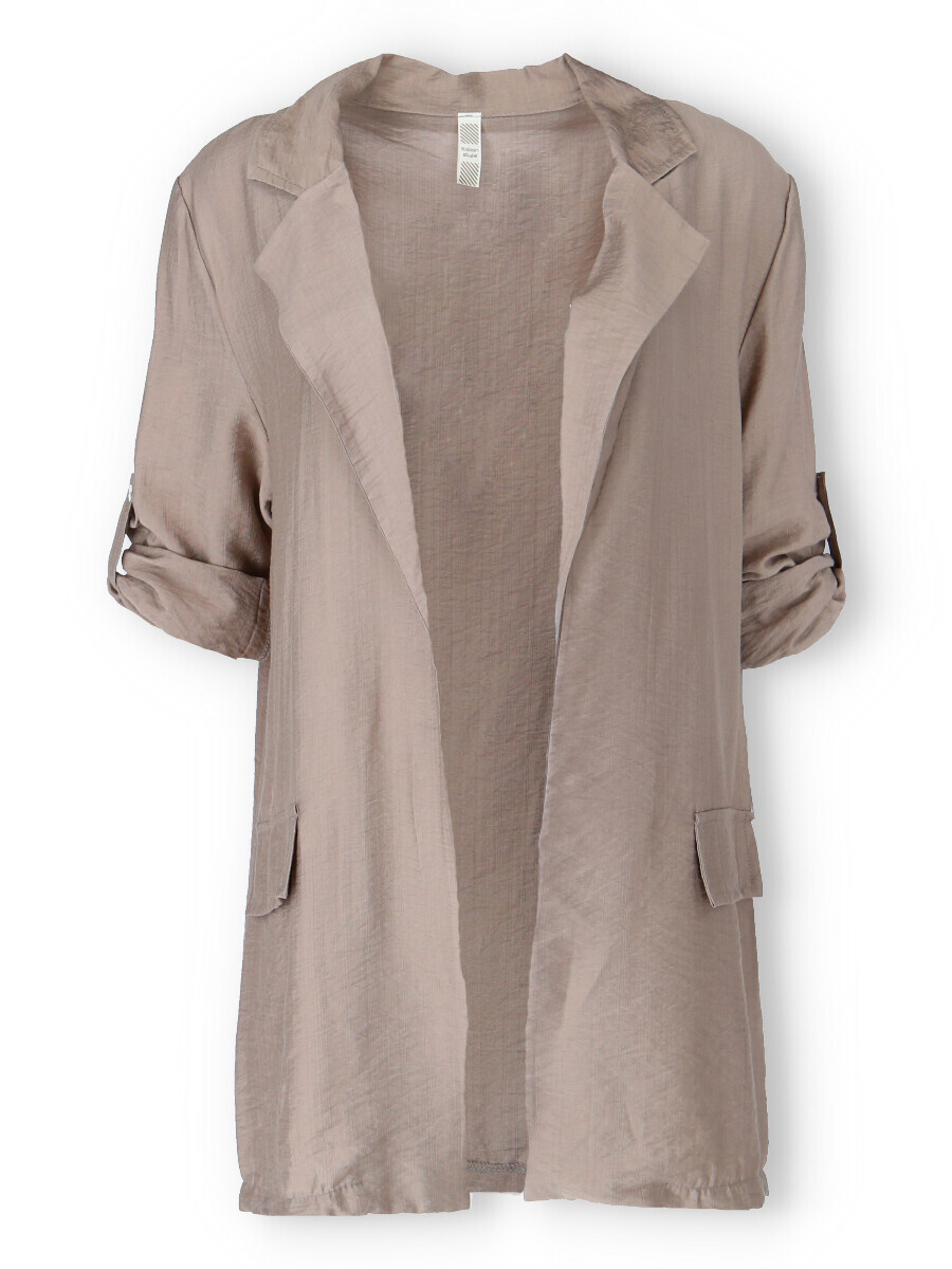 Trendy blejzr/sako s 3/4 rukávem s regulací. Blejzr je z jemného příjemného materiálu, našité klopy na přední straně.