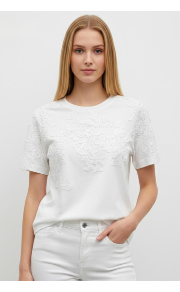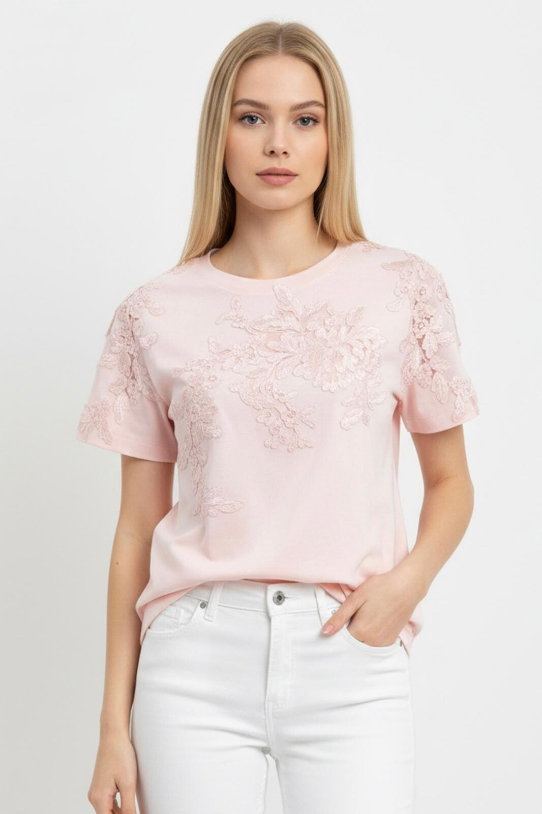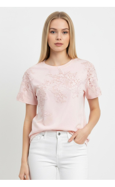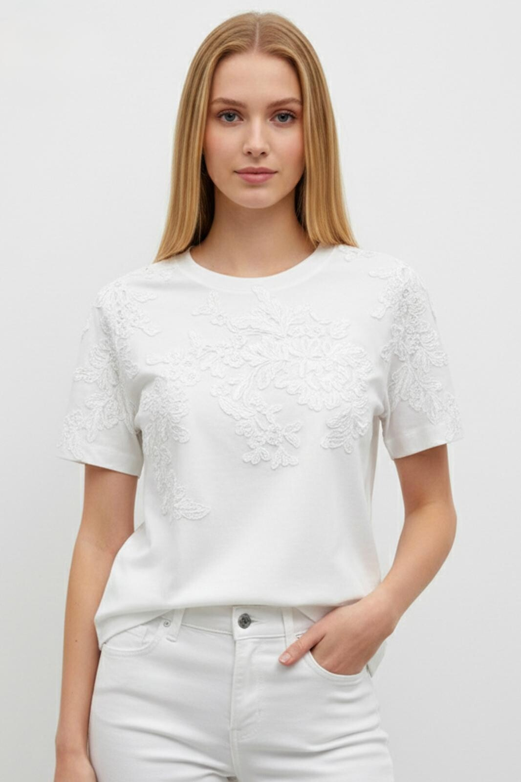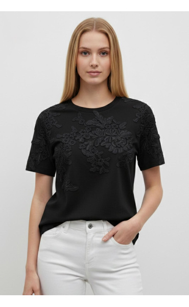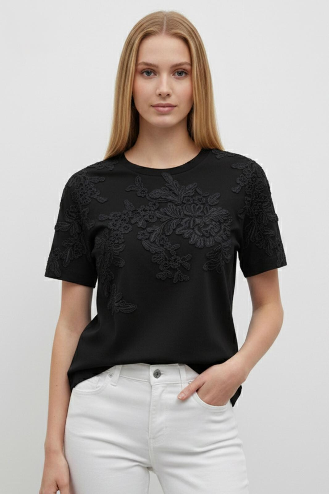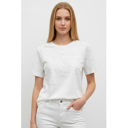 Dámská elegantní halenka/triko kombinované s krajkou. Halenka má krátký rukáv a kulatý výstřih.