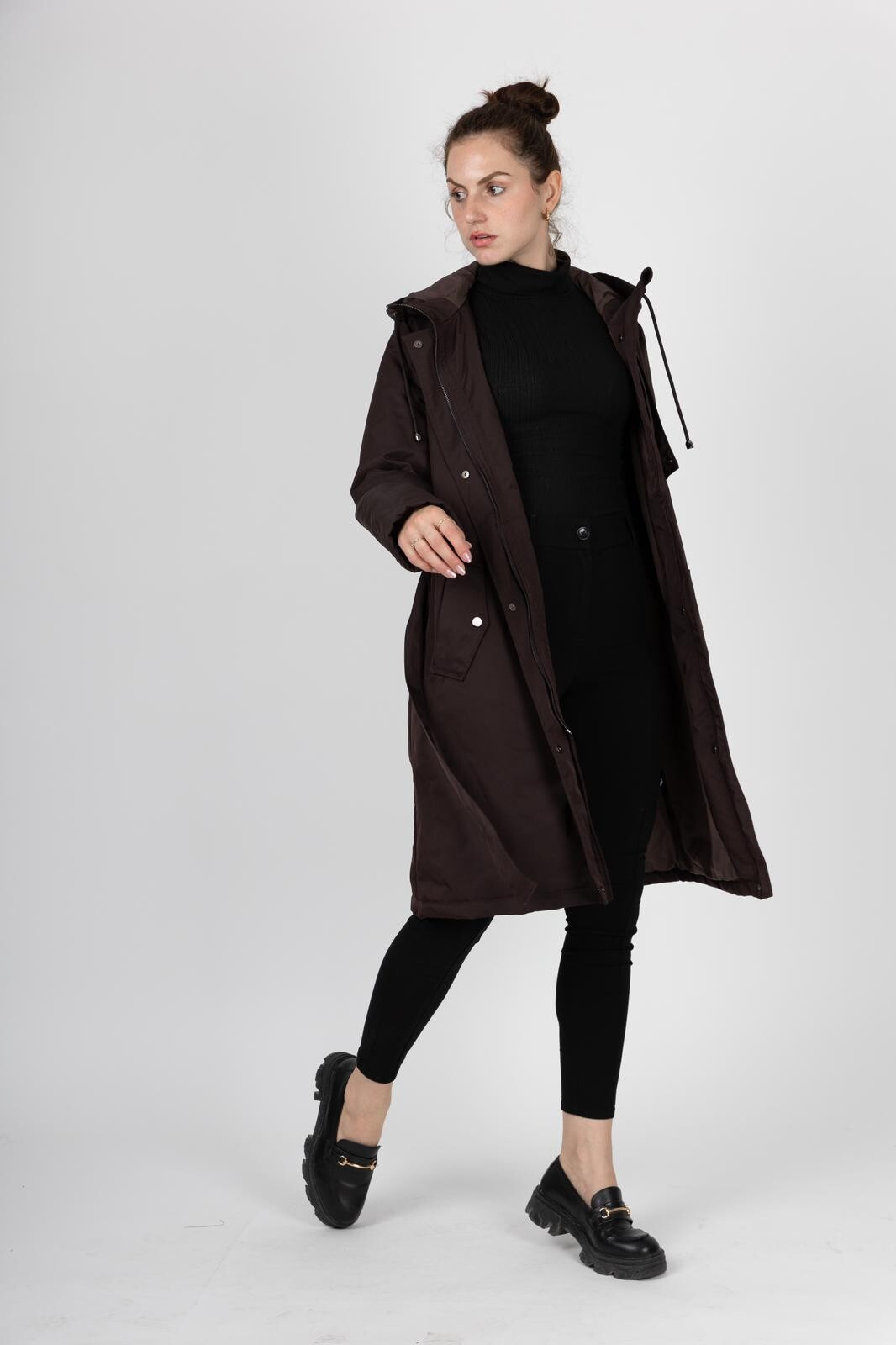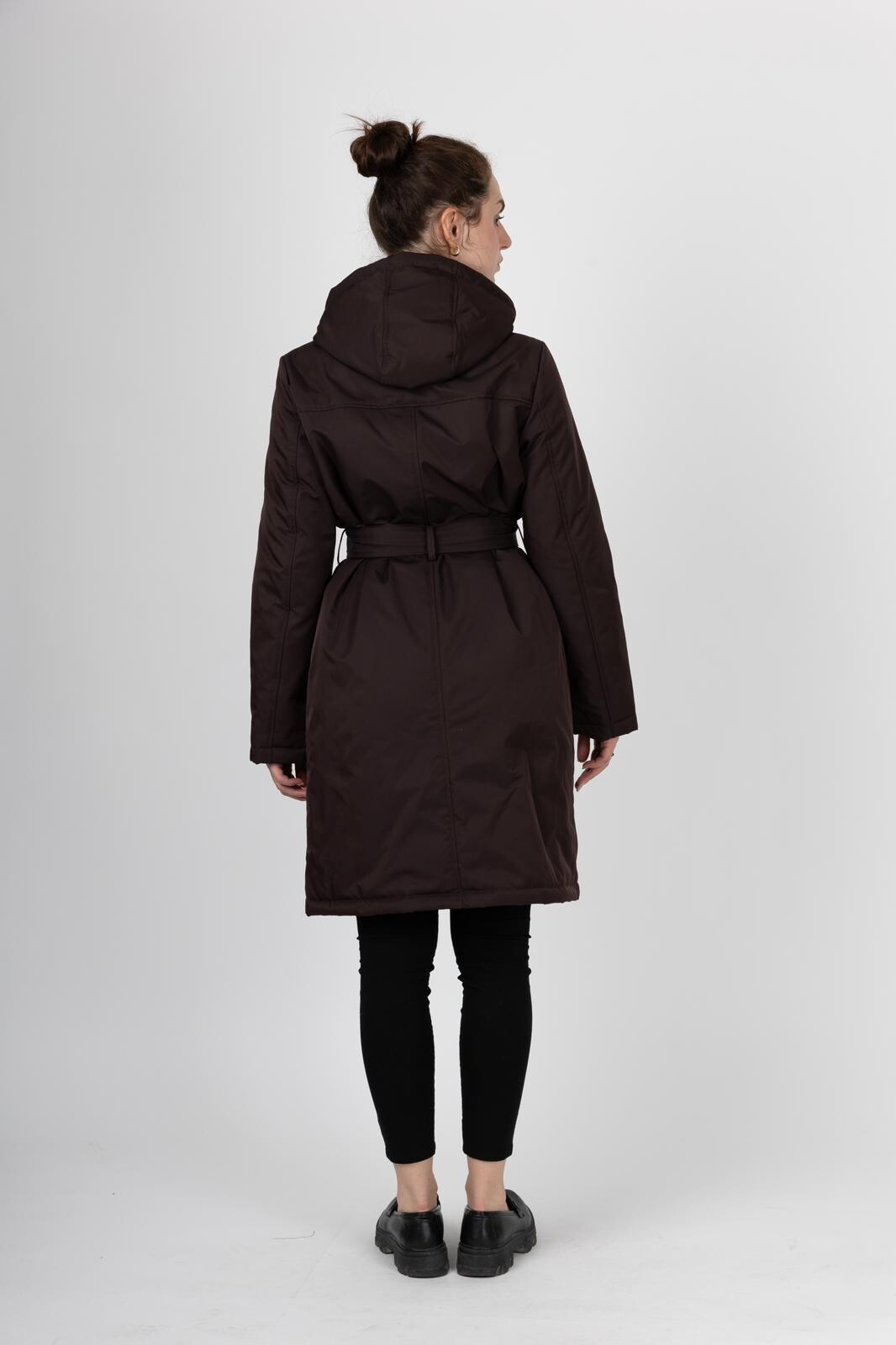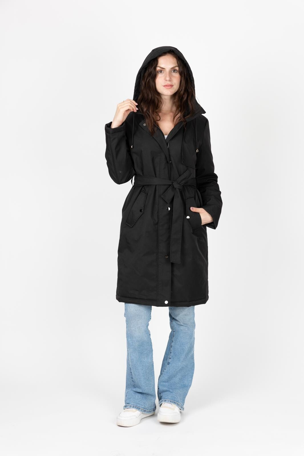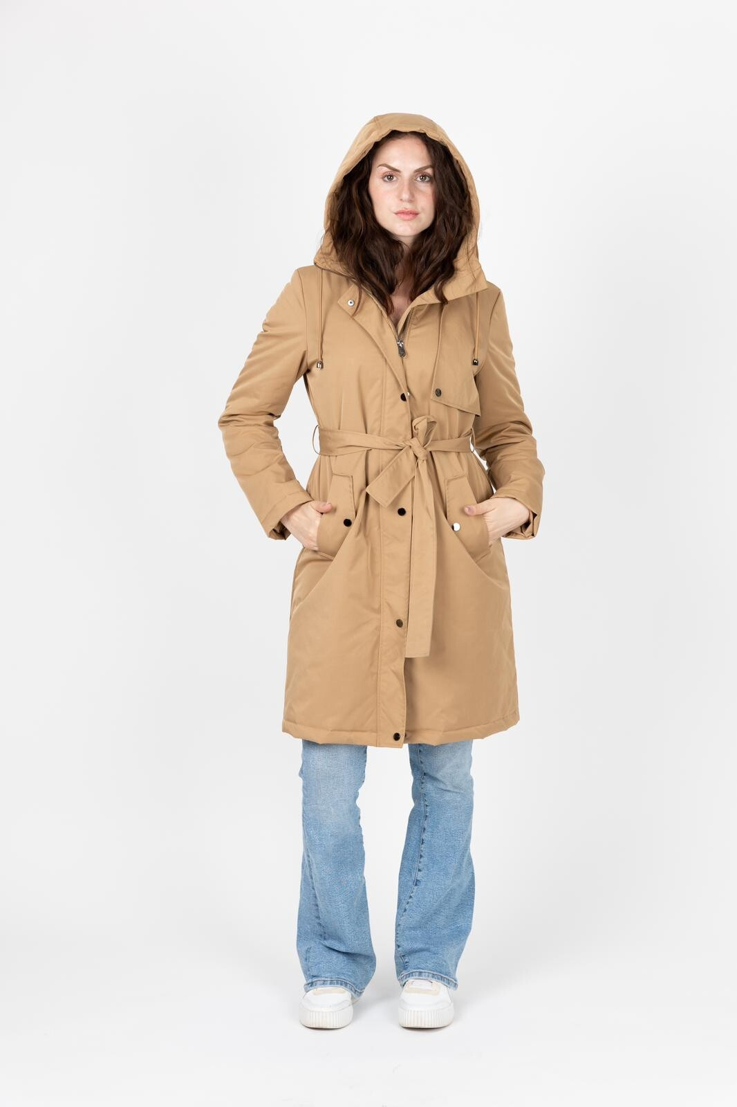 Dámská stylová parka s kapucí. V pase regulace na stažení, doplněno páskem. Parka má zapínání na zip a klopu na druky.