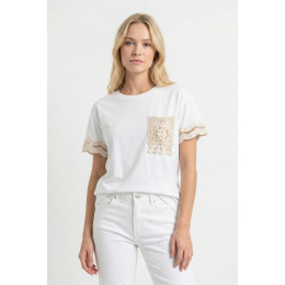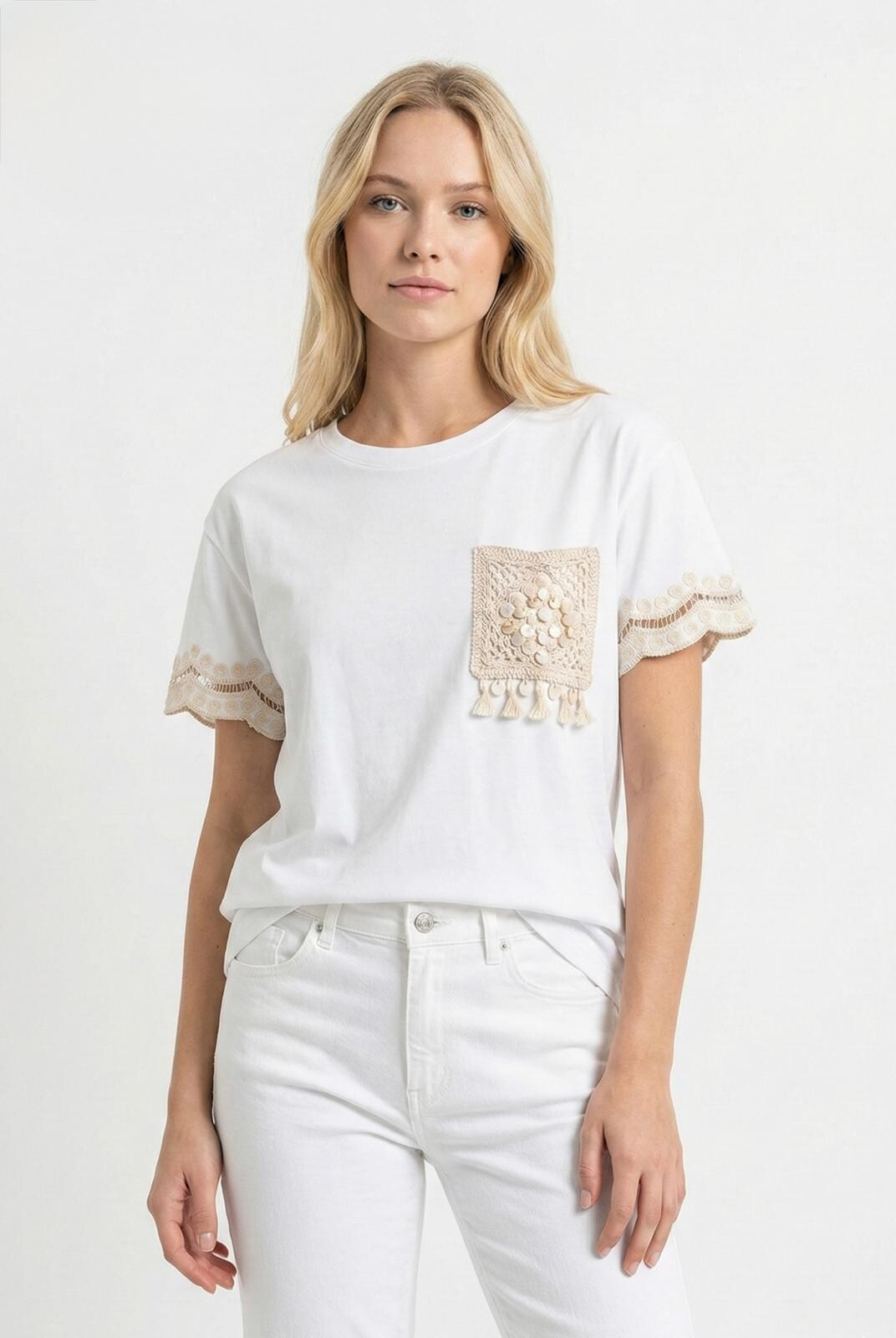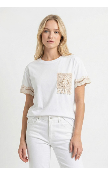 Dámské triko v BOHO stylu s našitou kapsou a třásněmi na rukávech. Triko má krátký rukáv a kulatý výstřih.
