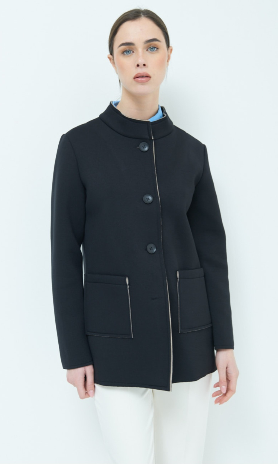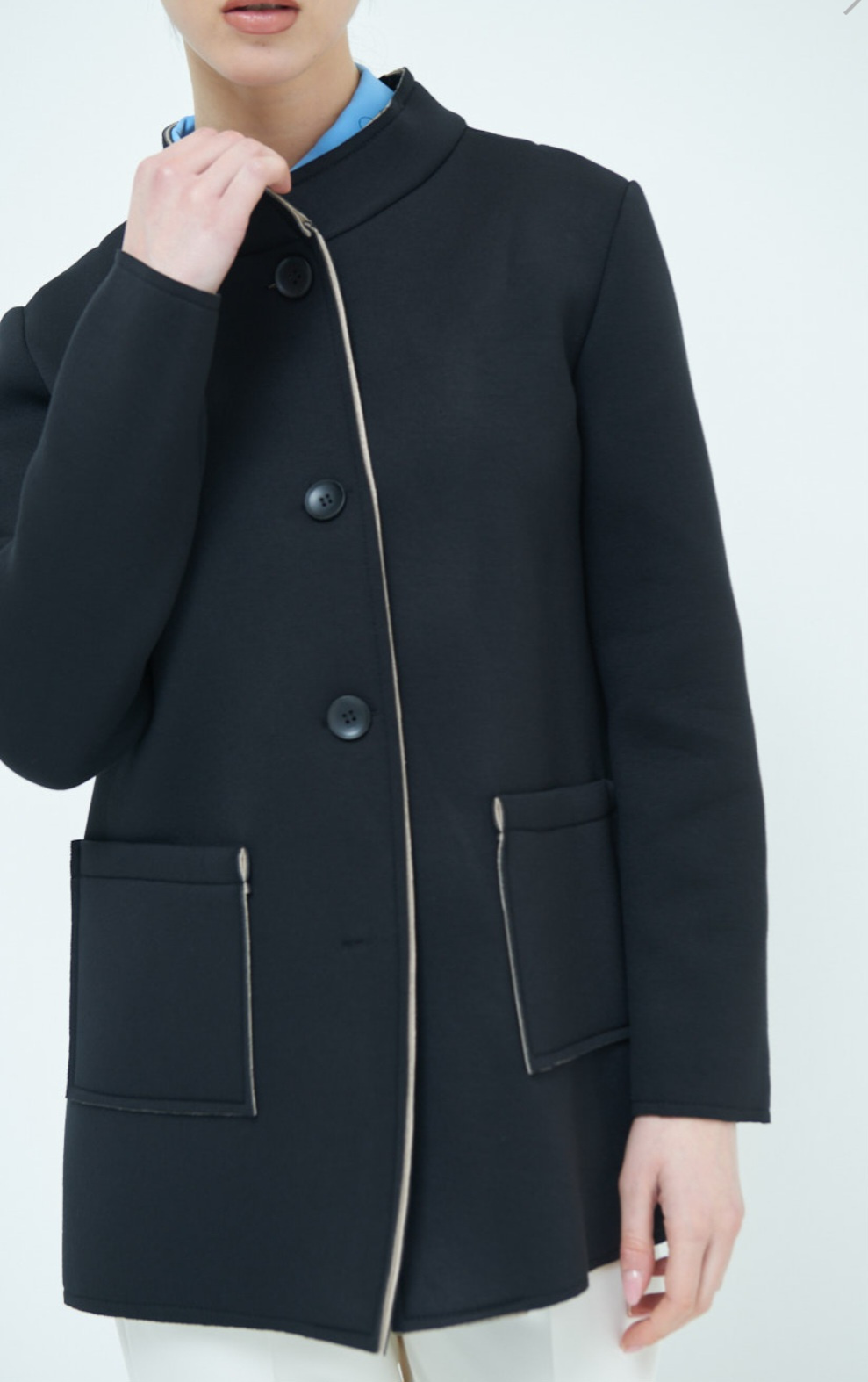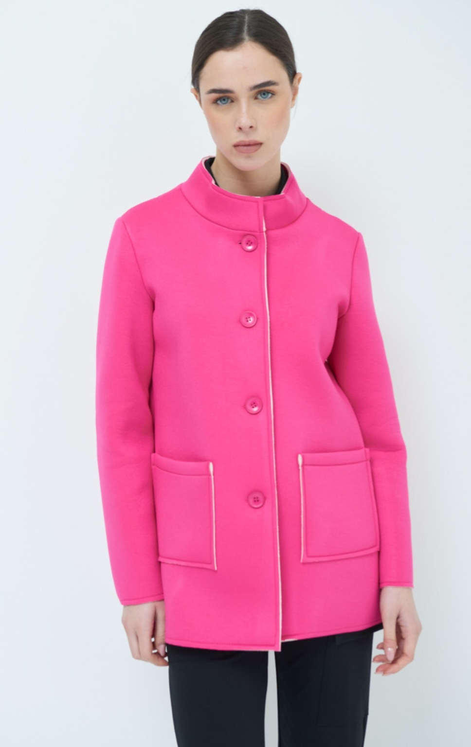 Dámský jarní stylový kabátek se stojákem, neoprenová struktura materiálu