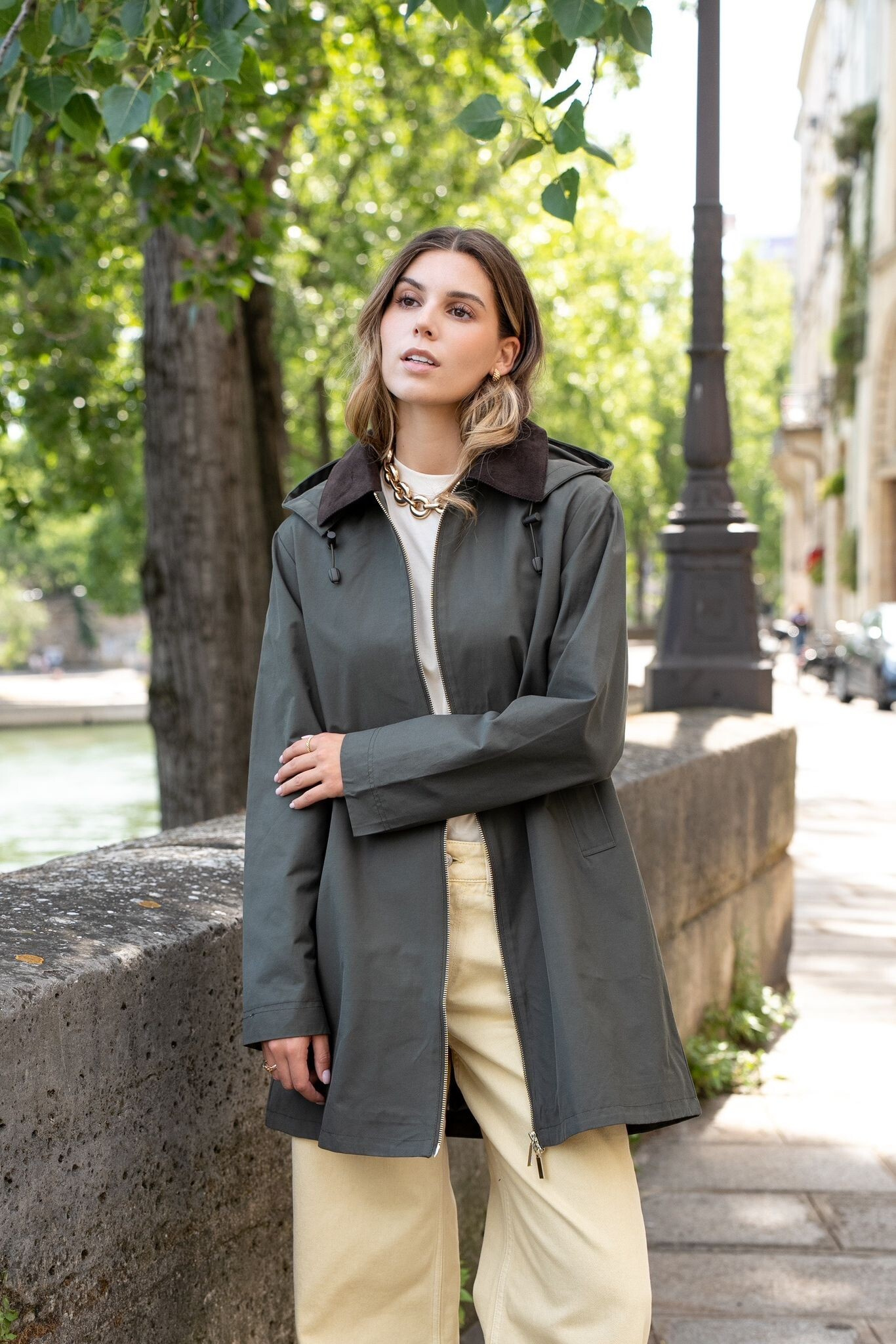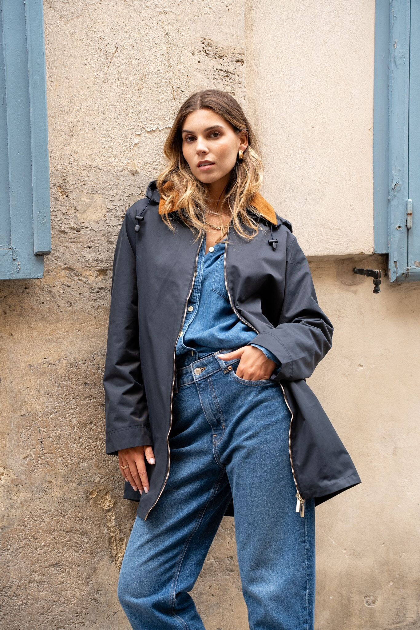 Stylový dámský kabátek se všitými kapsami po stranách. Jedná se o velice módní kousek, který je vhodný i do deště. Kabát má odnímatelnou kapuci a manšestrový límec.