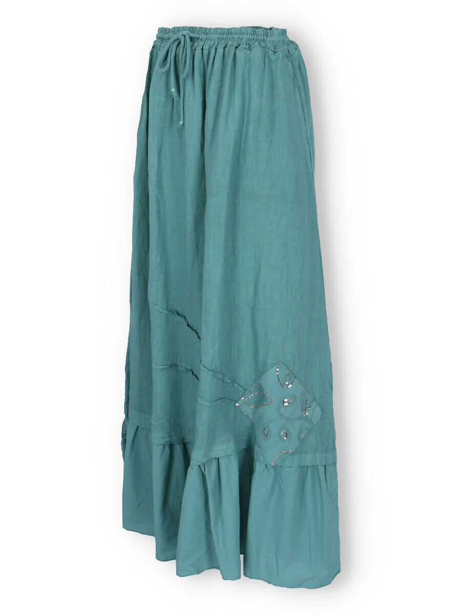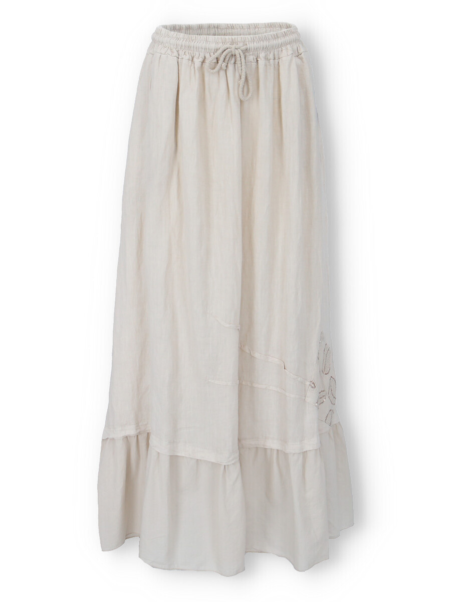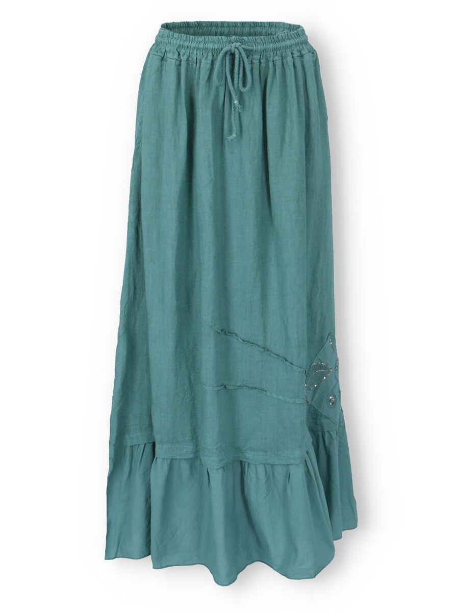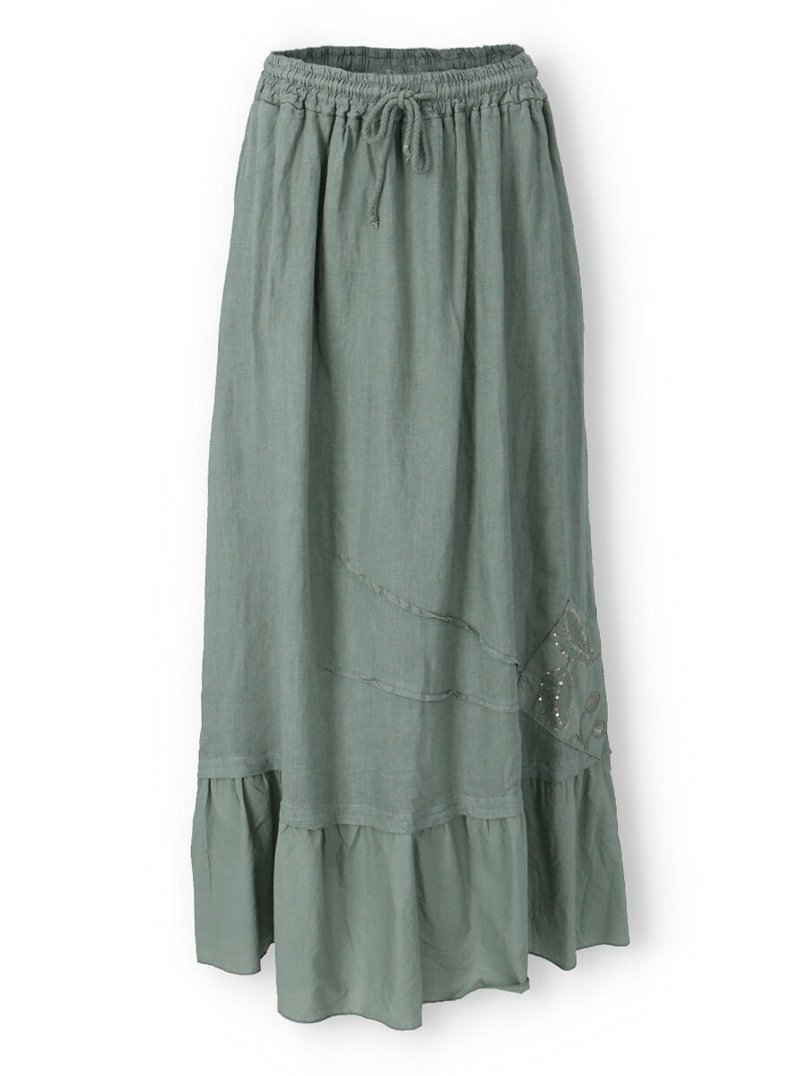 Dlouhá lněná trendy sukně v pase do gumy. Sukně má všité kapsy a ve spodní části aplikaci listů.