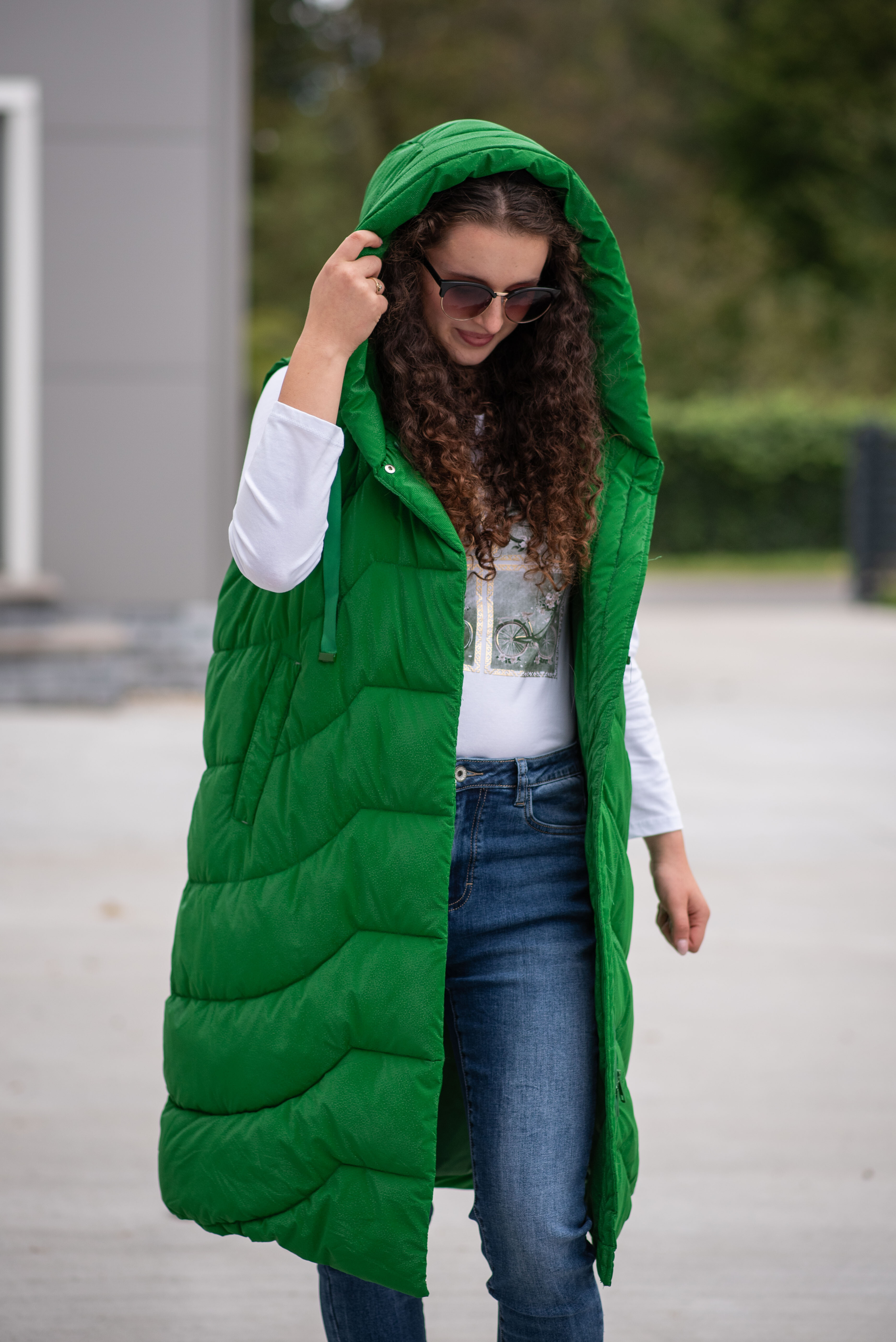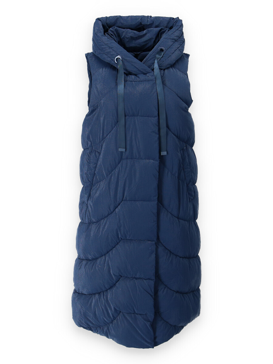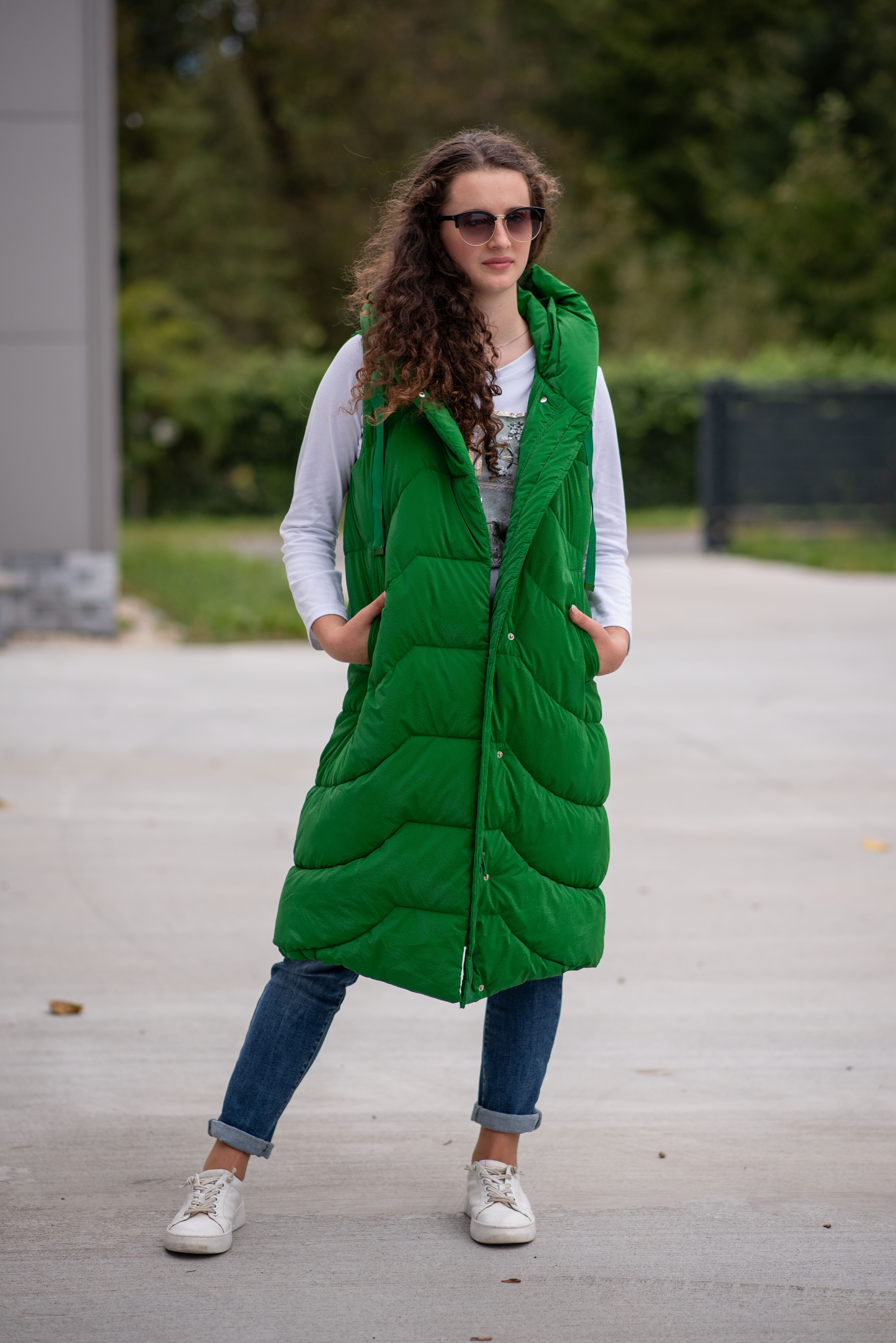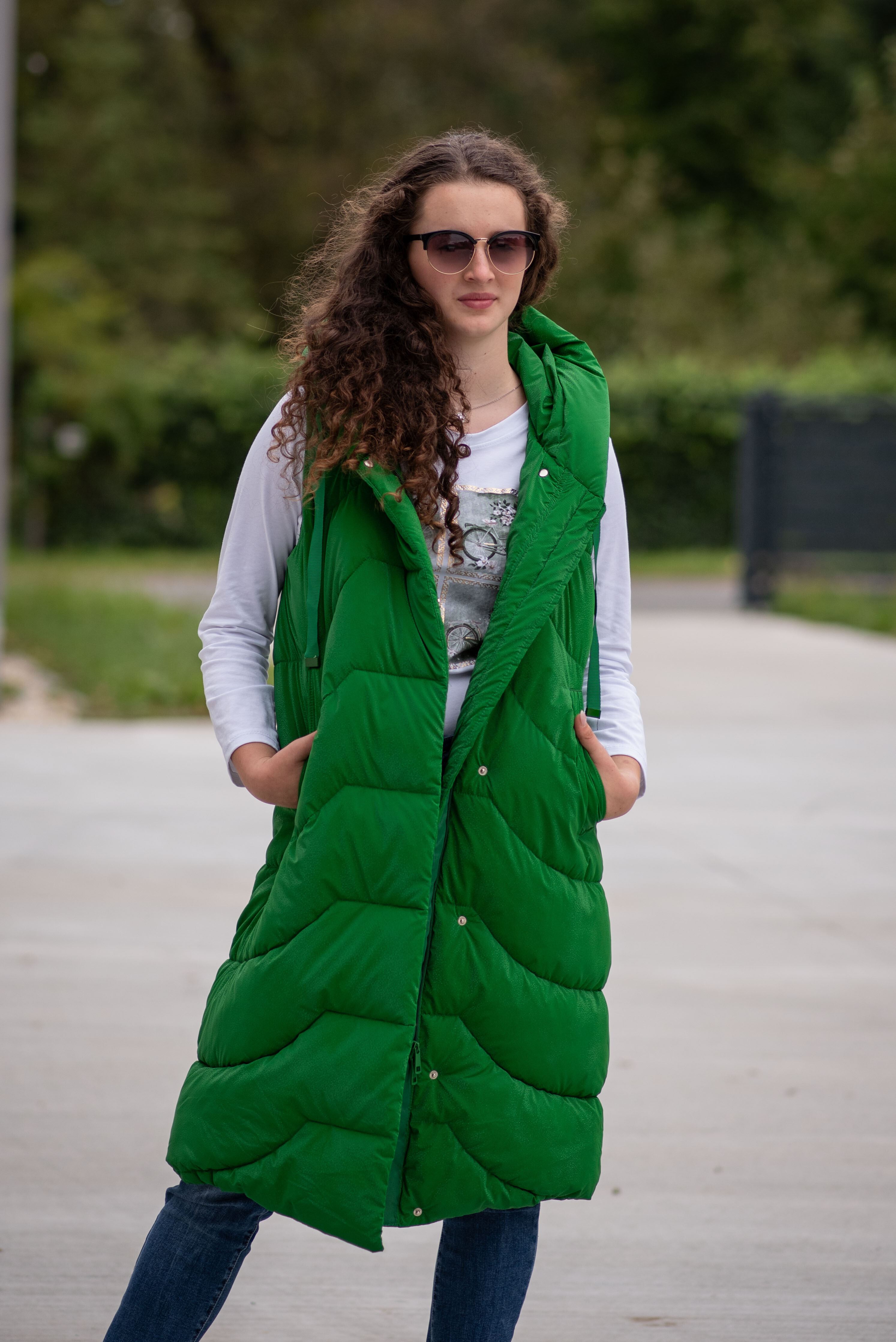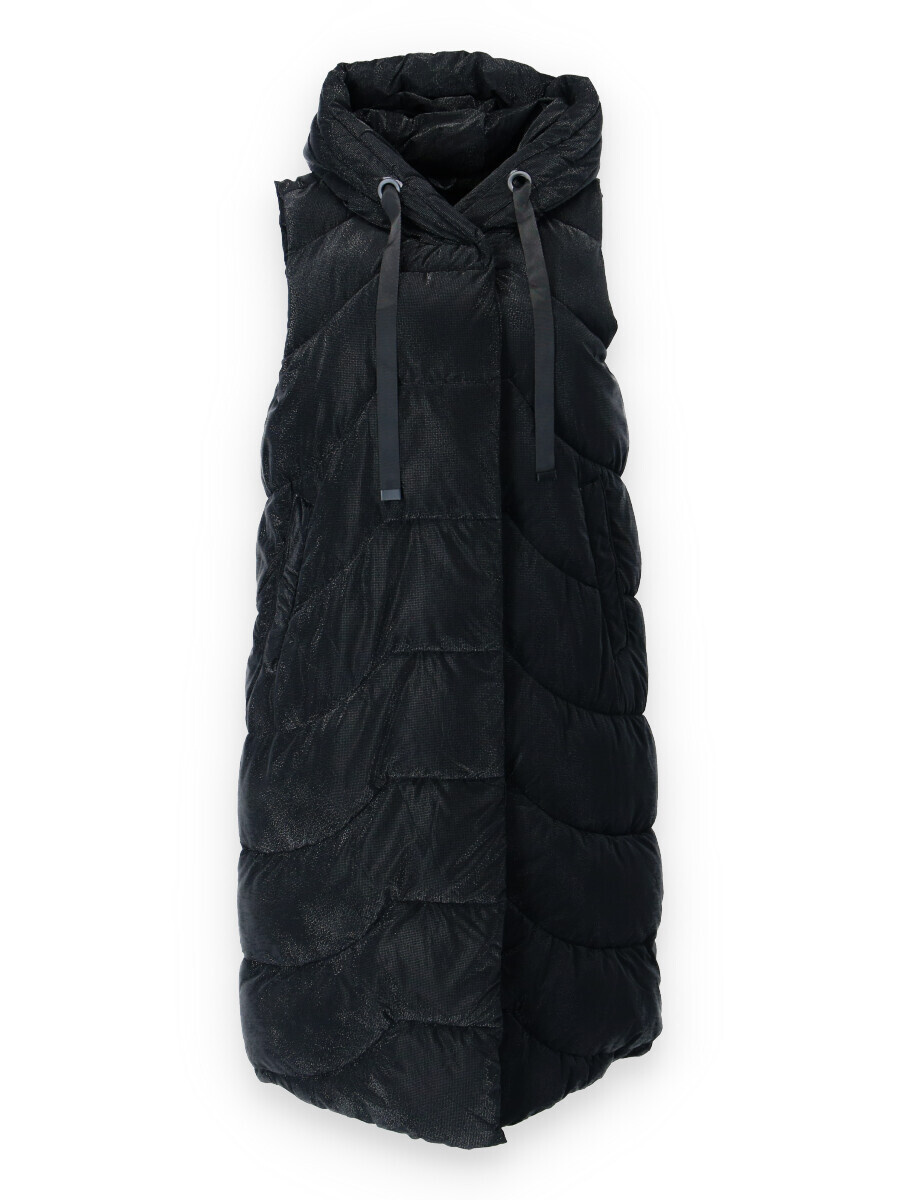 Dlouhá zimní vesta s kapucí. Vesta má lesklý povrch a zapínání na druky. Dovoz Itálie