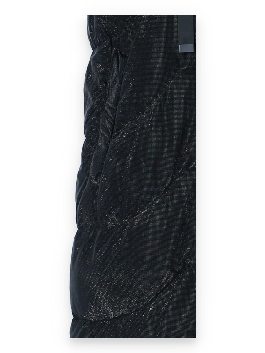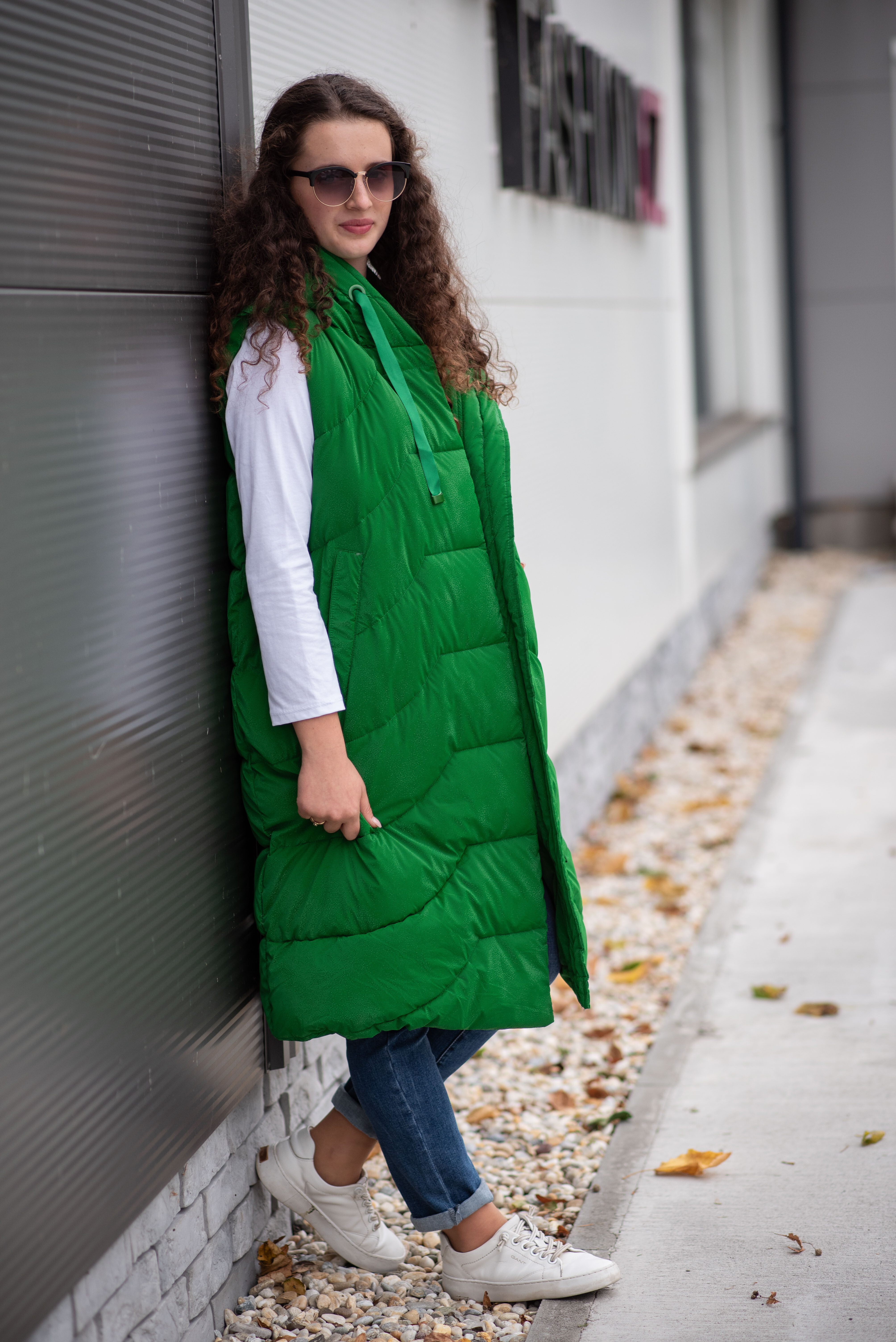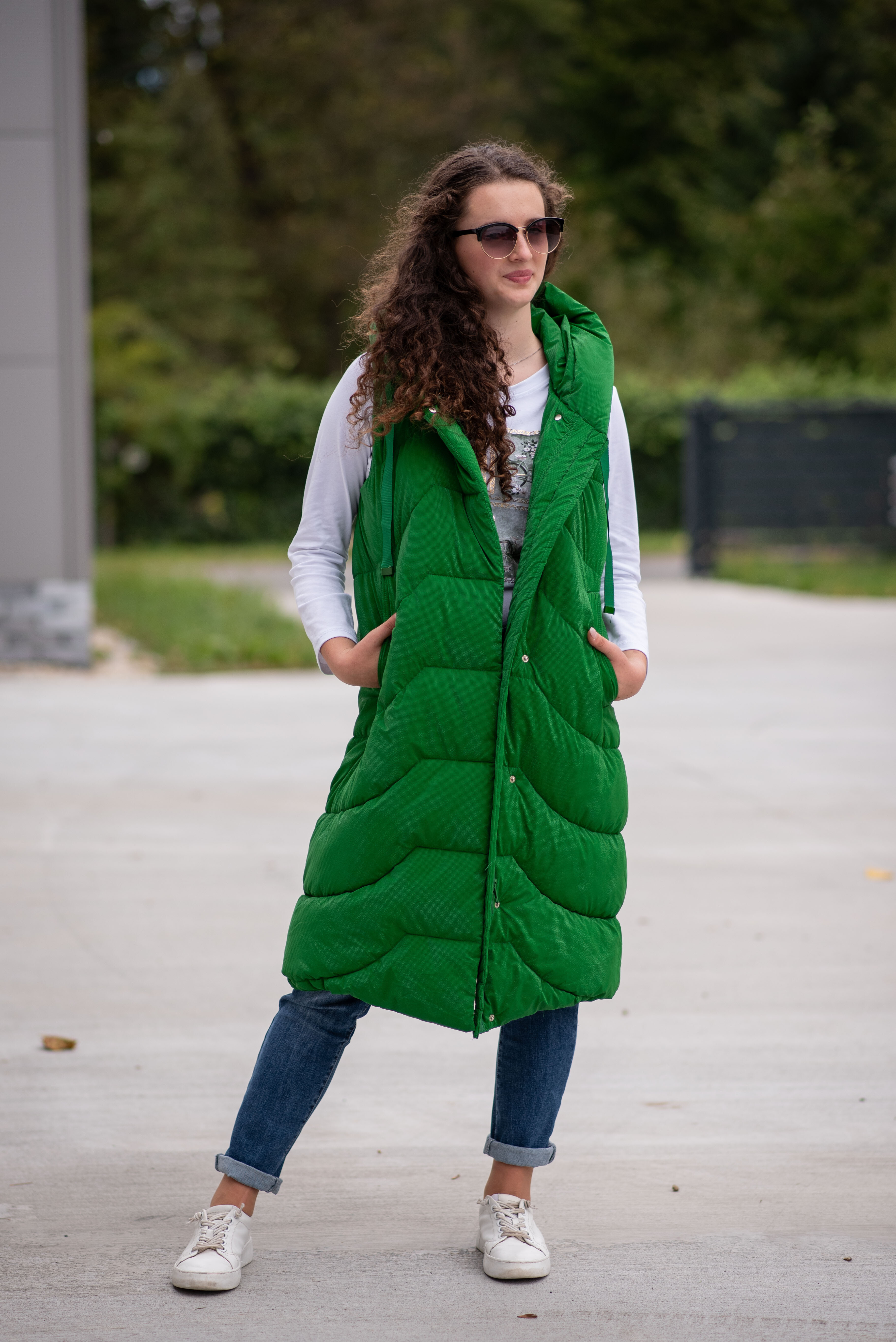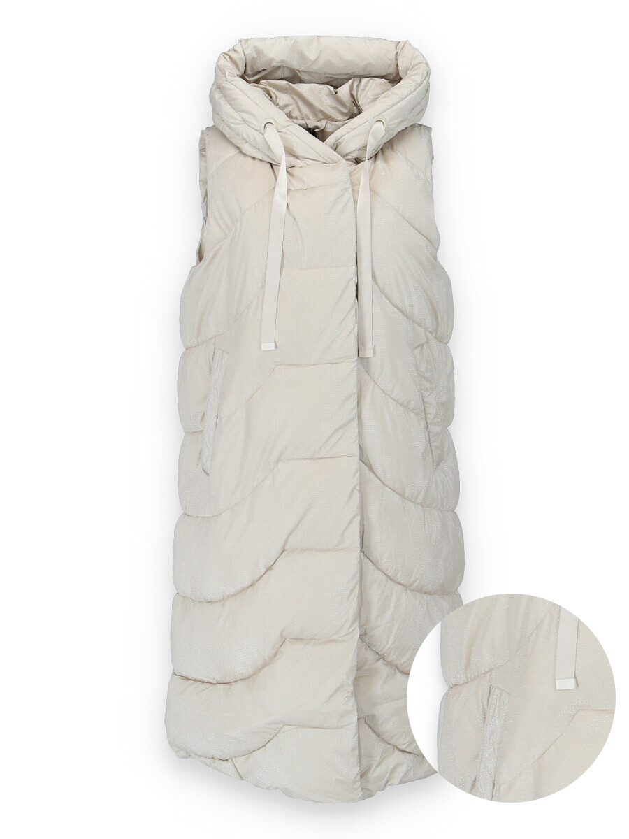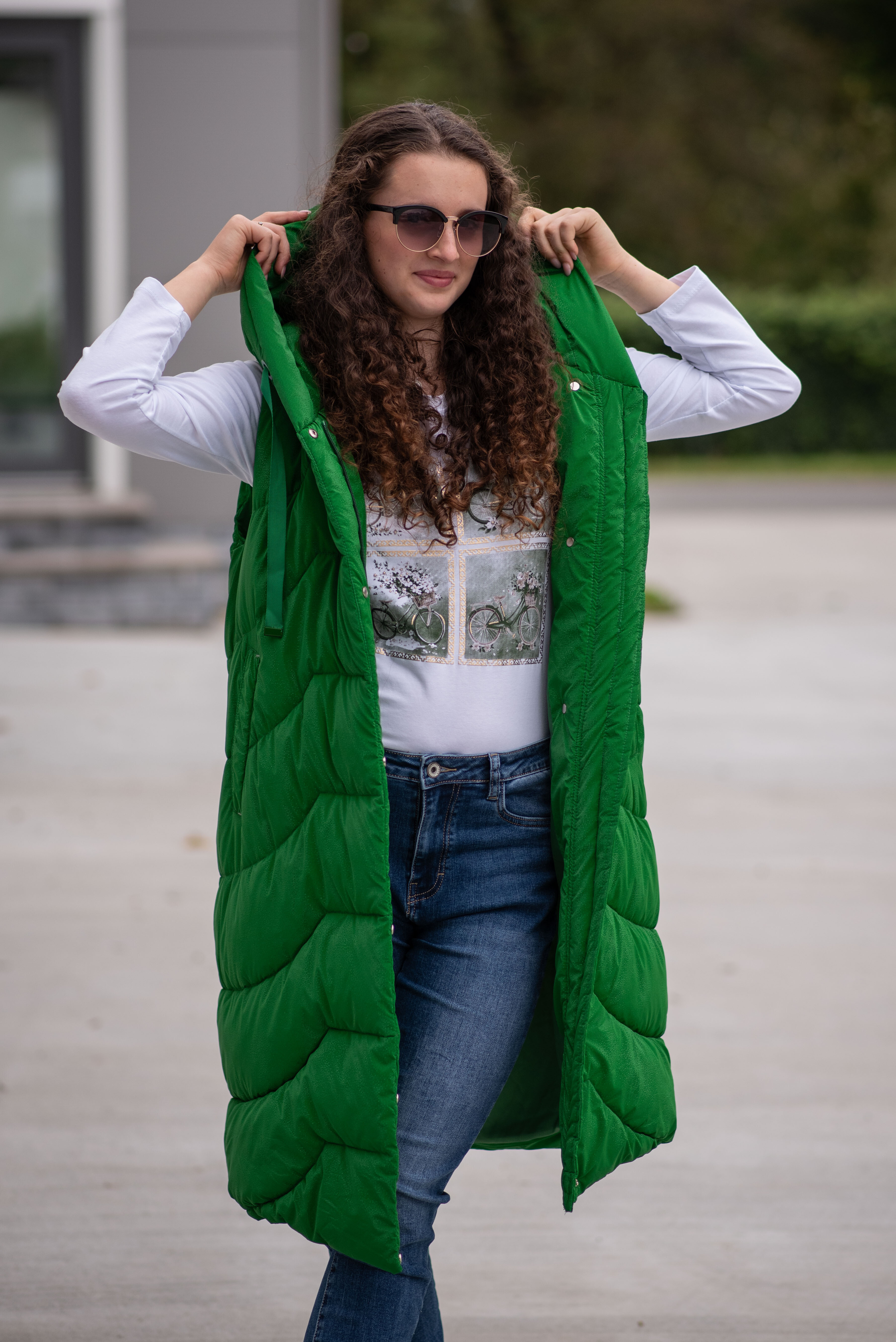 Dlouhá zimní vesta s kapucí. Vesta má lesklý povrch a zapínání na druky. Dovoz Itálie