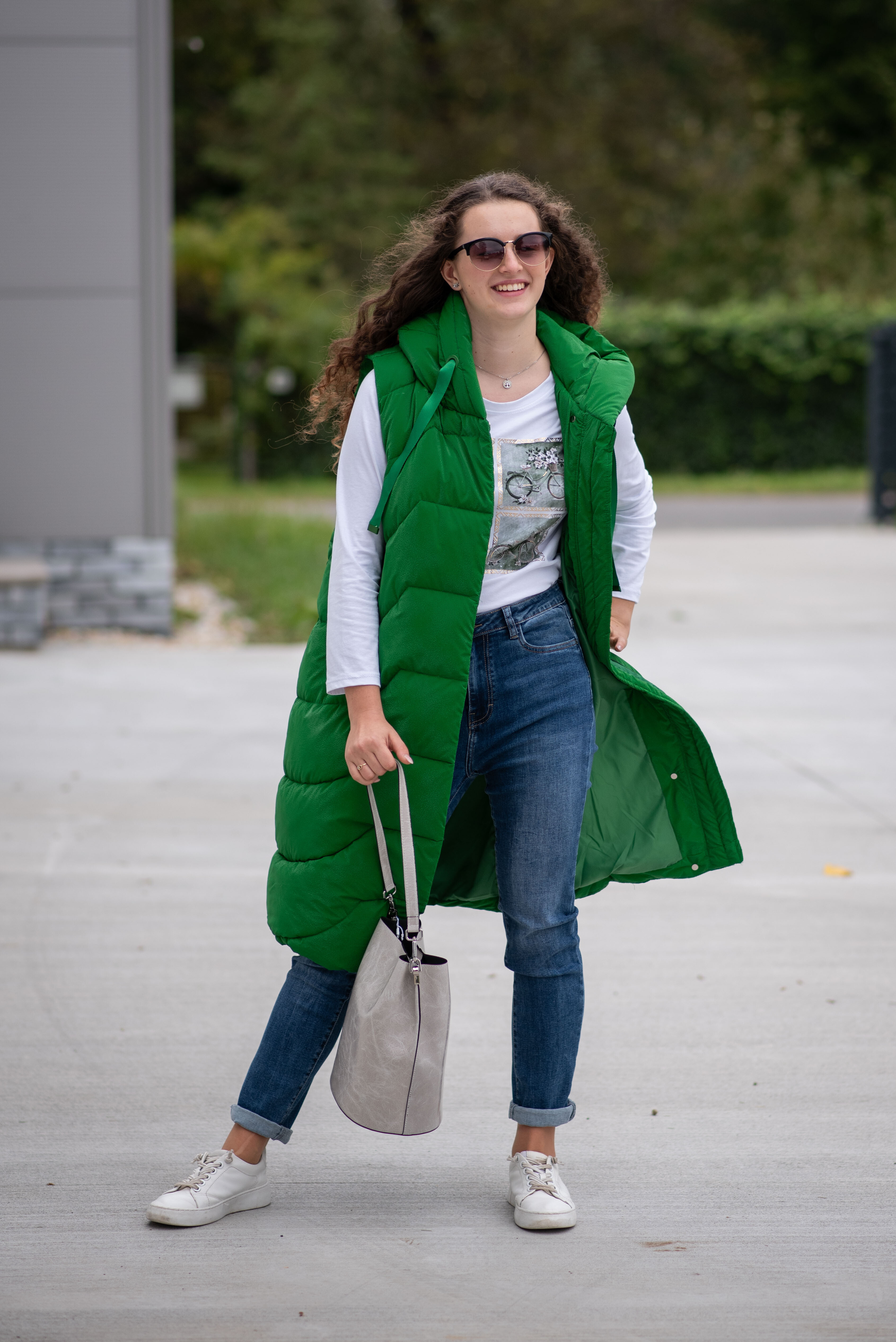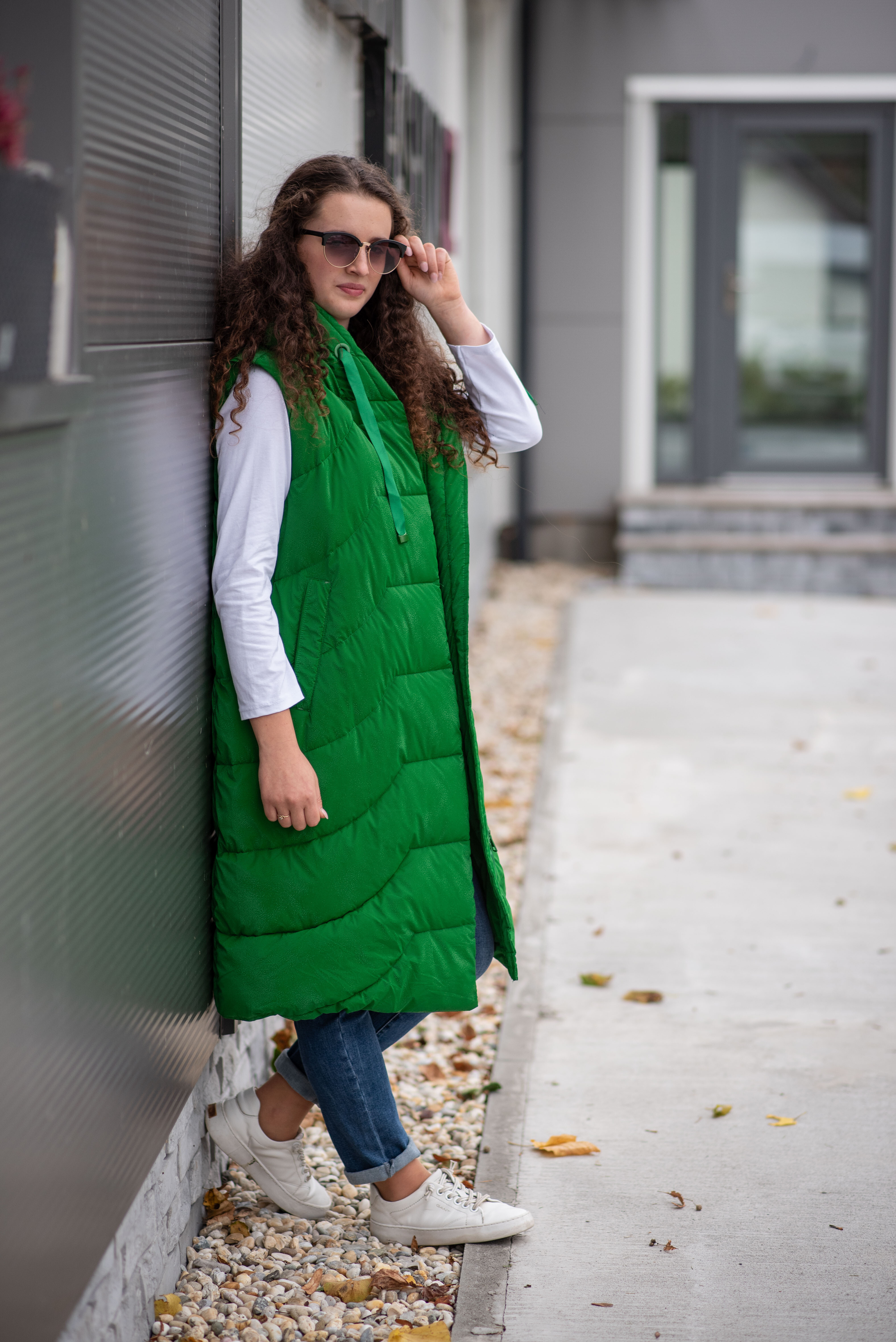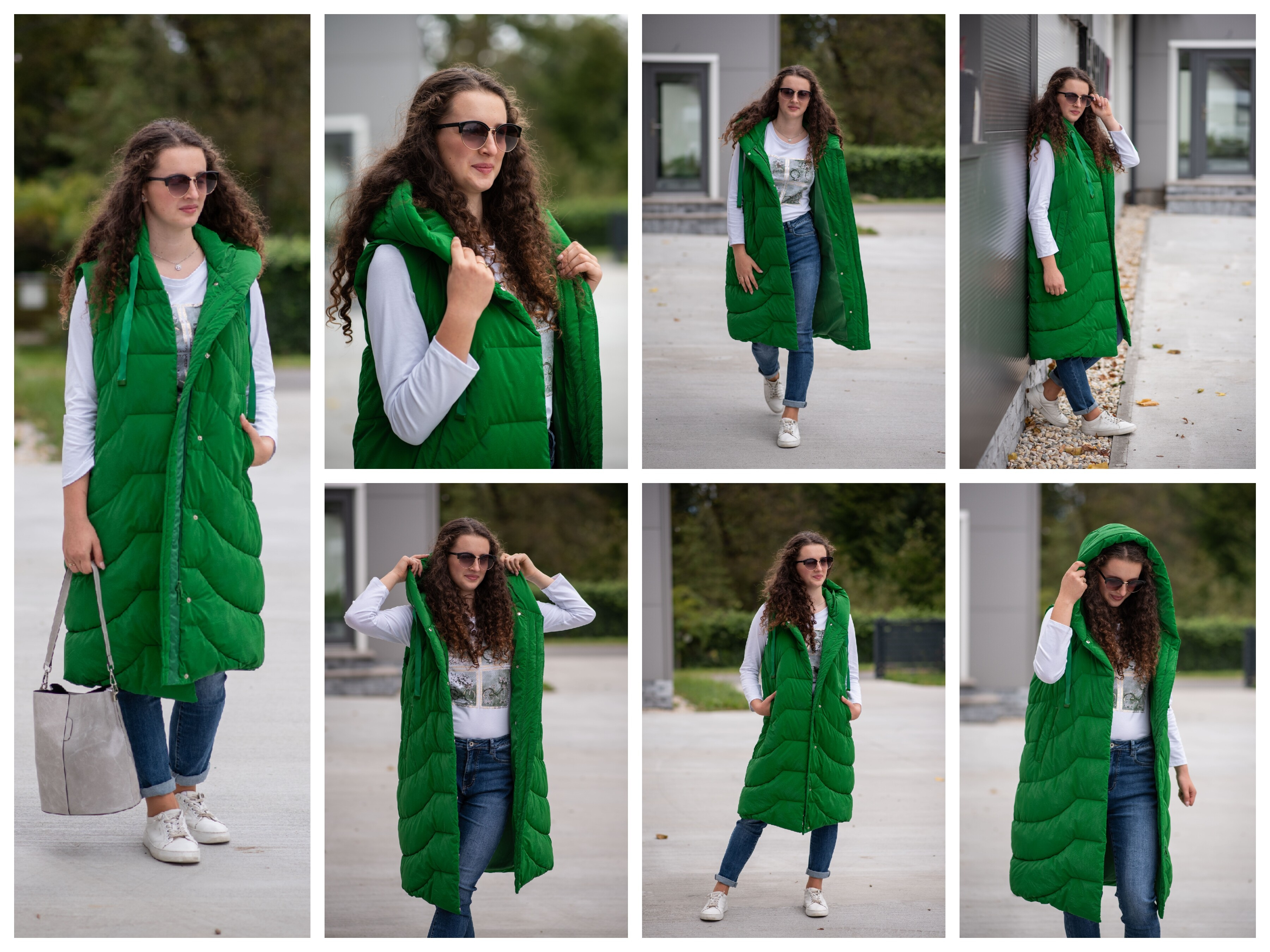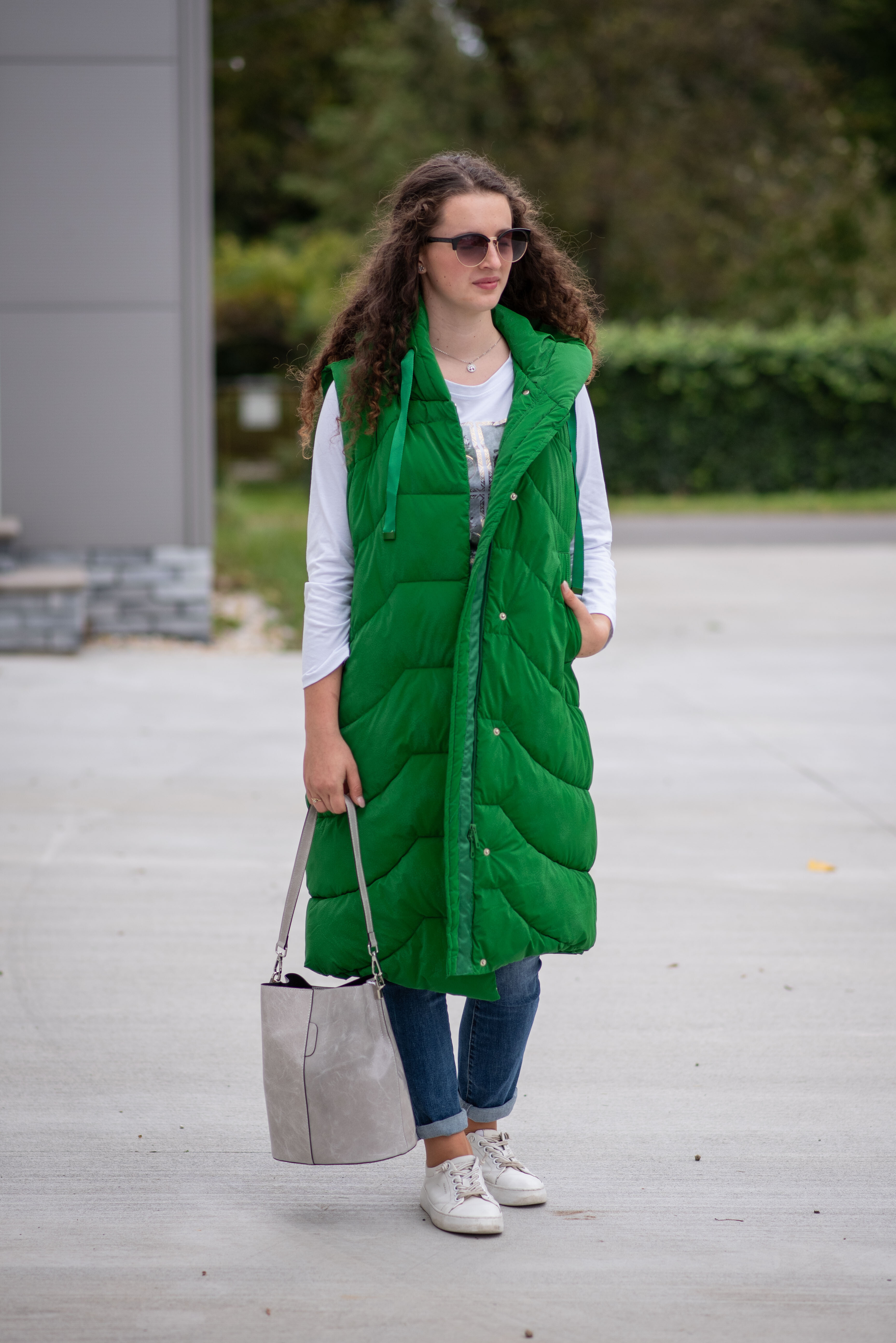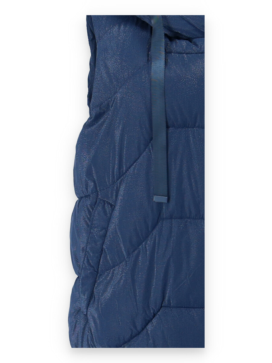 Dlouhá zimní vesta s kapucí. Vesta má lesklý povrch a zapínání na druky. Dovoz Itálie