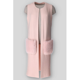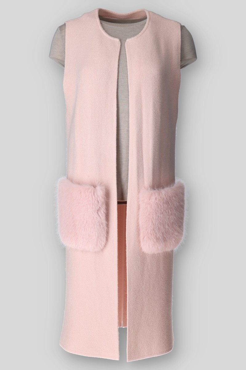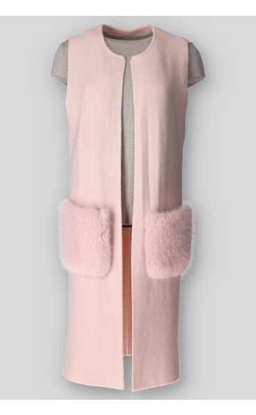Dlouhá vesta z hrubého úpletu. Trendy kousek s aplikací kožešiny na kapsách. Vyrobeno v Itálii