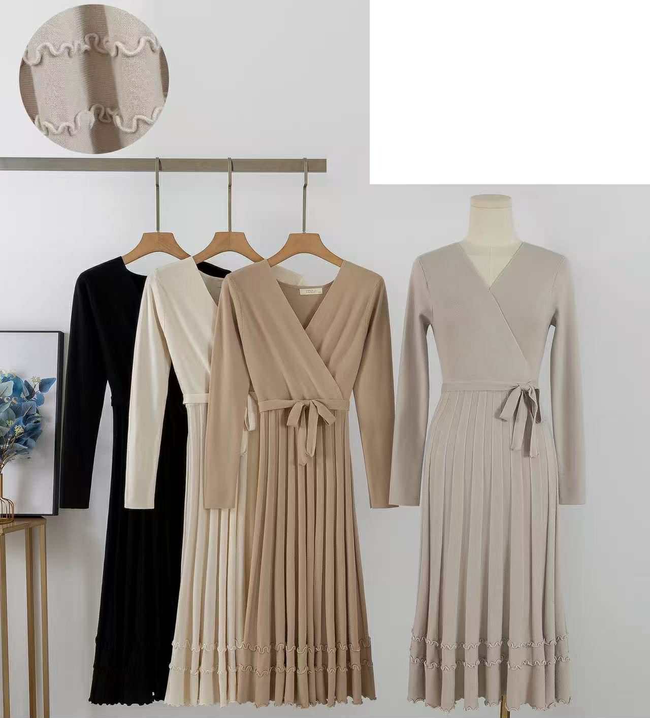 Elegantní dlouhé úpletové šaty. Šaty jsou přes prsa překládané s vázáním v pase. Spodní část je áčkového plisé střihu.