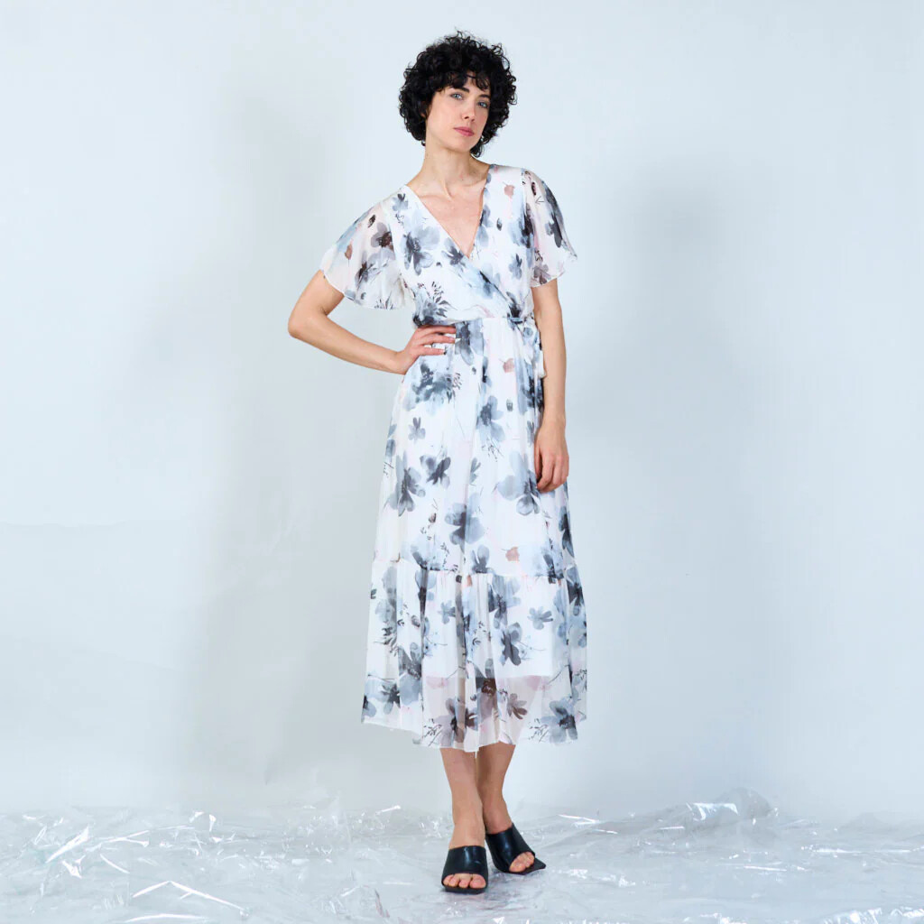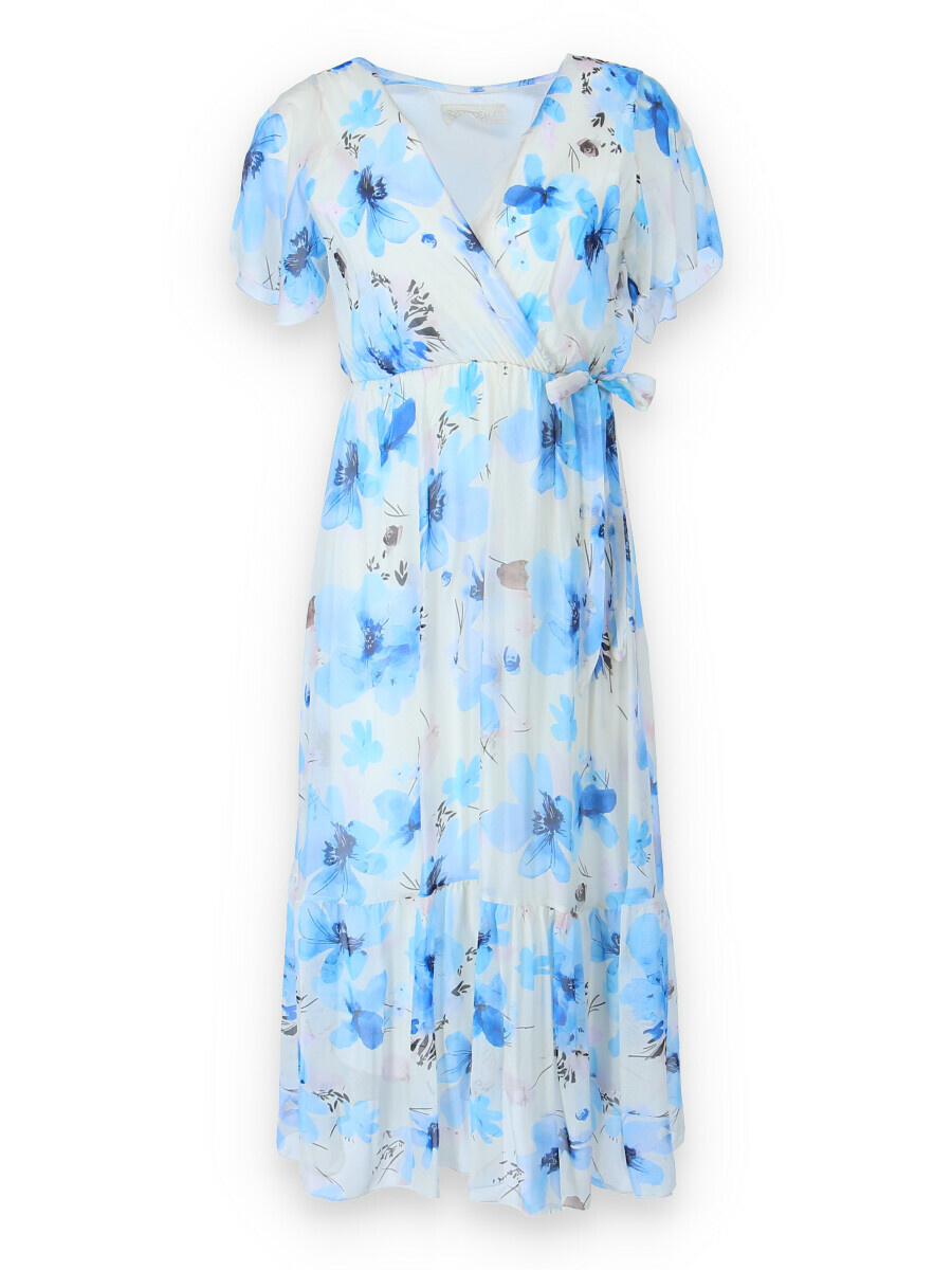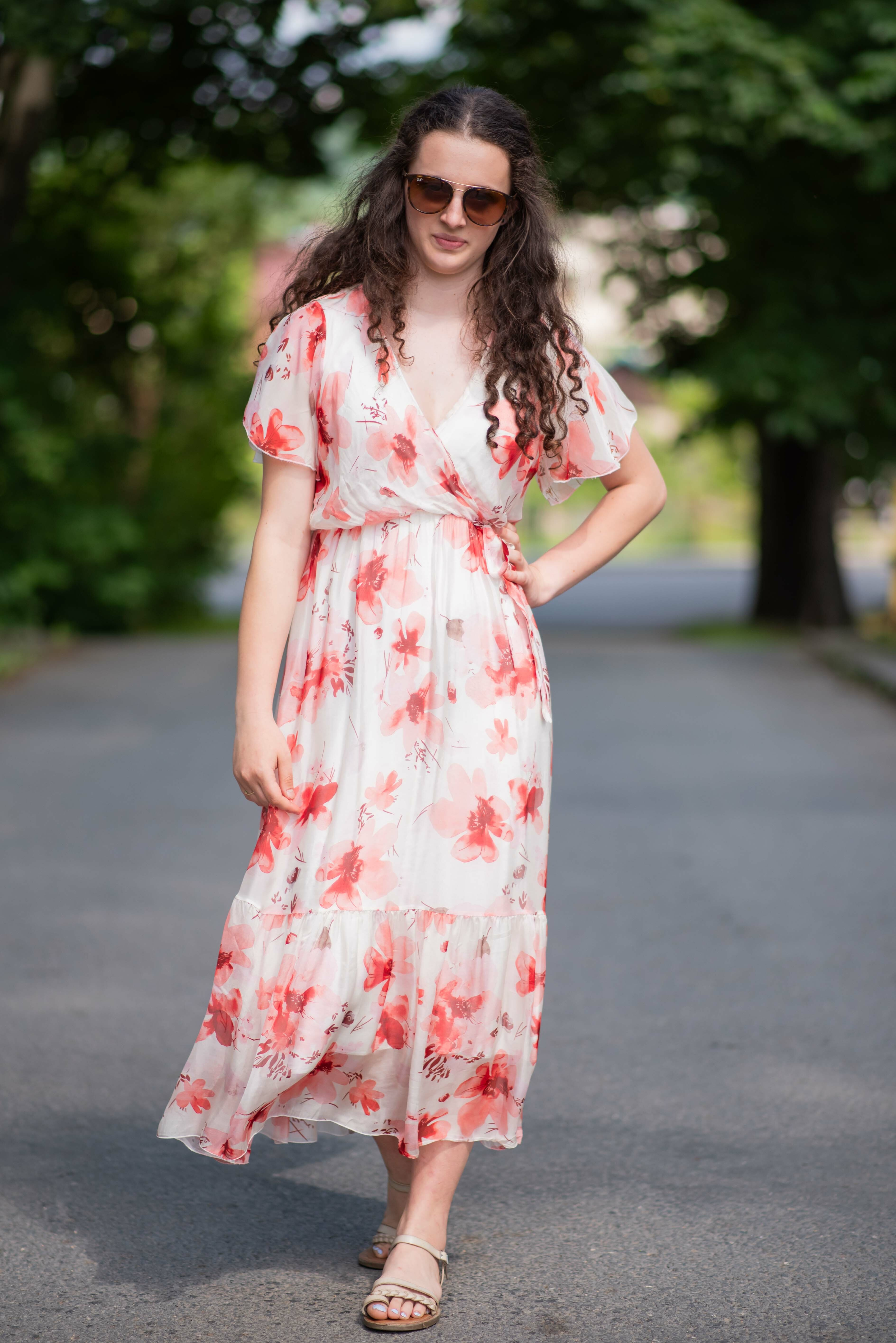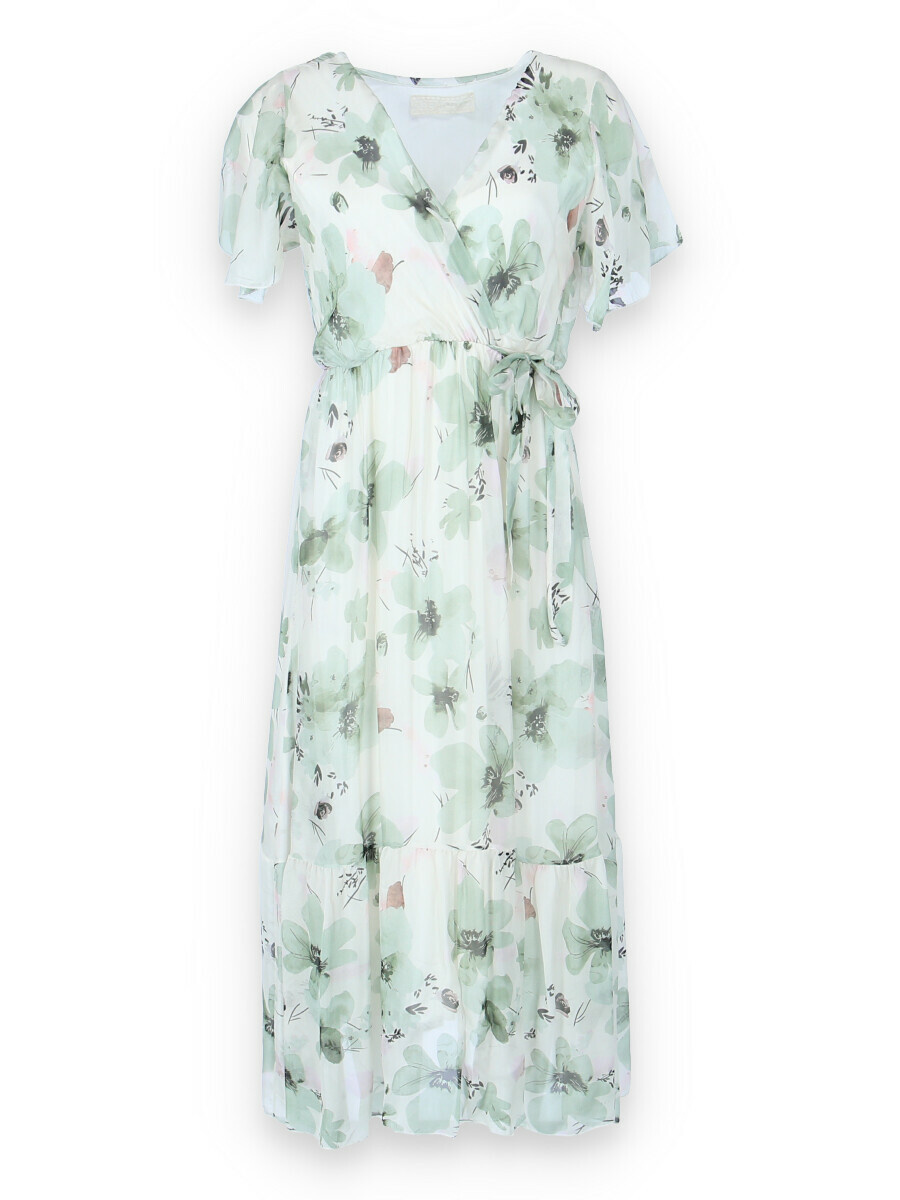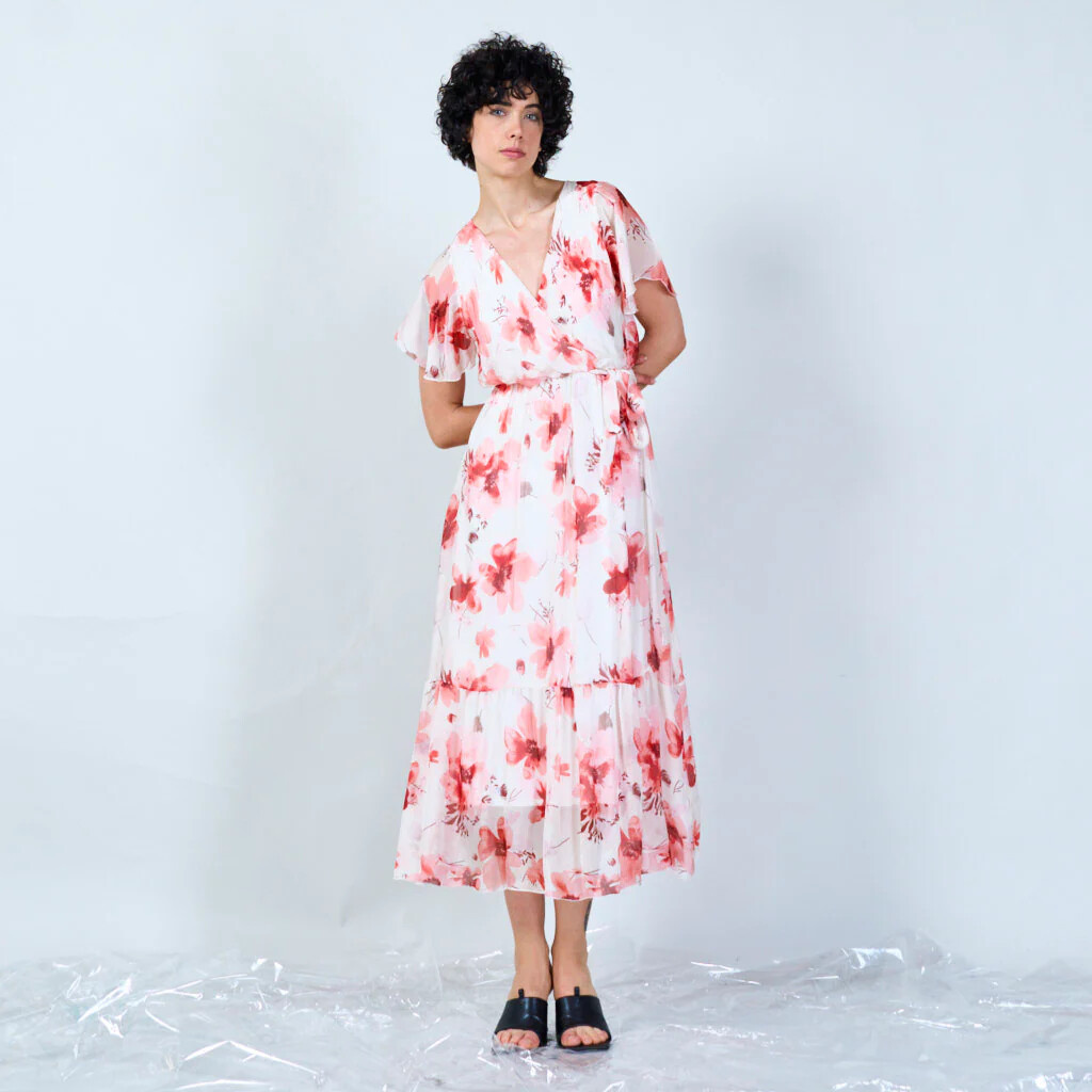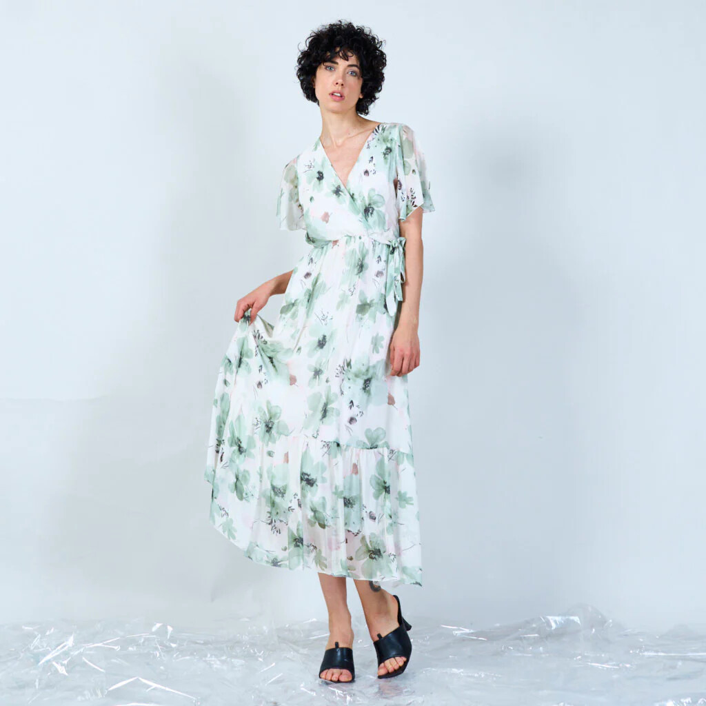 Elegantní dlouhé hedvábné šaty s potiskem a krátkým rukávem. V oblasti výstřihu překlad, s možnosti uvázání v pase.