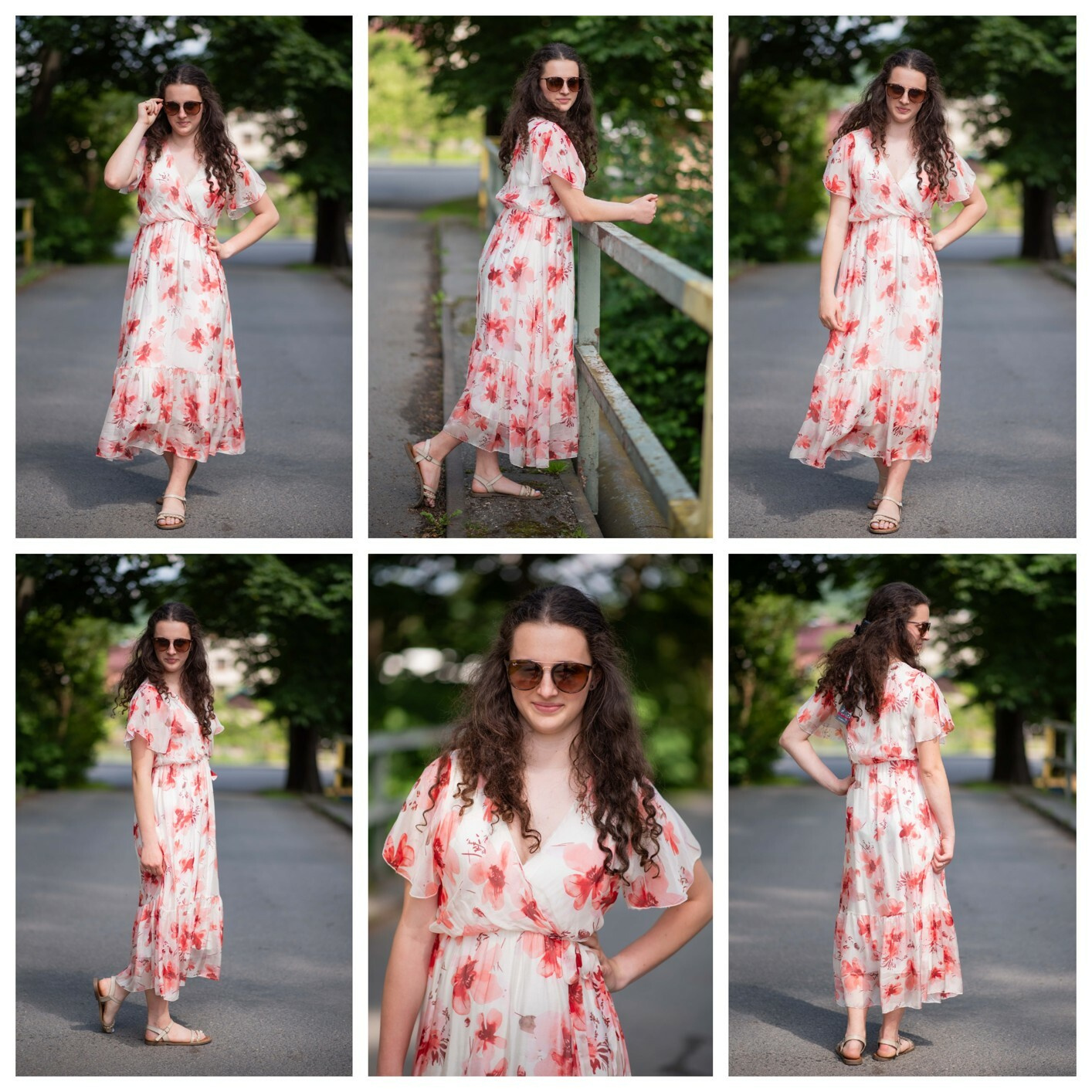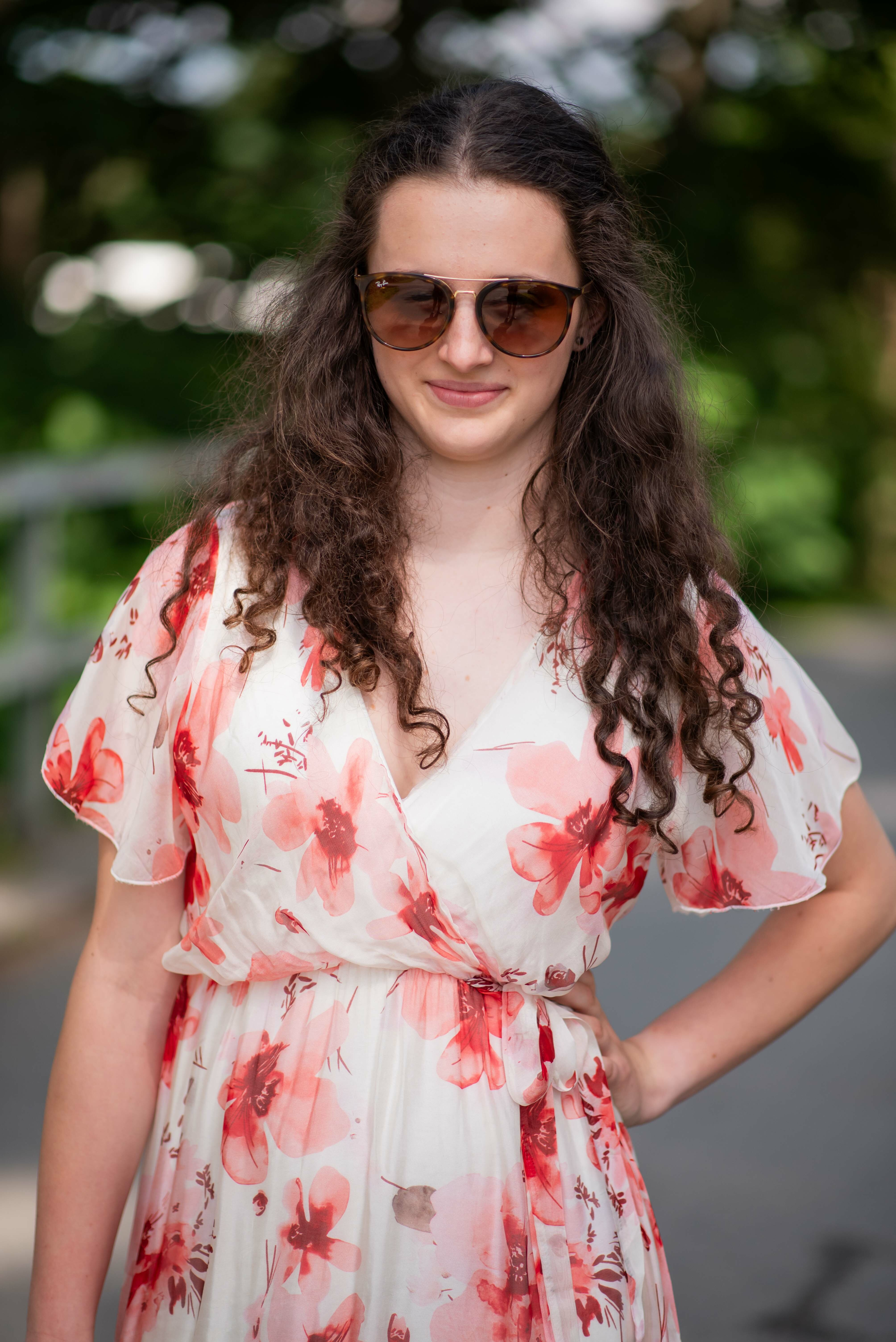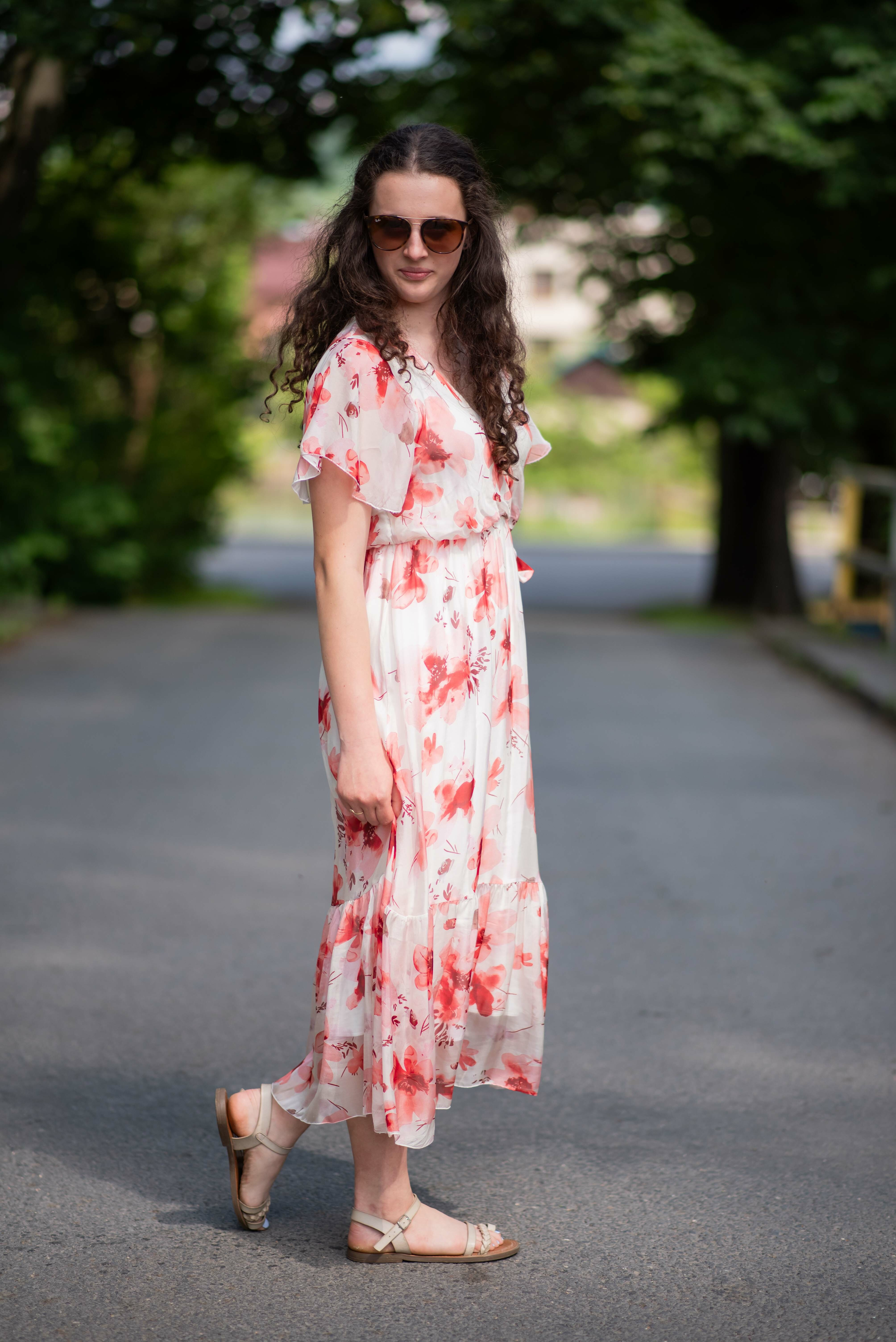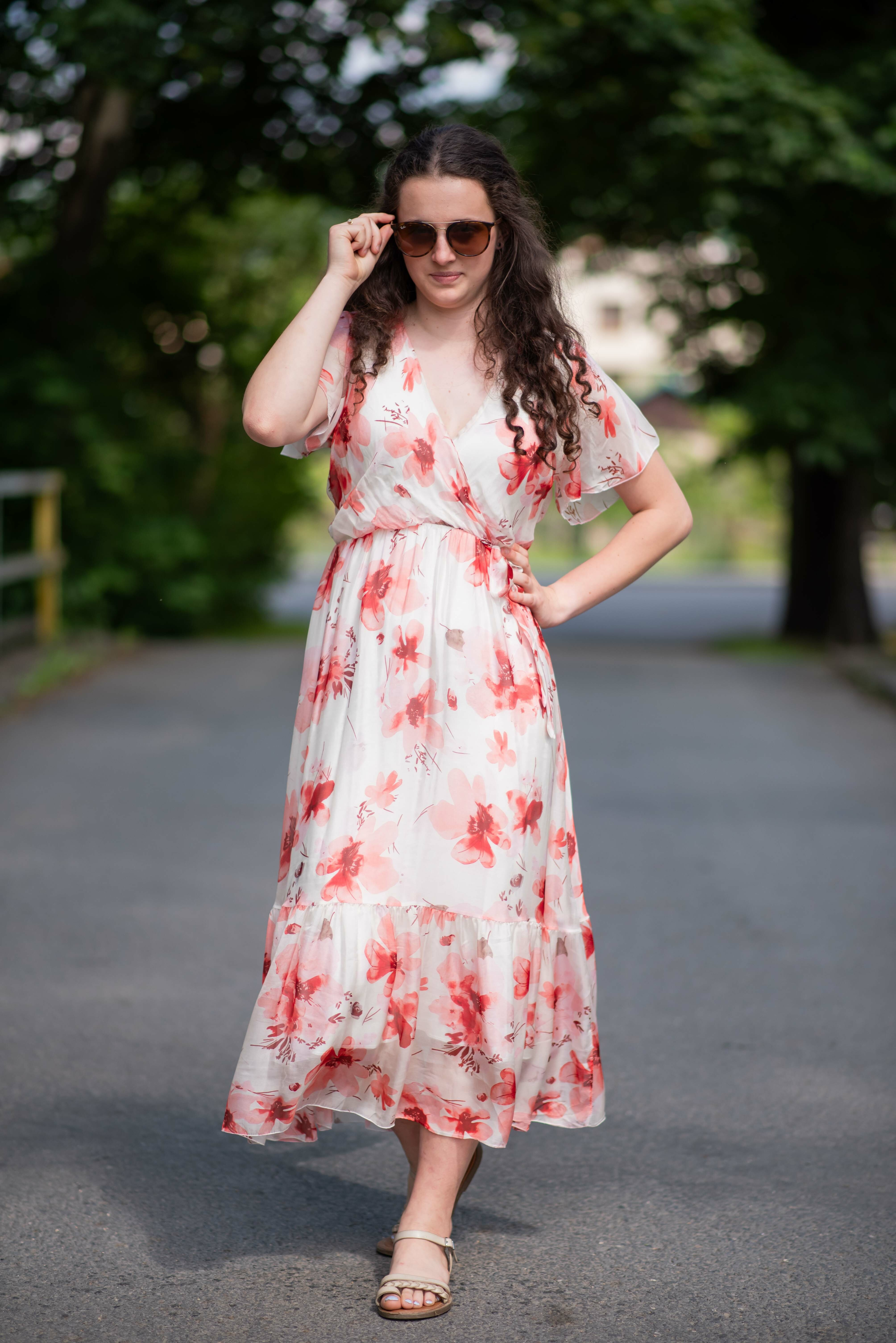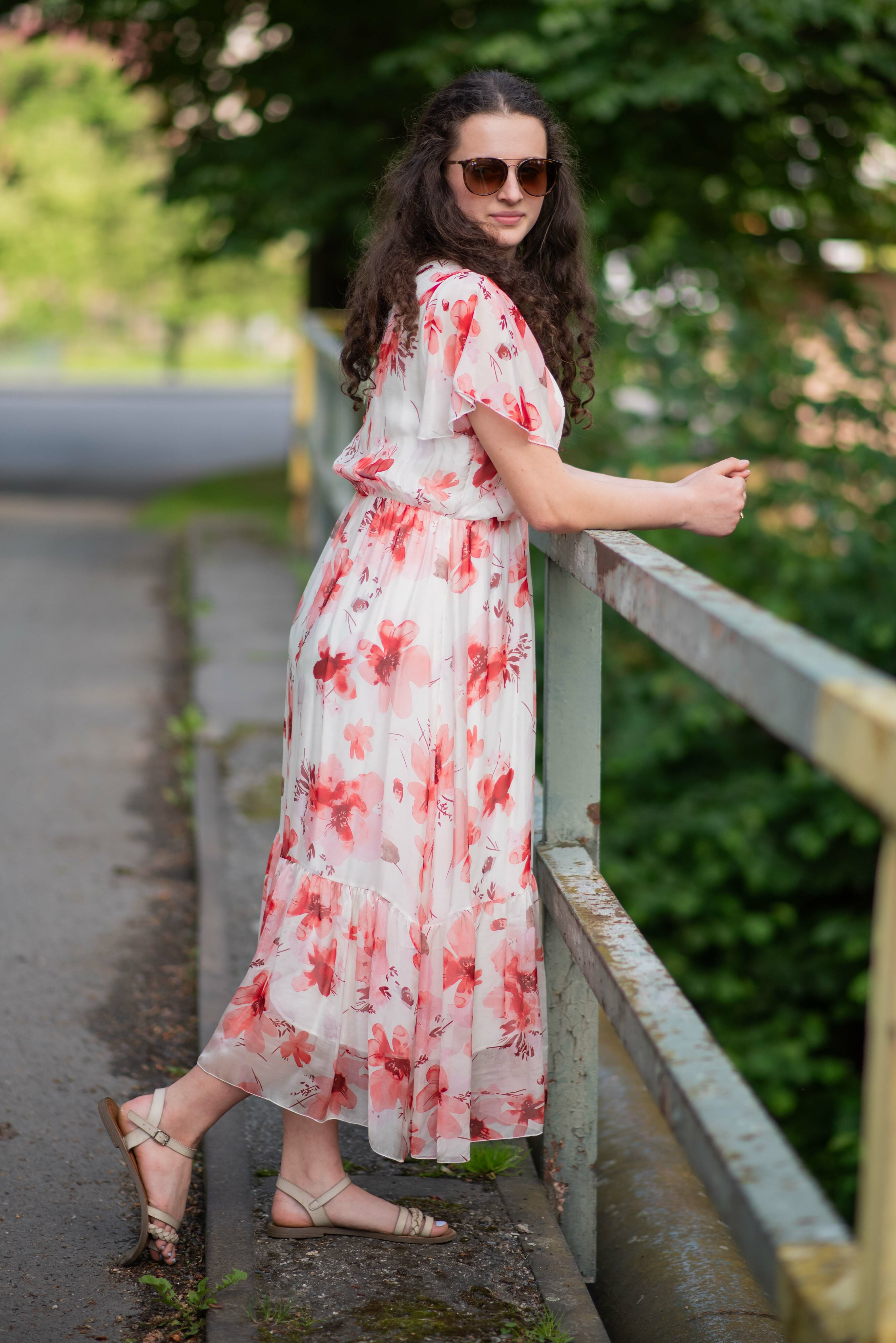 Elegantní dlouhé hedvábné šaty s potiskem a krátkým rukávem. V oblasti výstřihu překlad, s možnosti uvázání v pase.