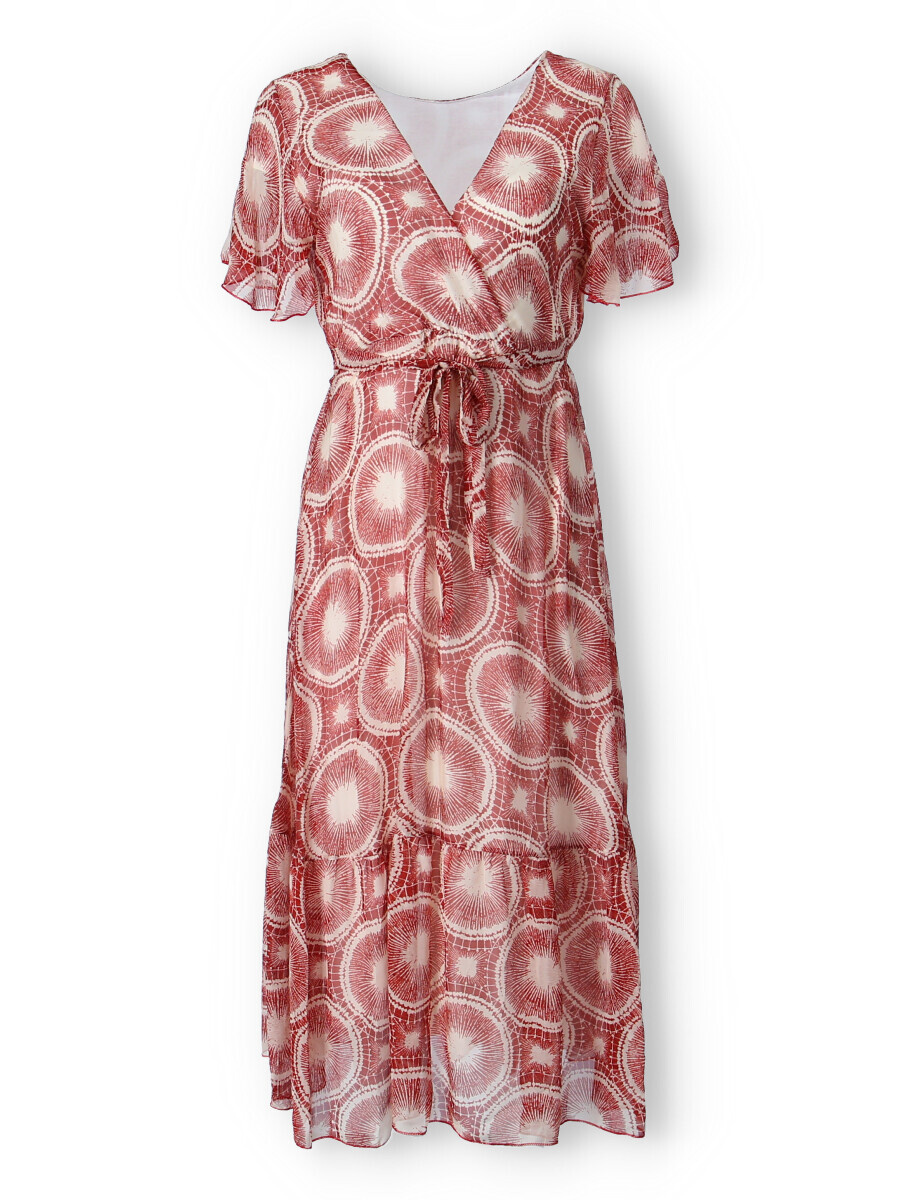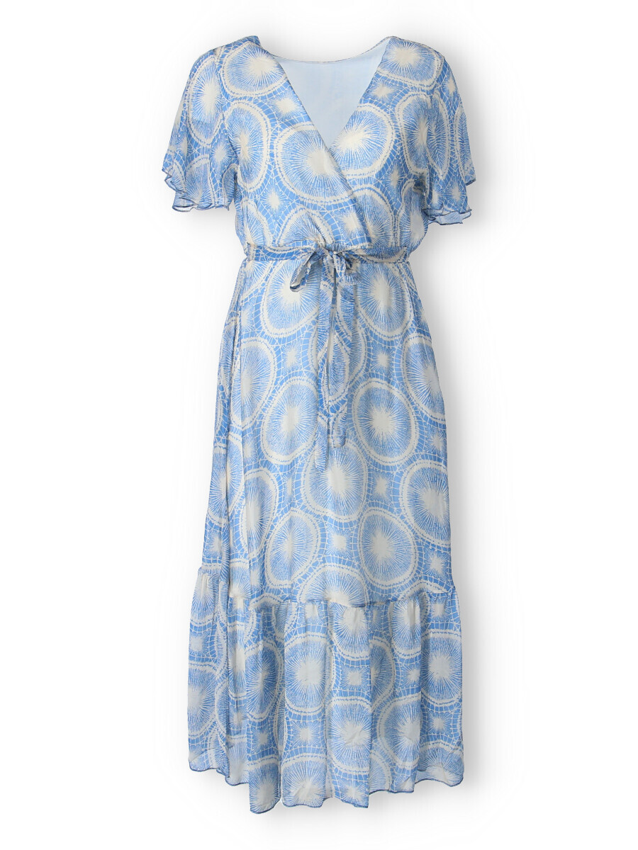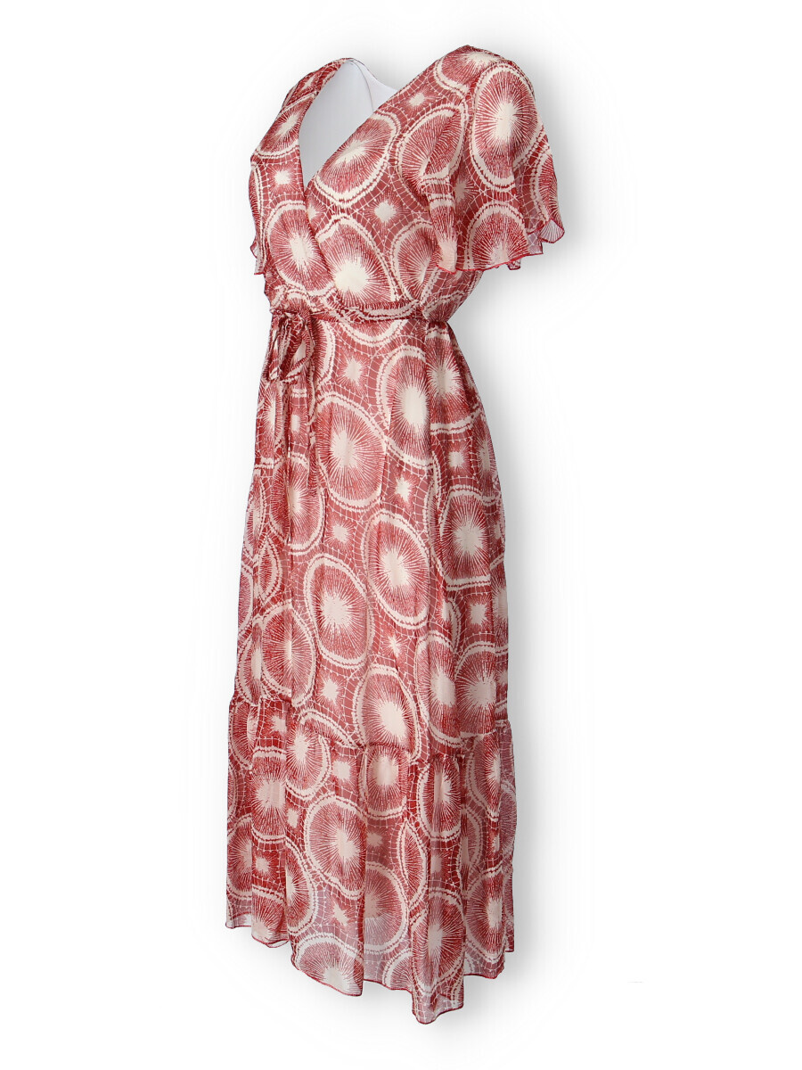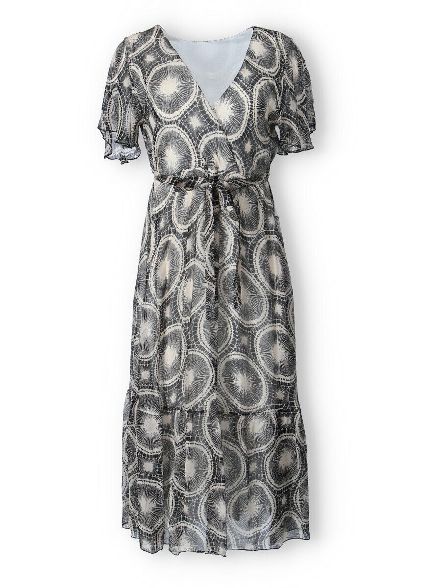 Elegantní dlouhé hedvábné šaty s krátkým rukávem, překládané přes prsa. Šaty jsou s potiskem, mají podšívku a v pase šňůrku na utažení.