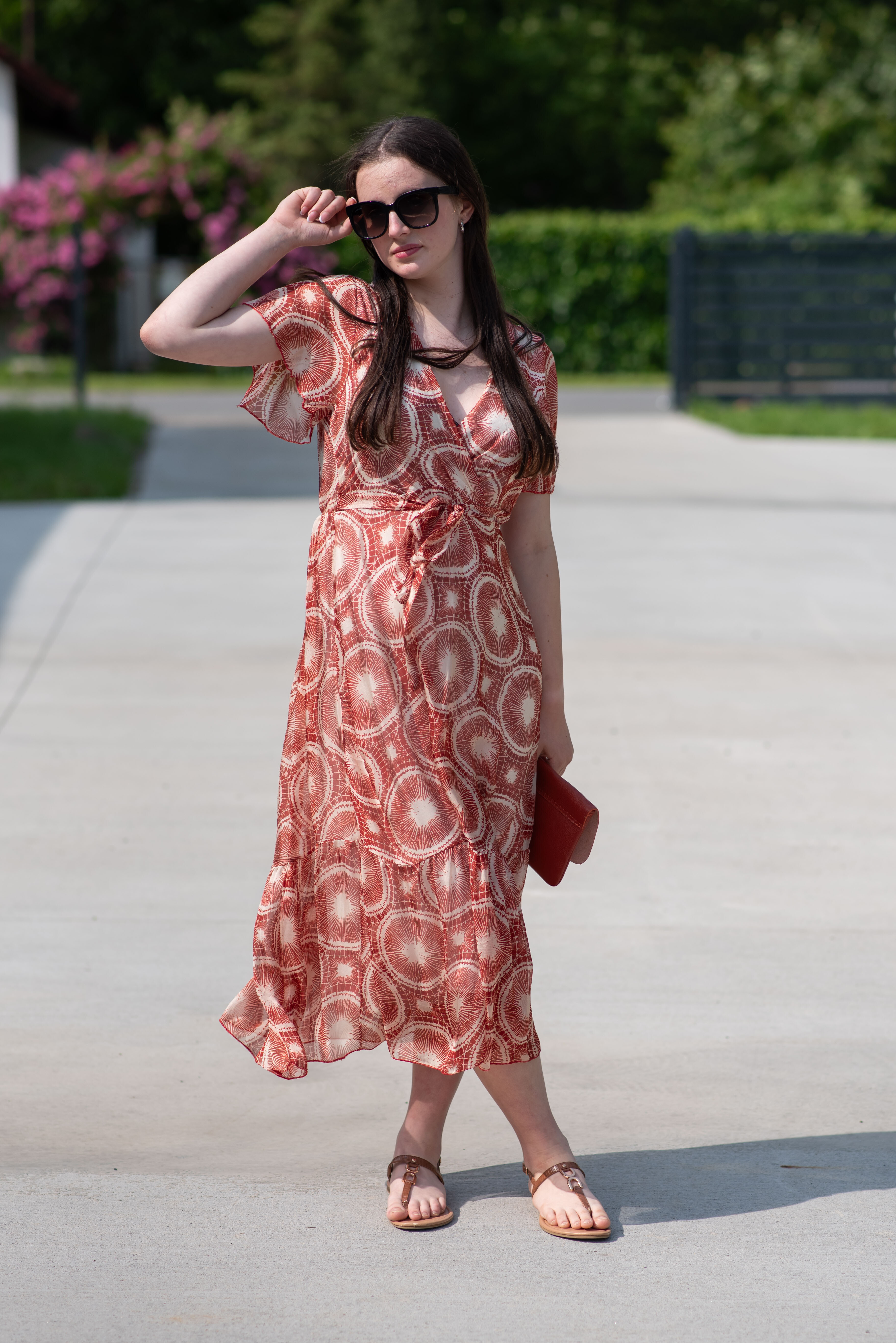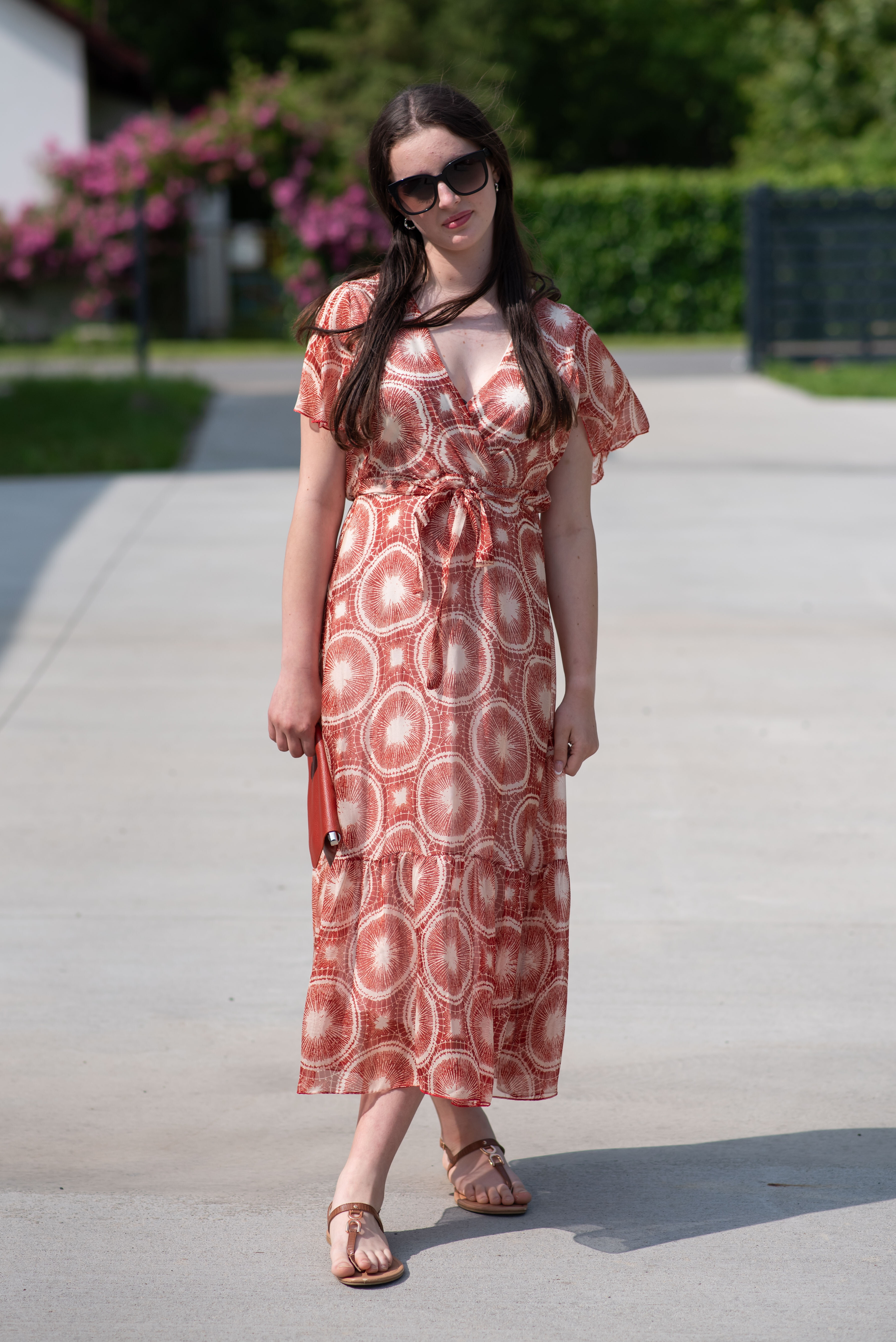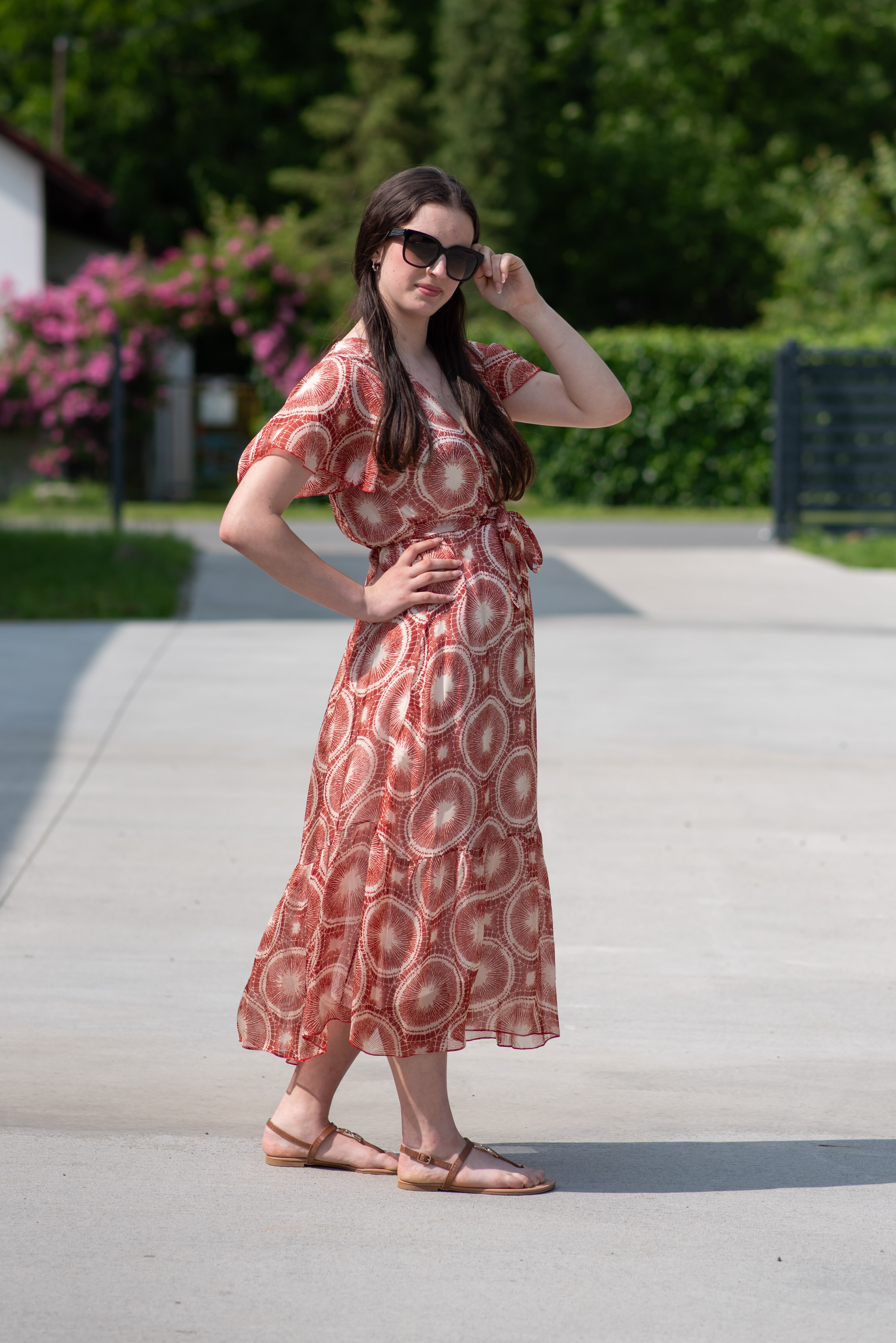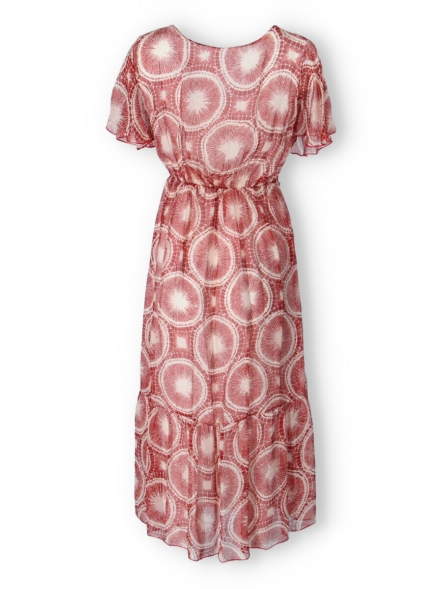 Elegantní dlouhé hedvábné šaty s krátkým rukávem, překládané přes prsa. Šaty jsou s potiskem, mají podšívku a v pase šňůrku na utažení.