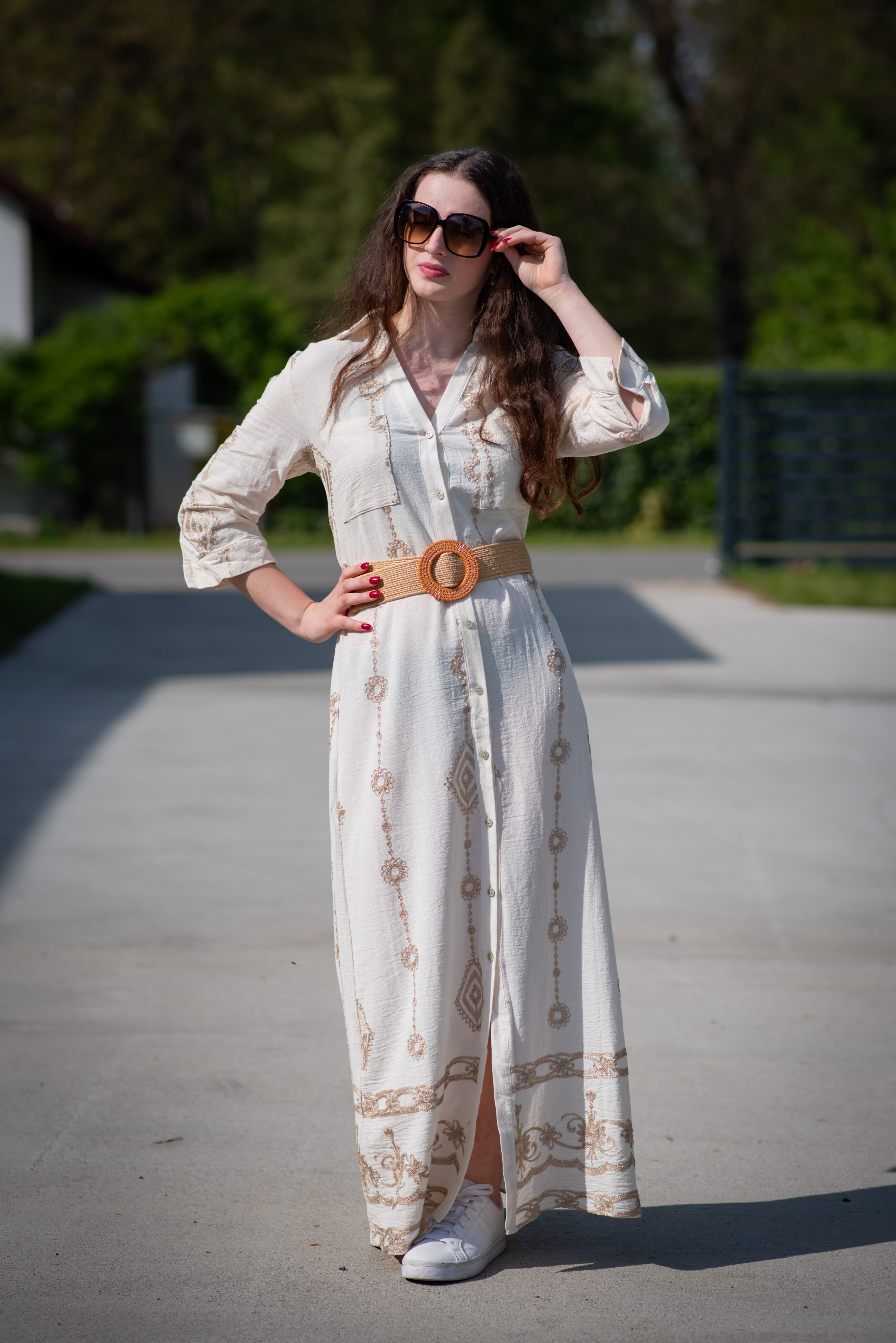 Dámské dlouhé košilové šaty s límečkem. Šaty jsou celo propínací, v oblasti hrudníku našité kapsy, mají 3/4 rukáv a jsou doplněny páskem.