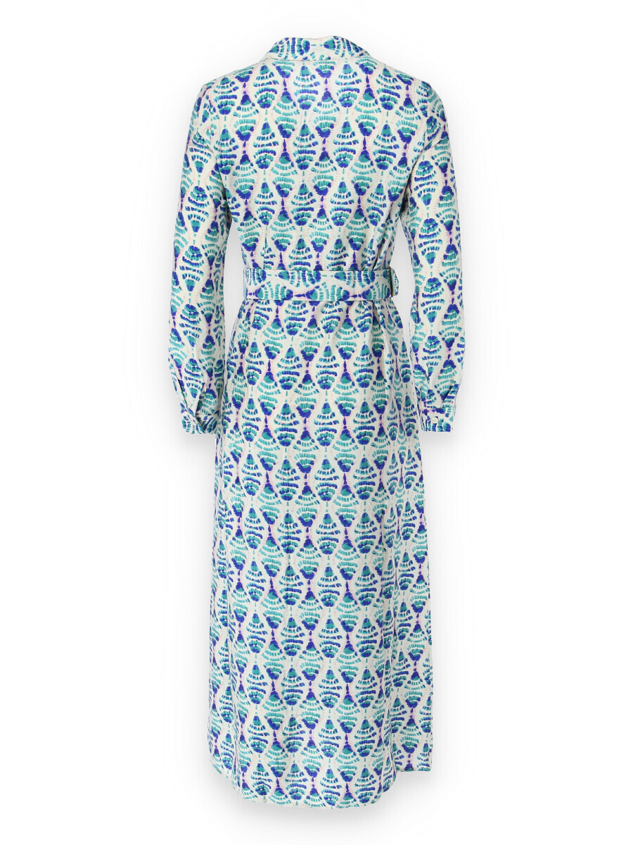 Dlouhé košilové šaty s potiskem. Šaty mají límeček, dlouhý rukáv, jsou celo propínací a doplněny páskem.