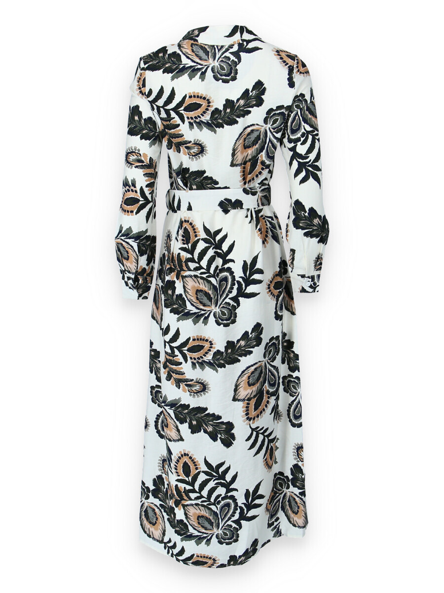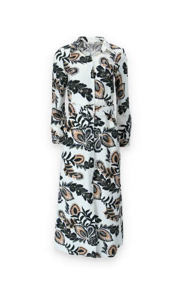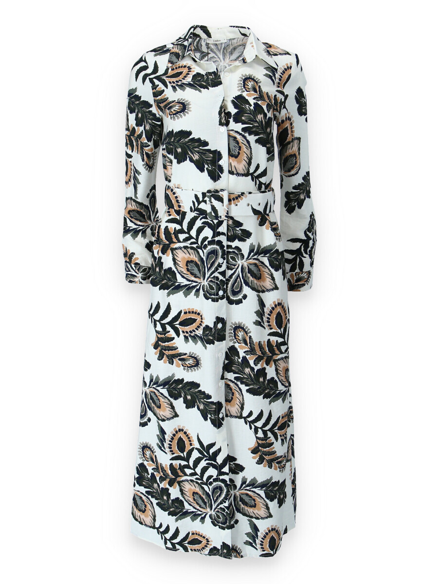 Dlouhé košilové šaty s potiskem. Šaty mají límeček, dlouhý rukáv, jsou celo propínací a doplněny páskem.