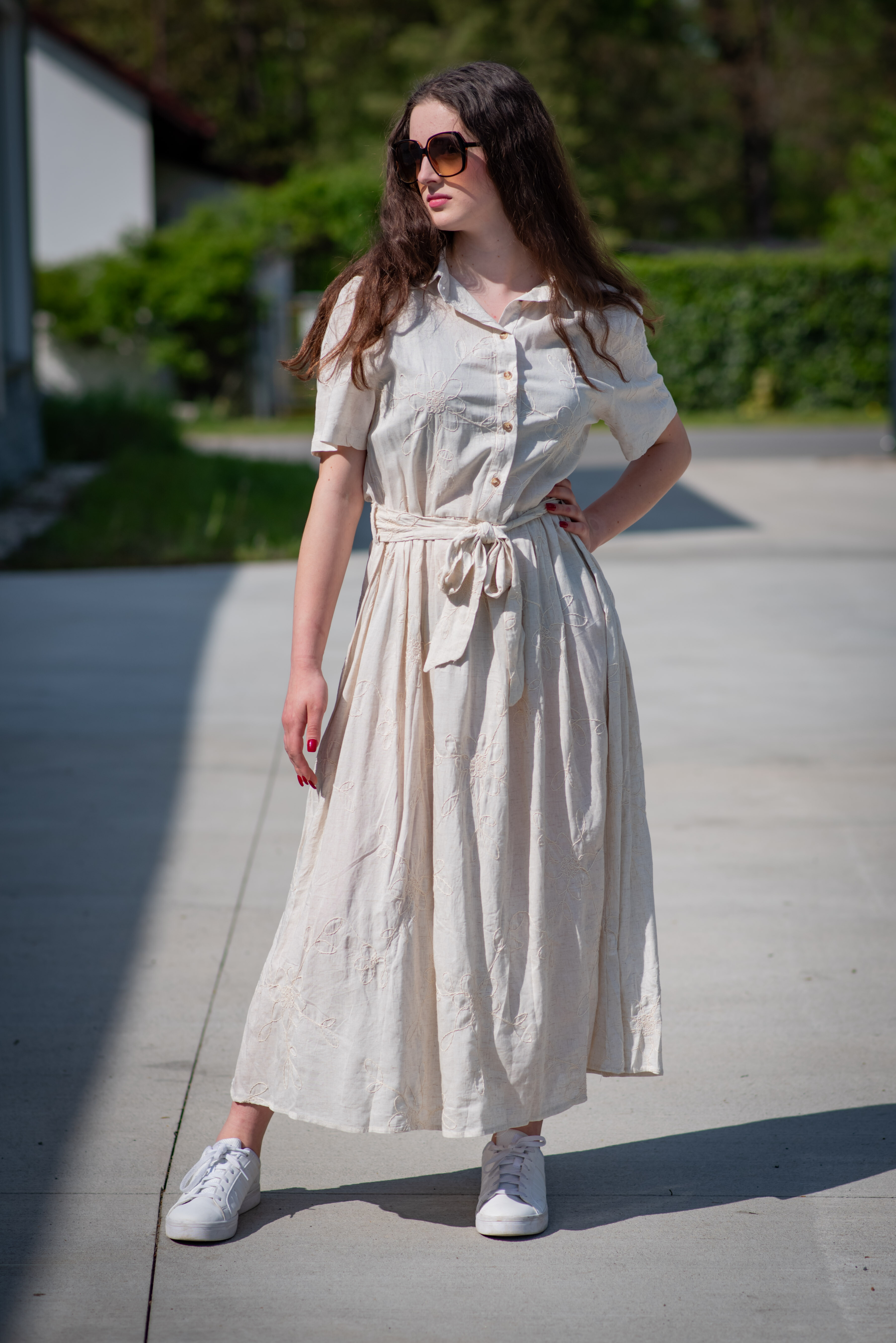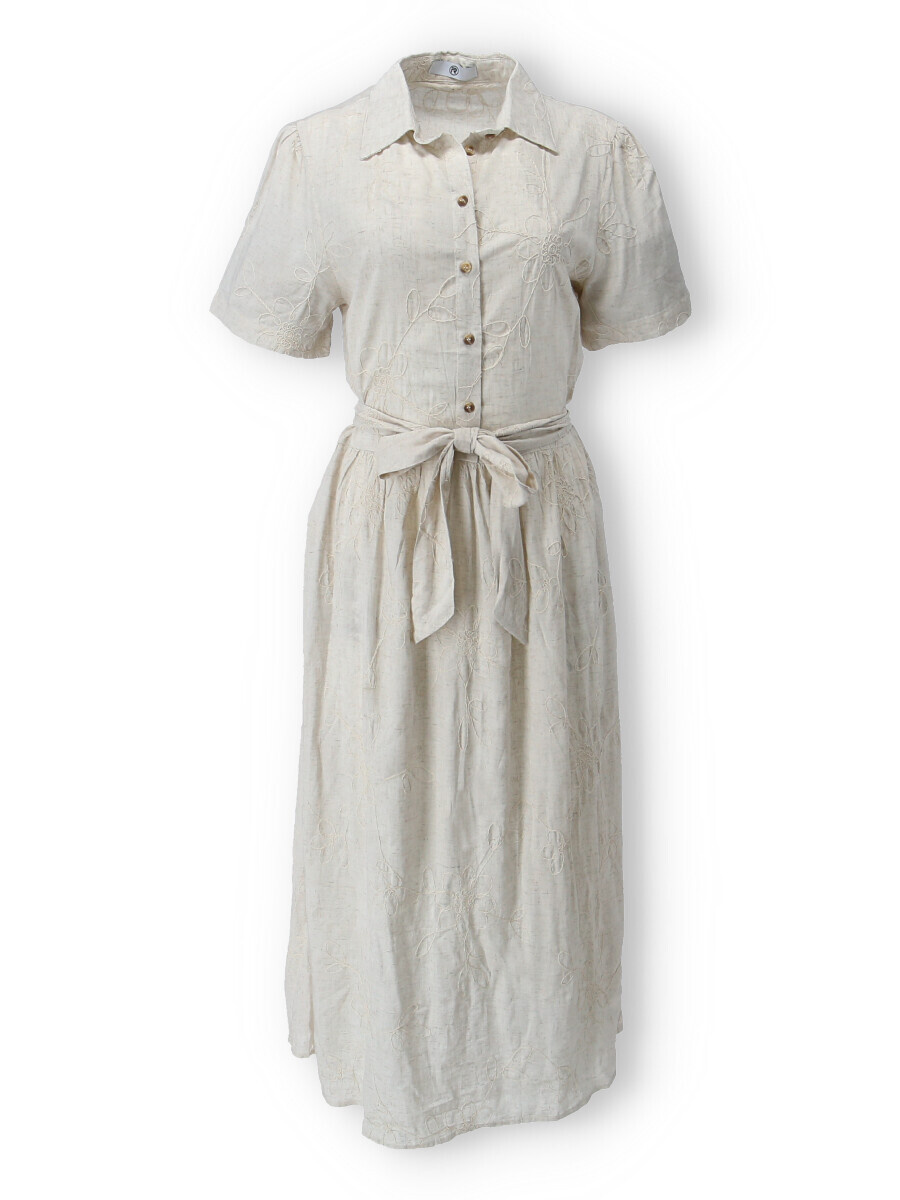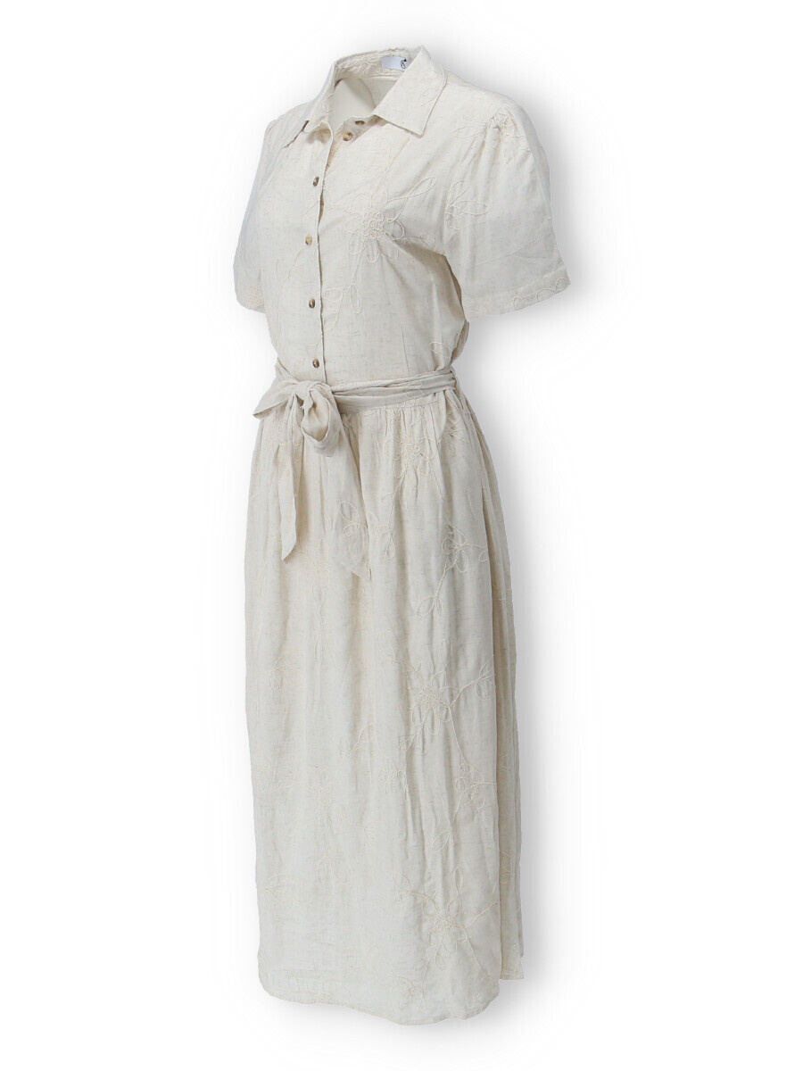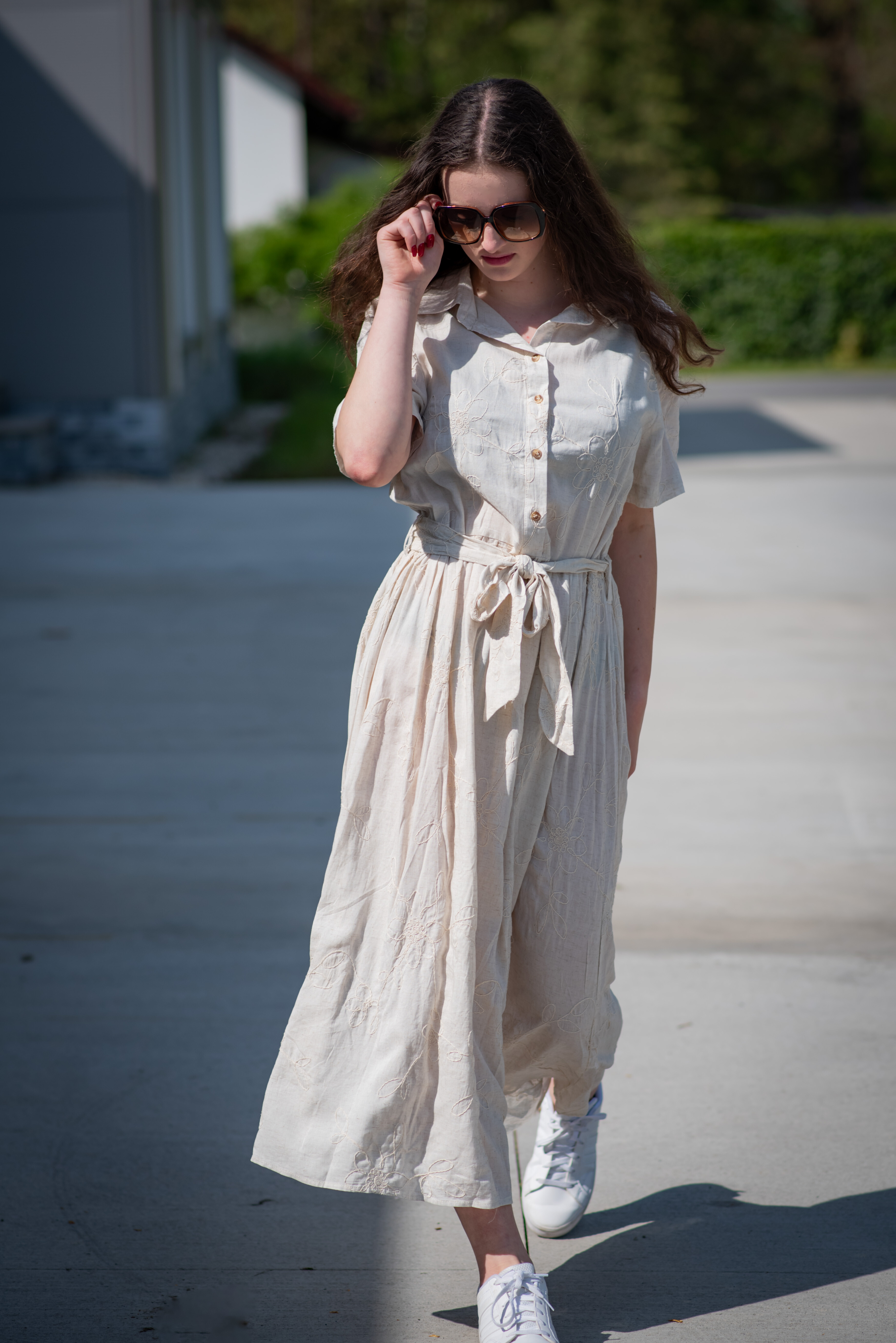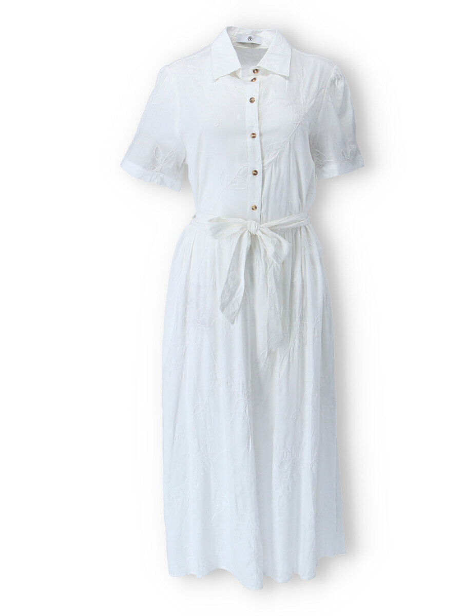 Dlouhé košilové šaty s výšivkou. Šaty mají áčkový střih, jsou celo propínací na knoflíky a doplněny páskem. Vyrobeno v Itálii