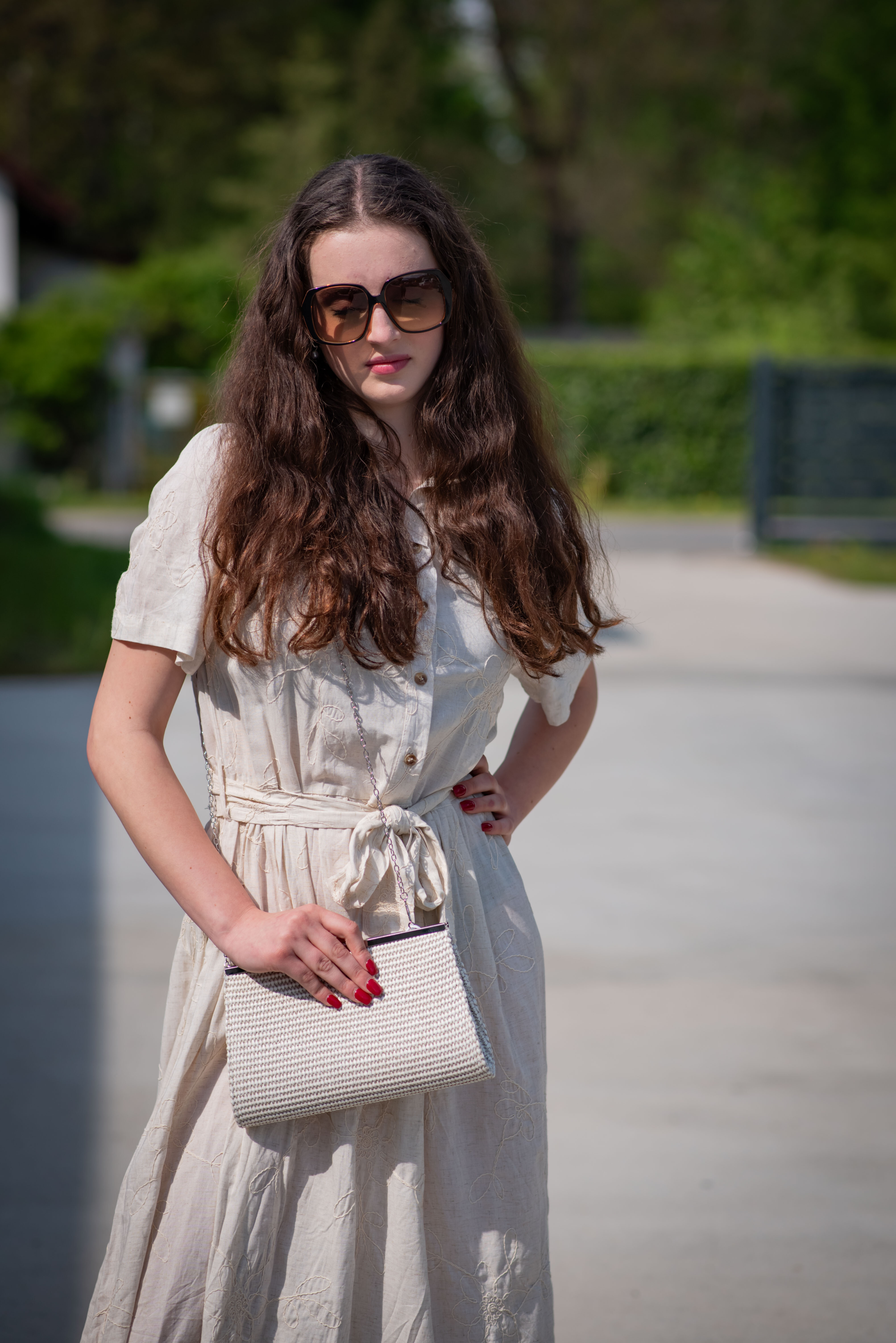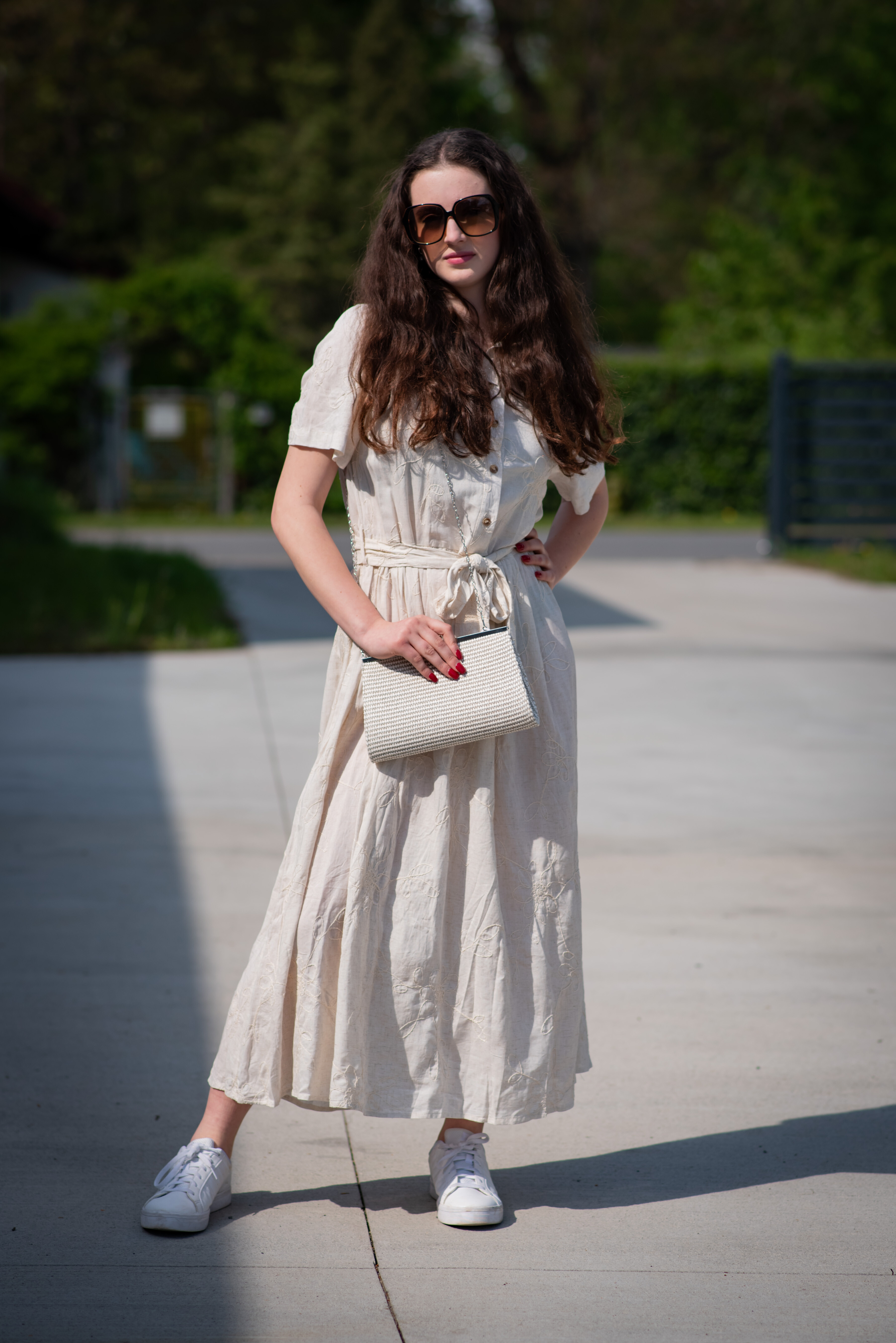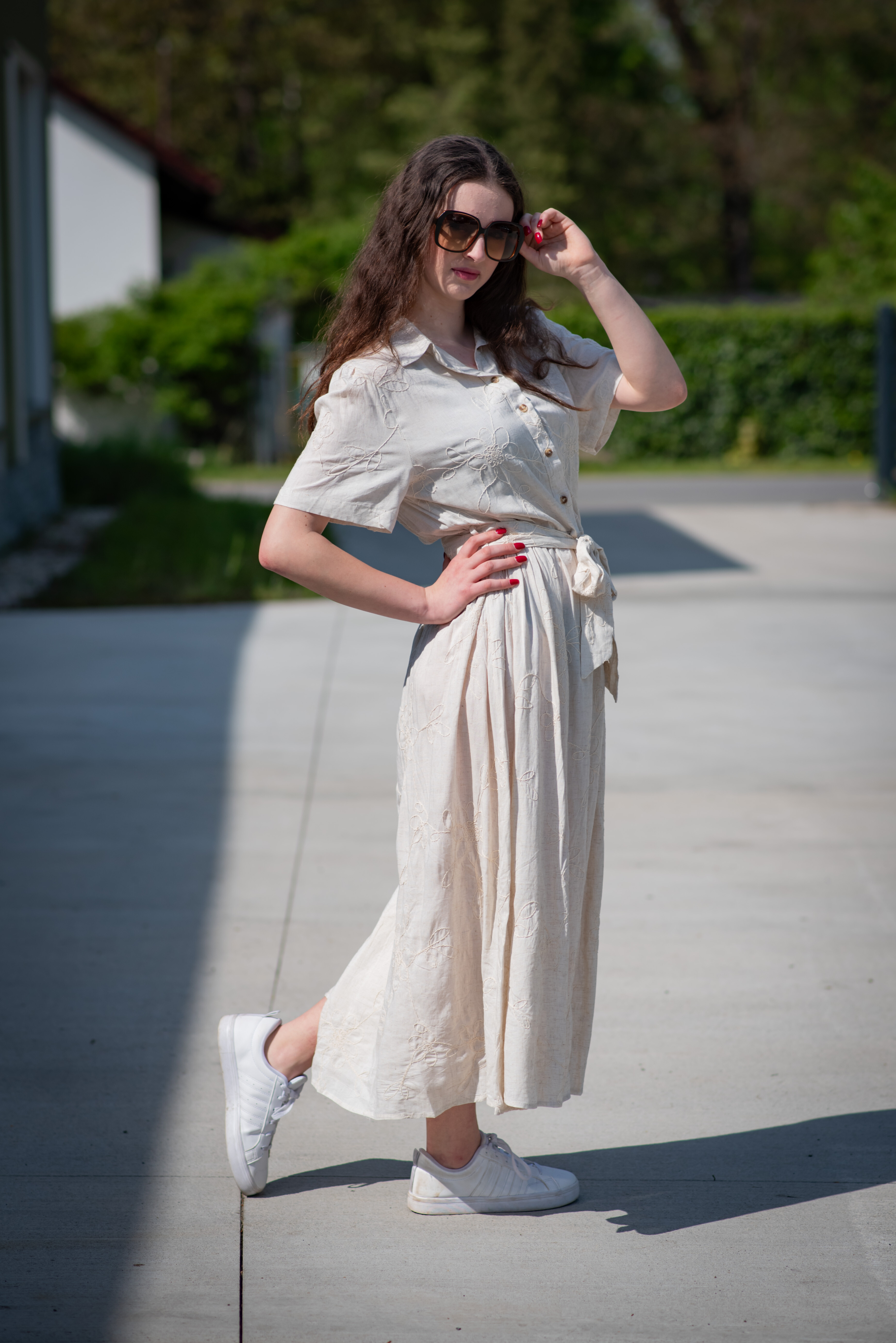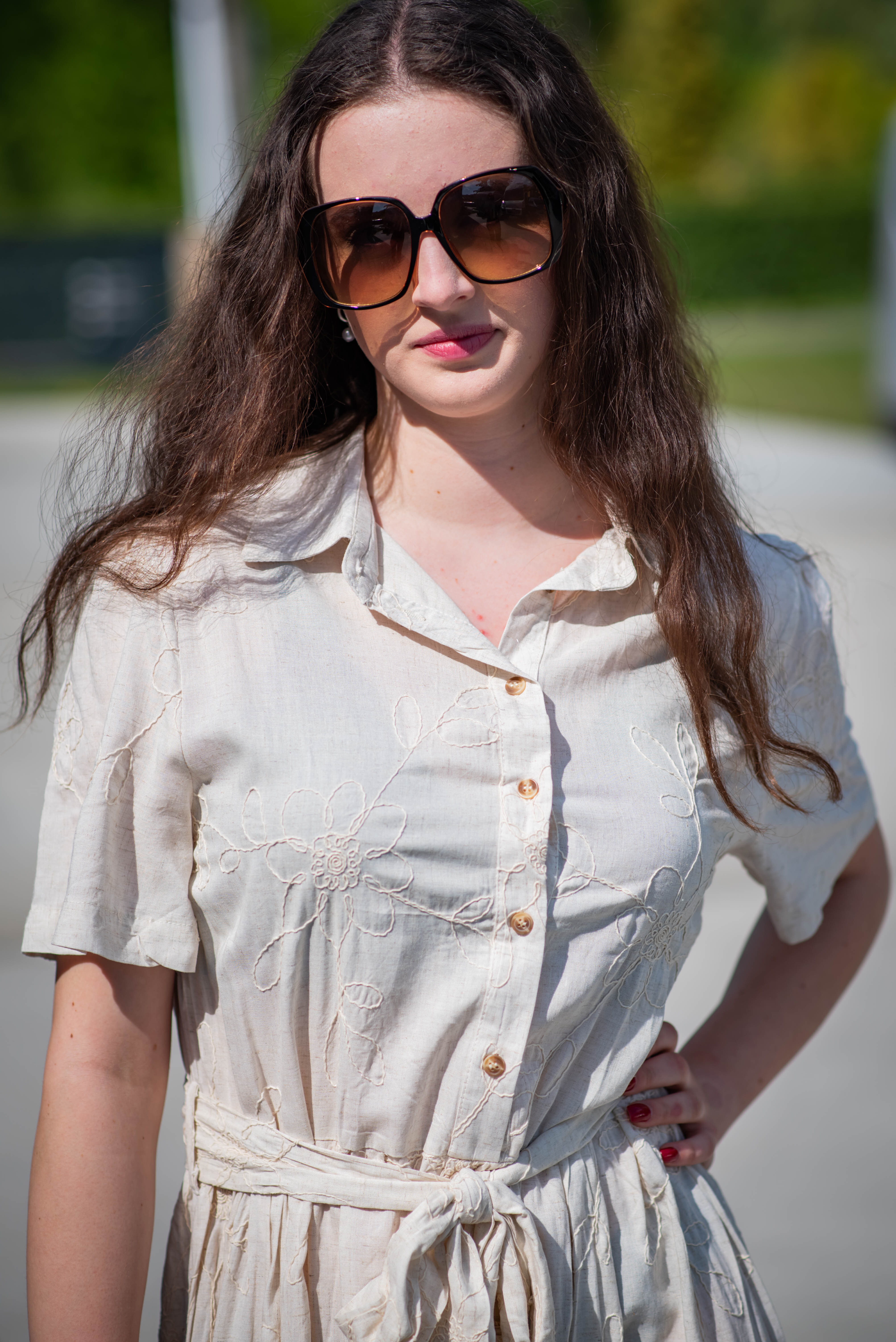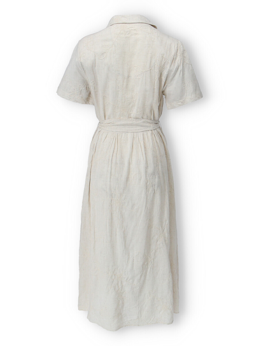 Dlouhé košilové šaty s výšivkou. Šaty mají áčkový střih, jsou celo propínací na knoflíky a doplněny páskem. Vyrobeno v Itálii