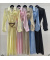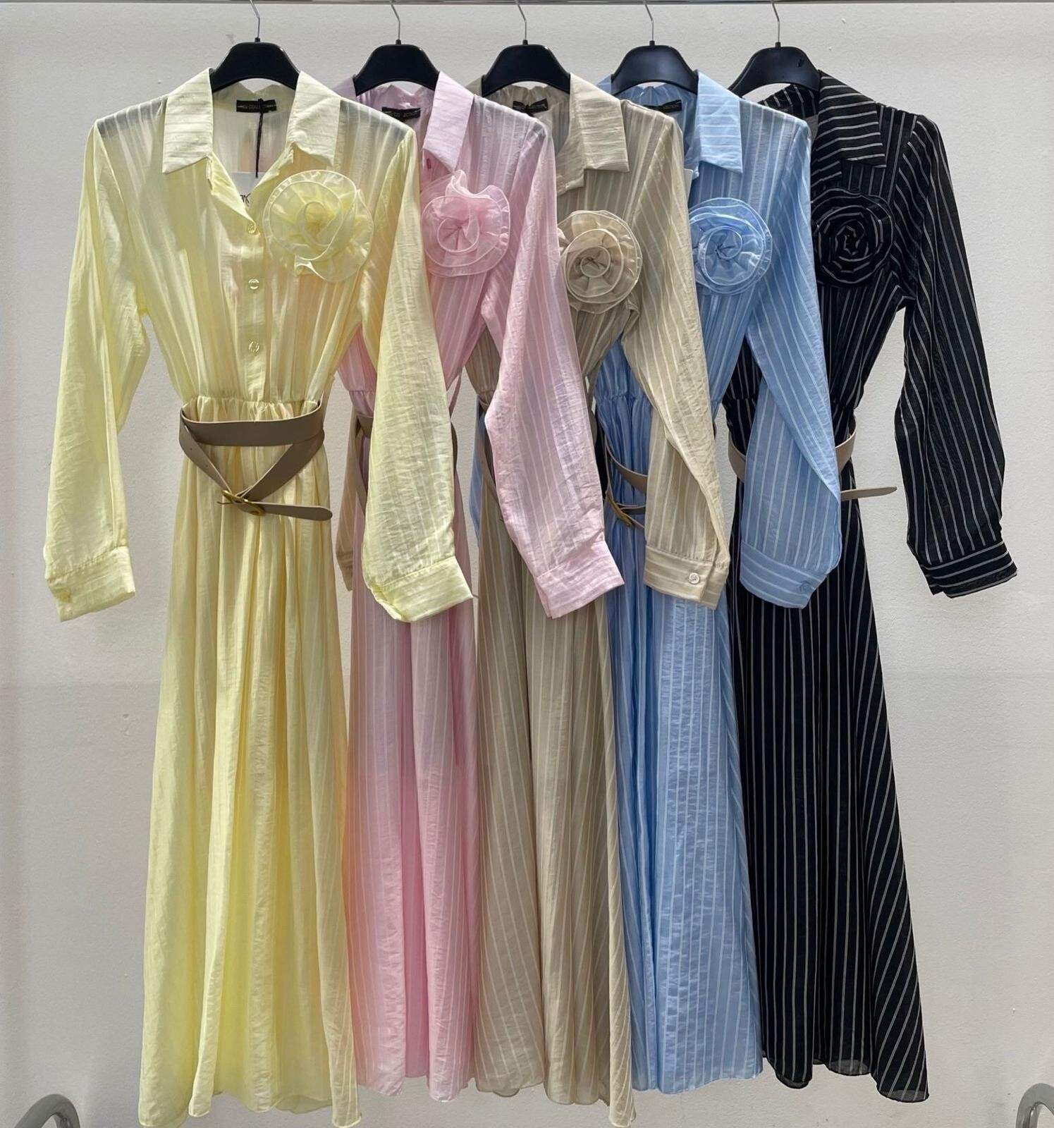Dlouhé elegantní šaty s proužkem, doplněny odnímatelnou broží. Šaty jsou do pasu propínací, mají dlouhý rukáv a jsou doplněny páskem.