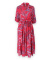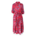 Dámské dlouhé košilové šaty s potiskem. Šaty mají límeček, doplněné páskem na stažení a regulací na knoflík na rukávu.