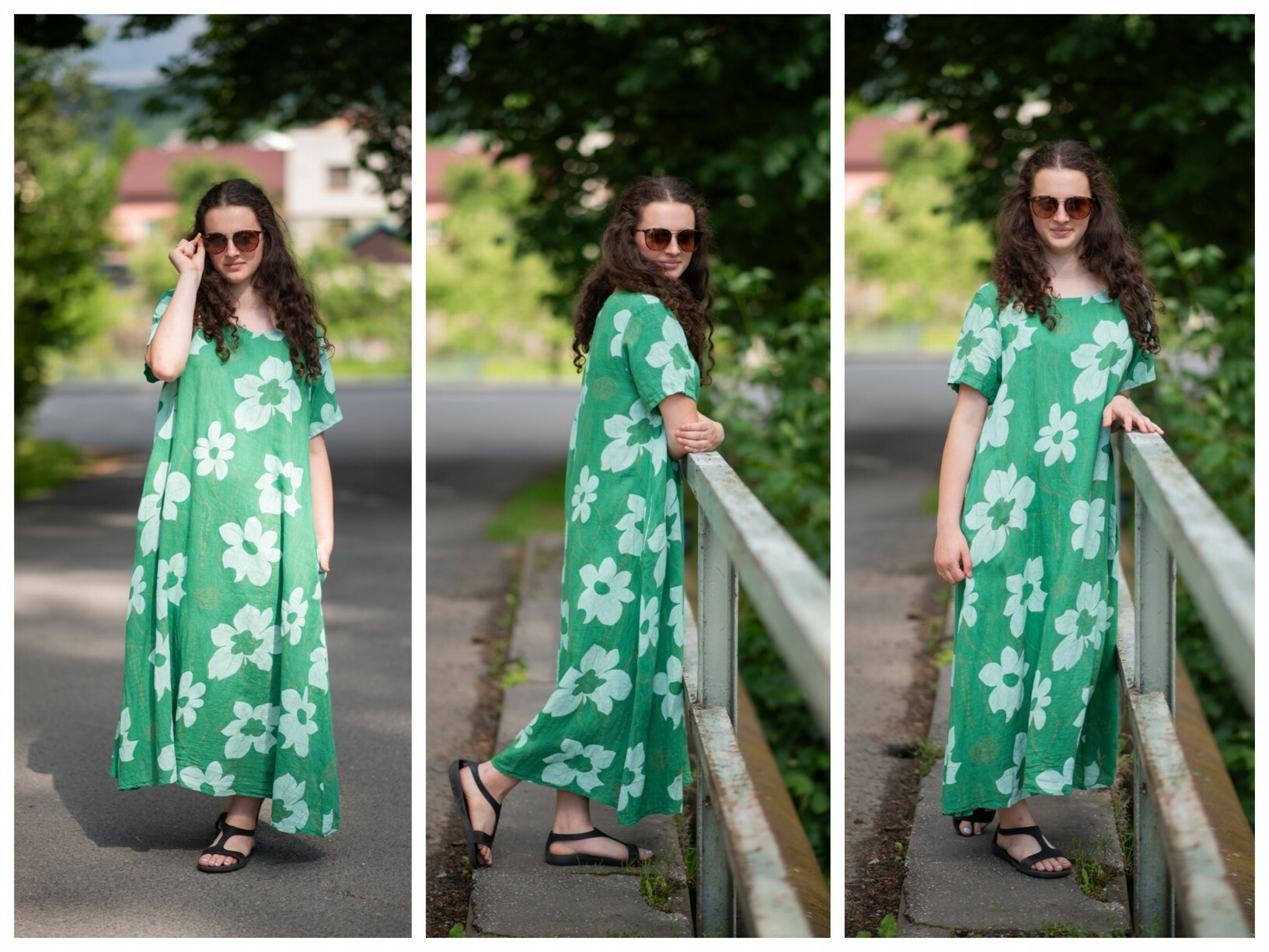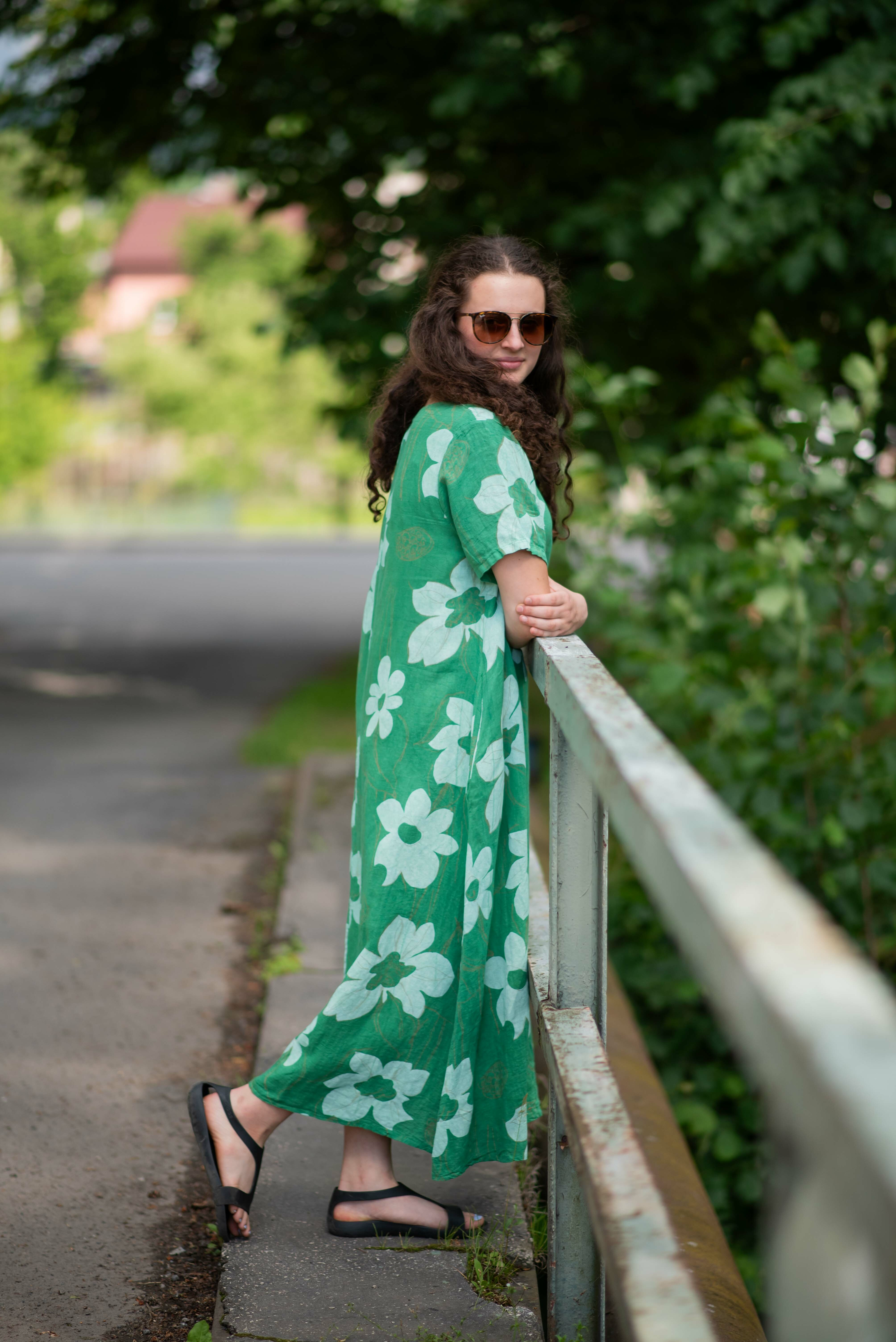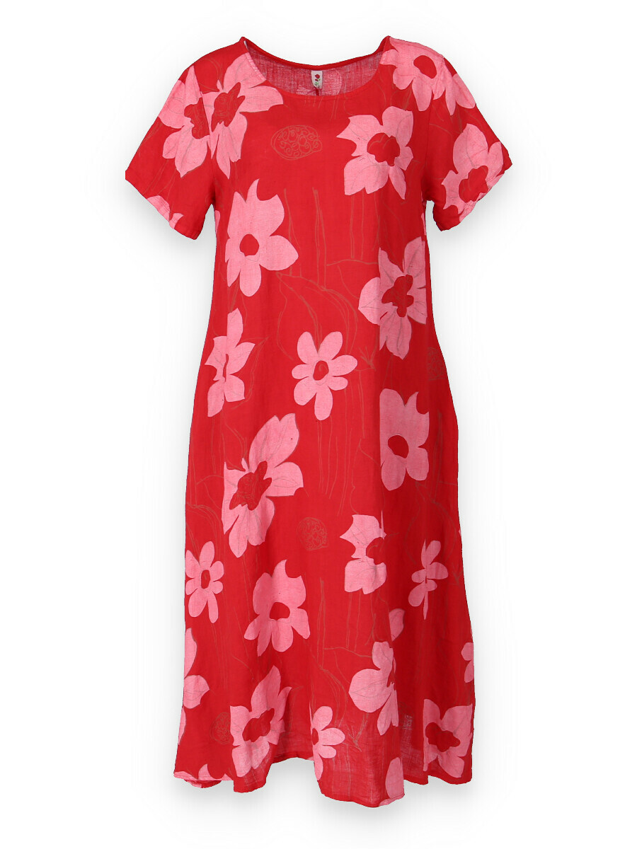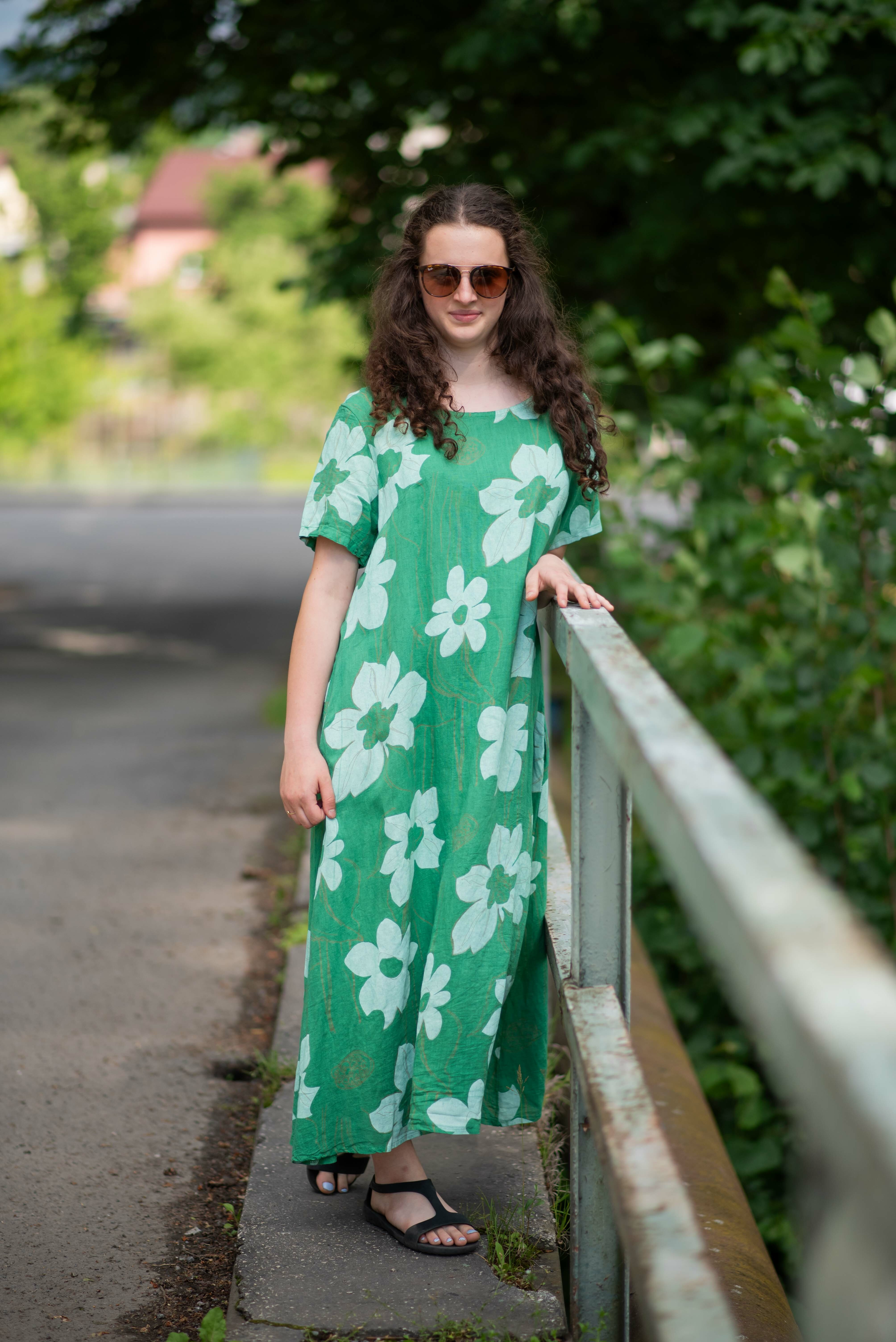 Dlouhé lněné šaty s potiskem, šaty mají krátký rukáv a kulatý výstřih. Trendy letní kousek.