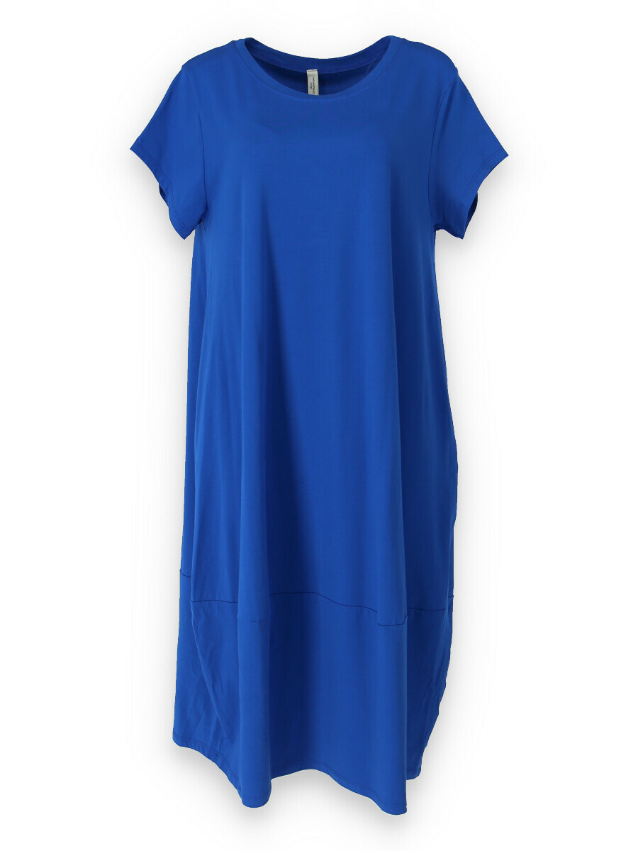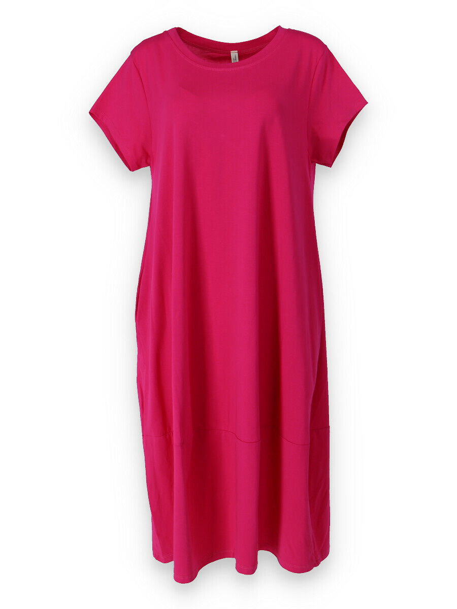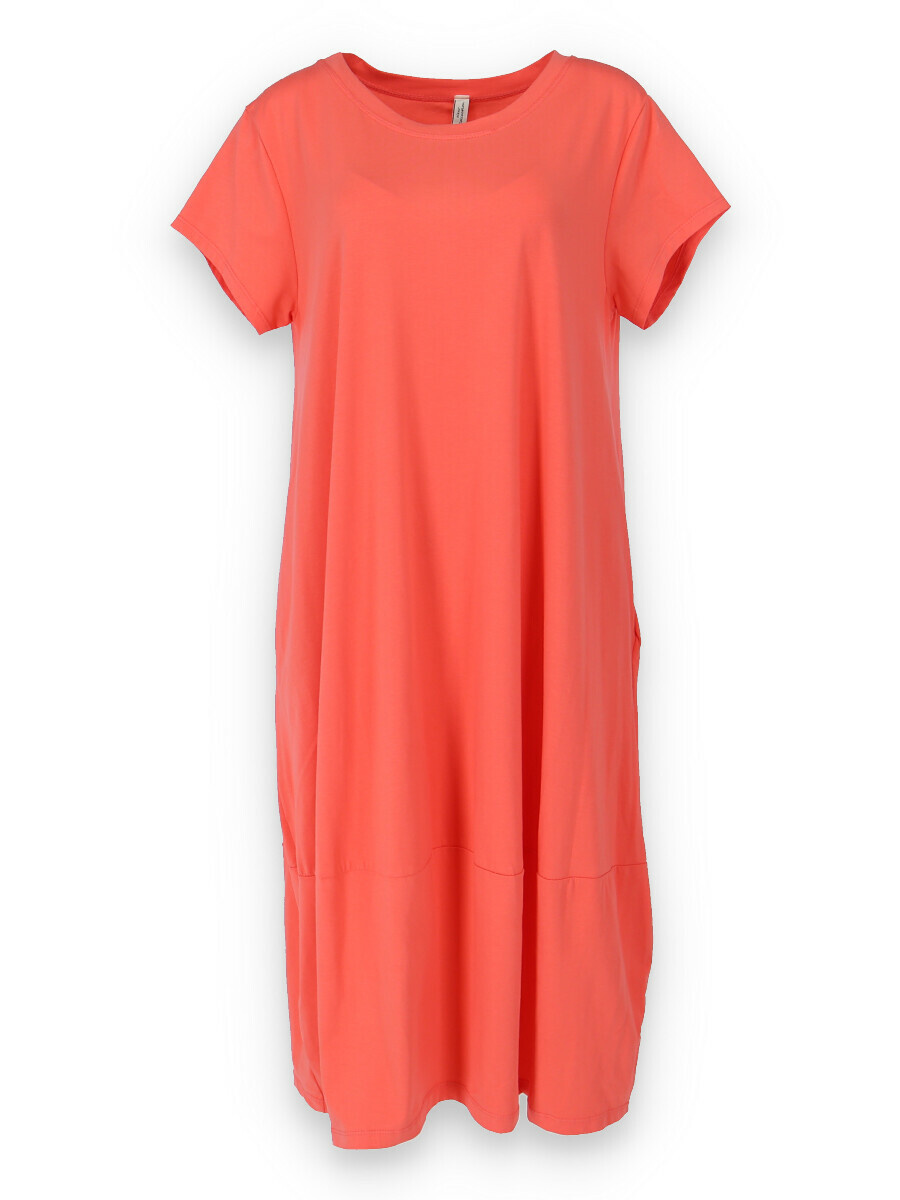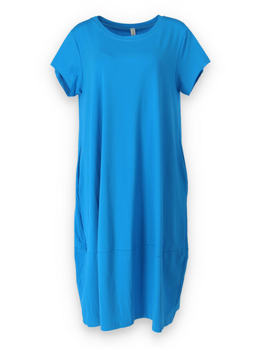 Dlouhé šaty s krátkým rukávem, všité kapsy po stranách, kulatý výstřih.