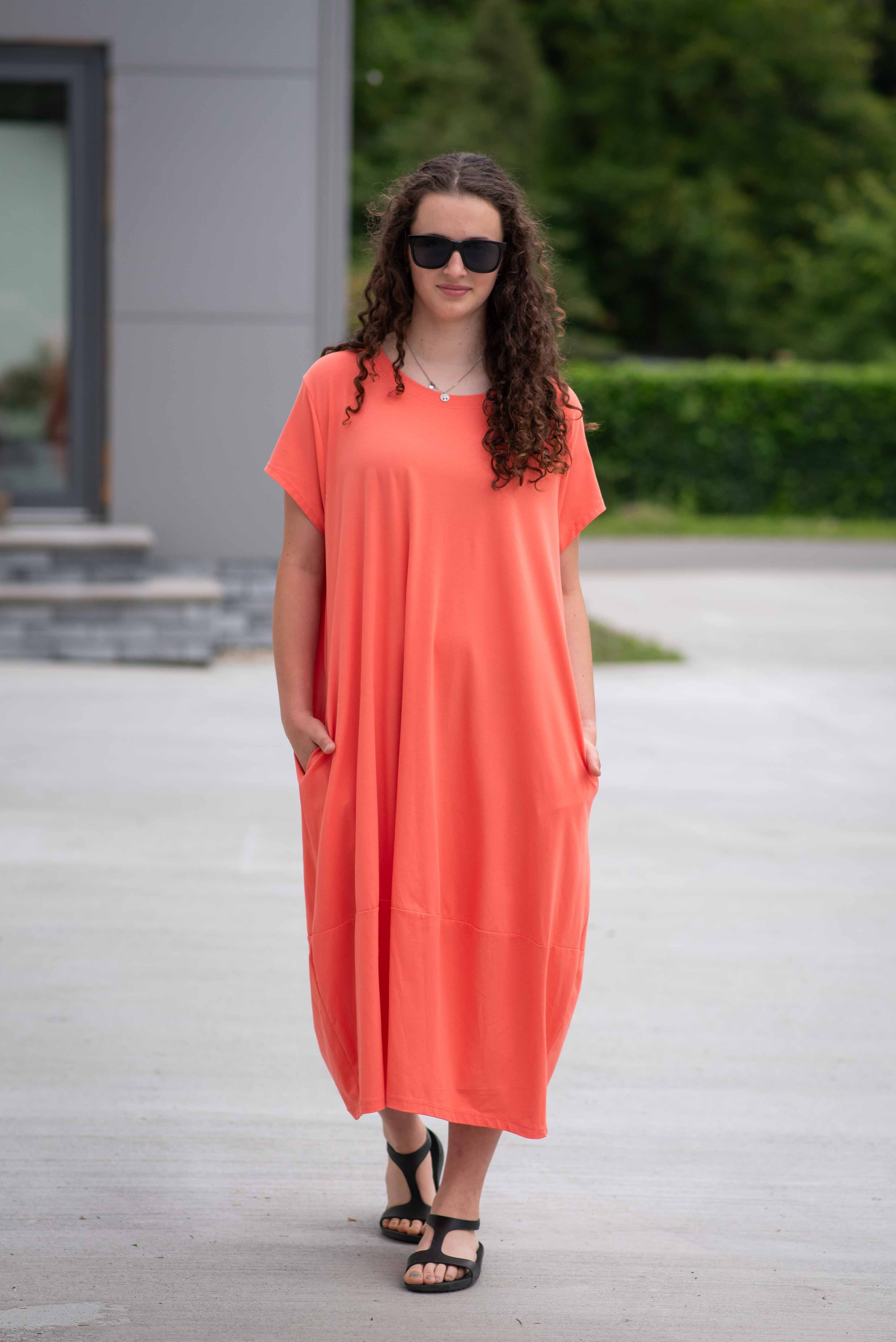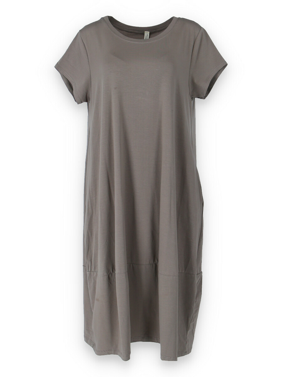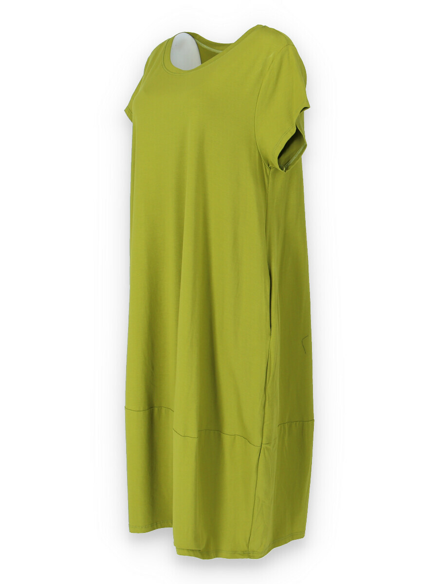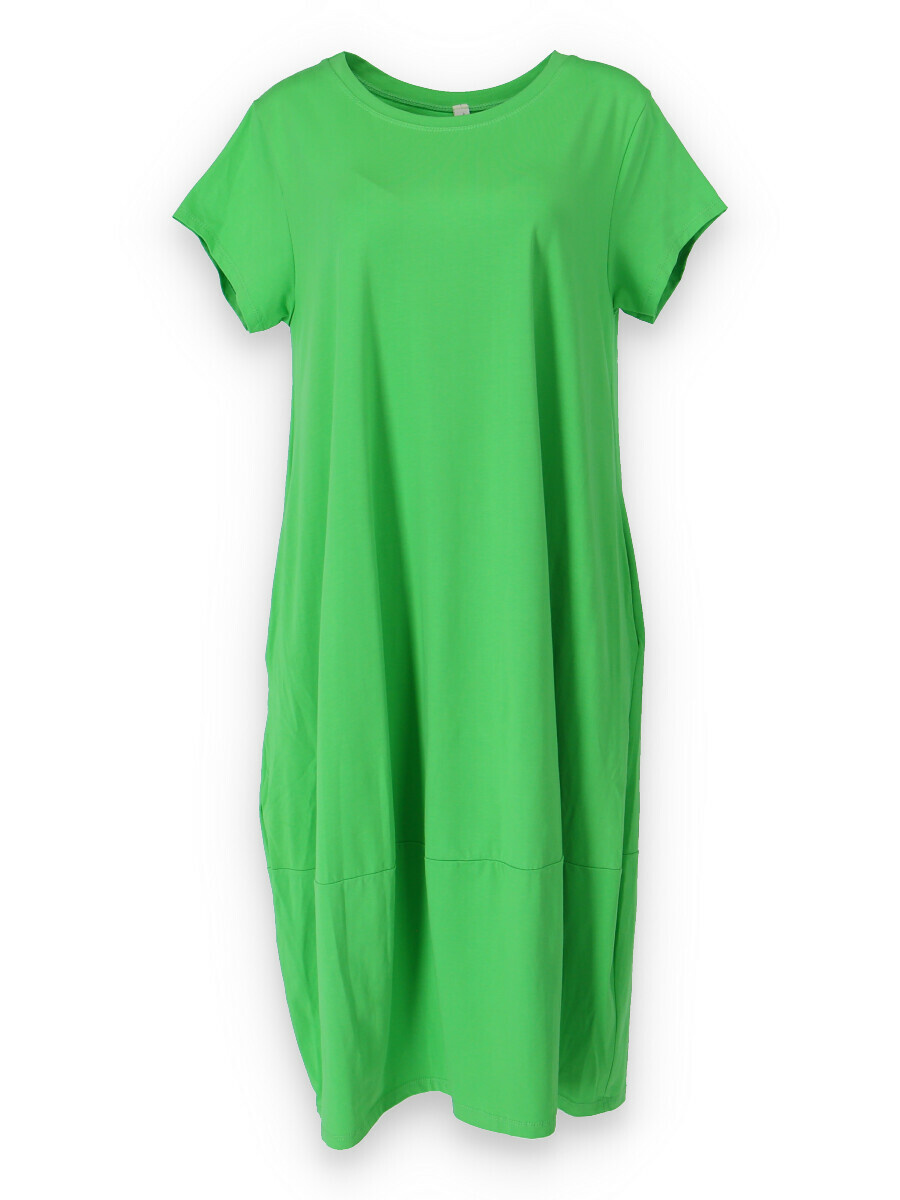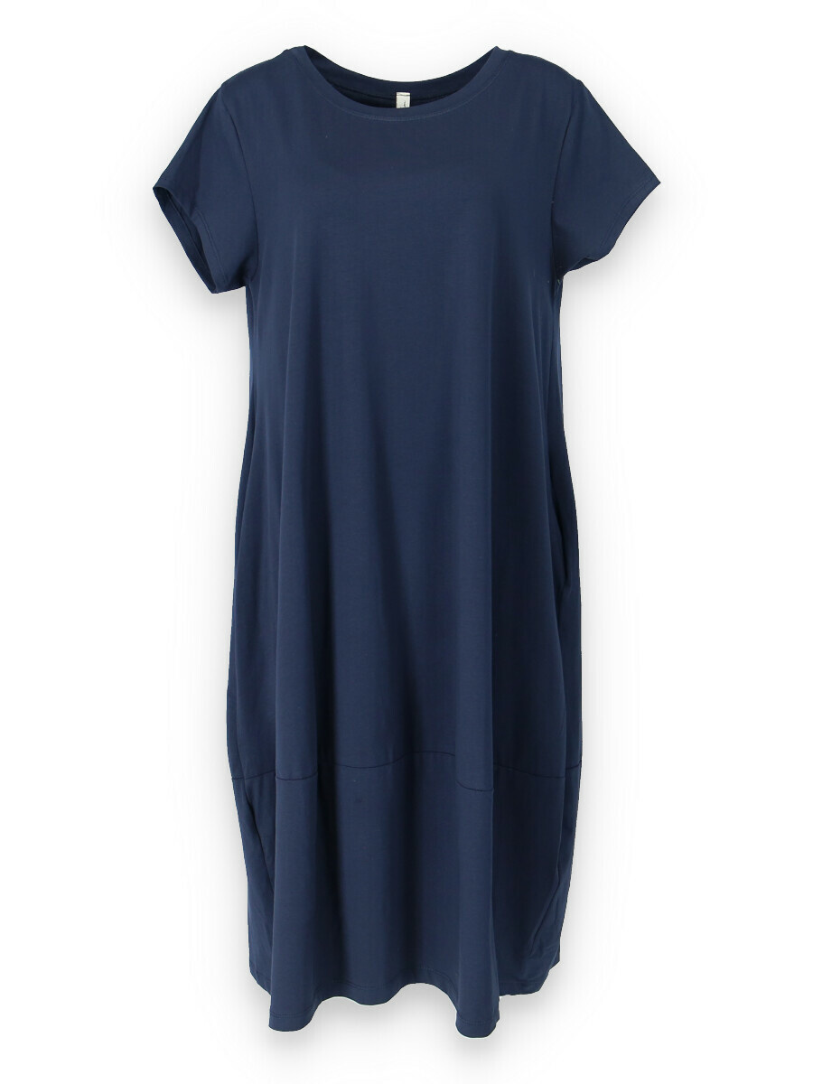Dlouhé šaty s krátkým rukávem, všité kapsy po stranách, kulatý výstřih.