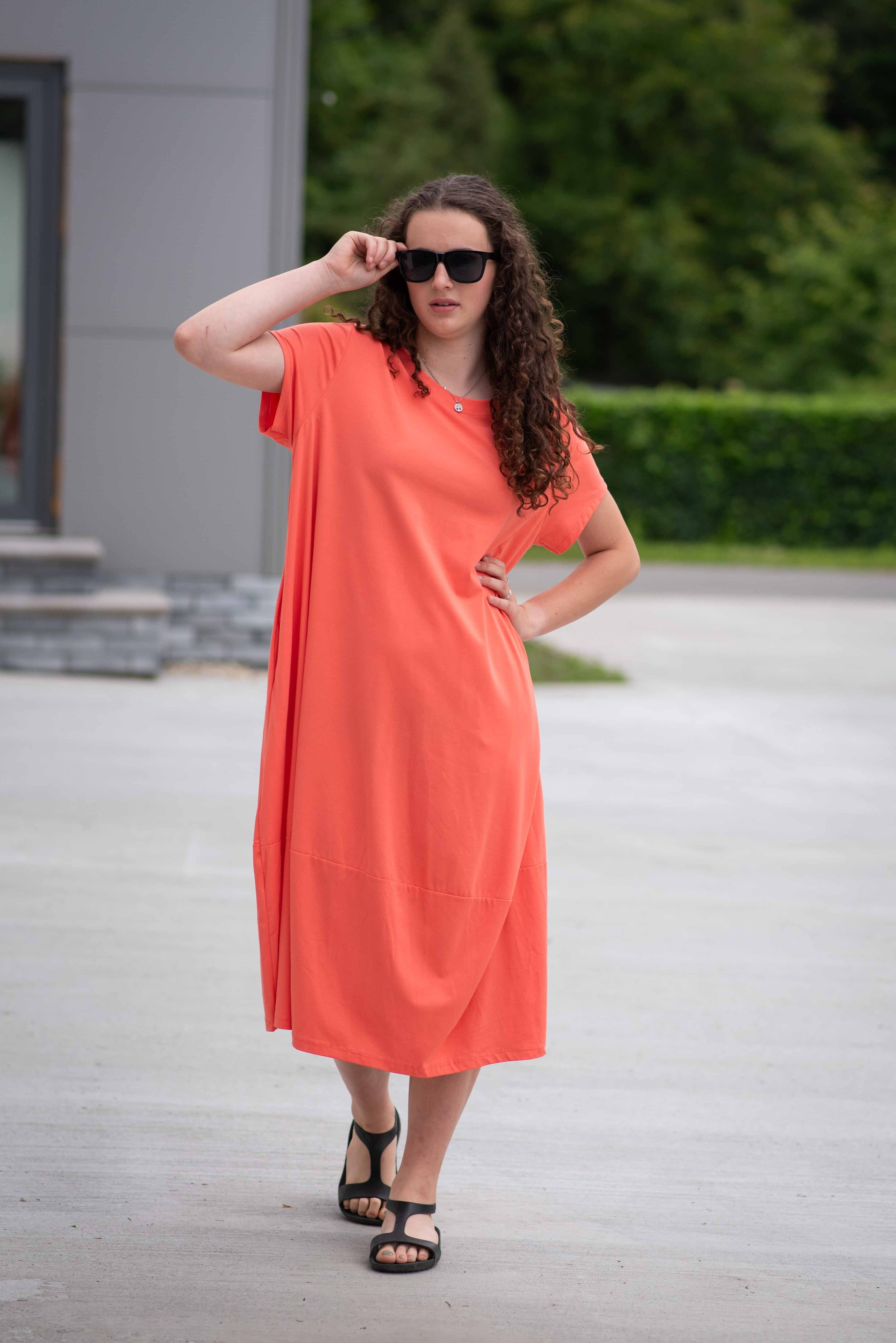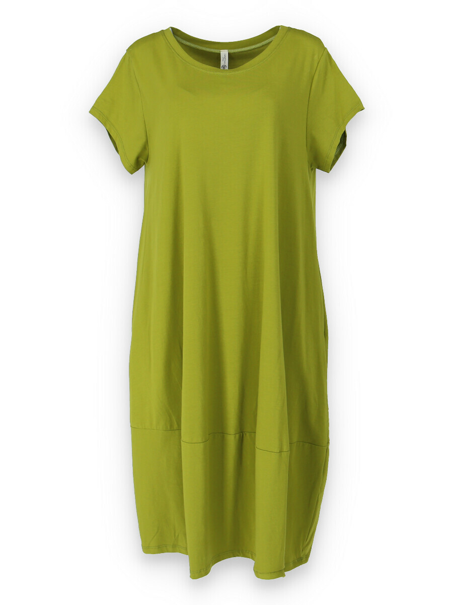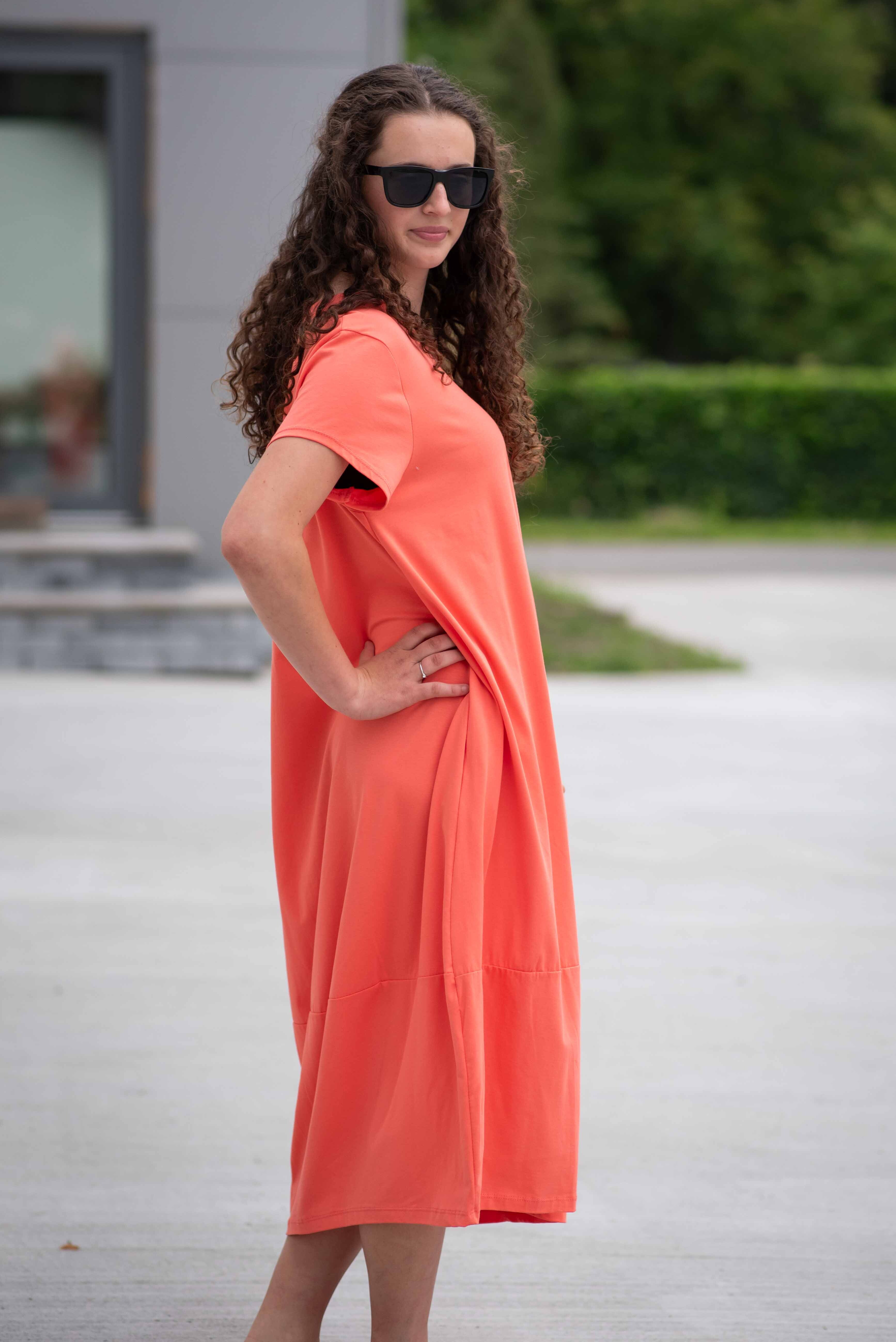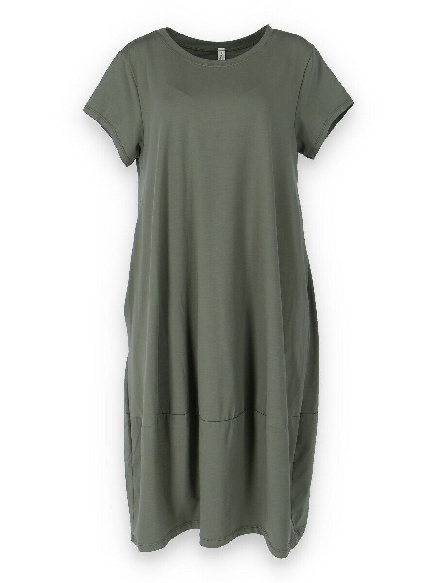 Dlouhé šaty s krátkým rukávem, všité kapsy po stranách, kulatý výstřih.