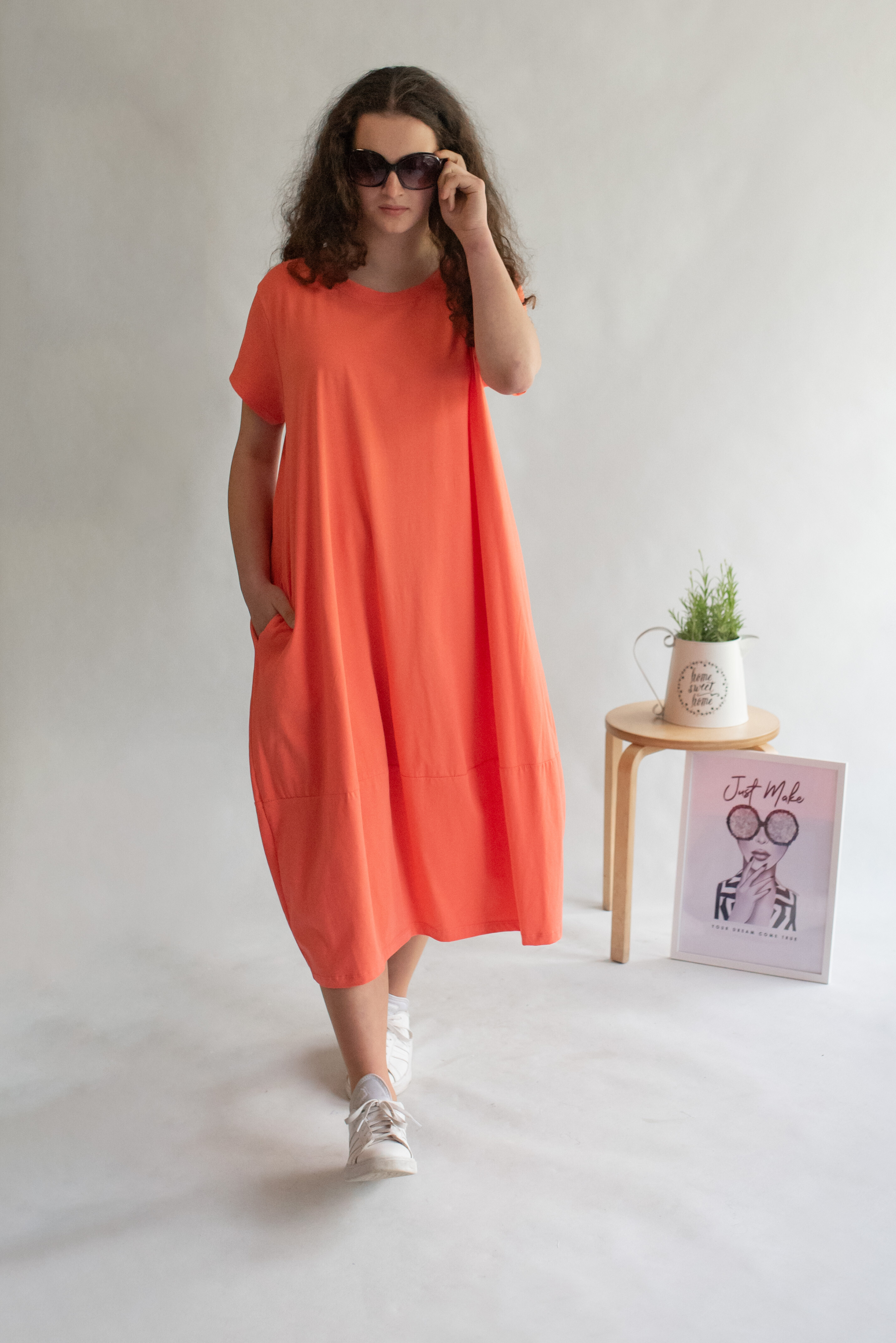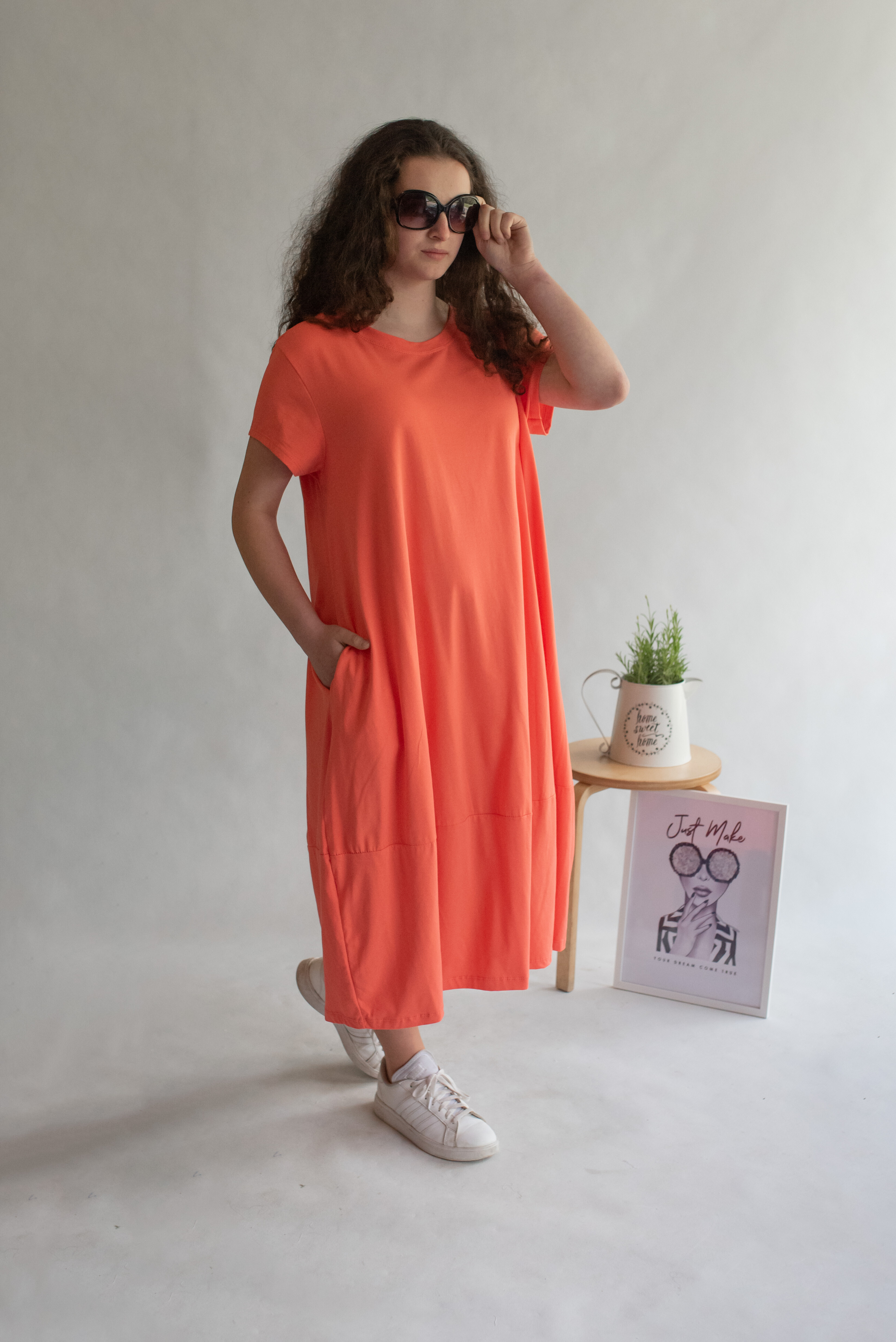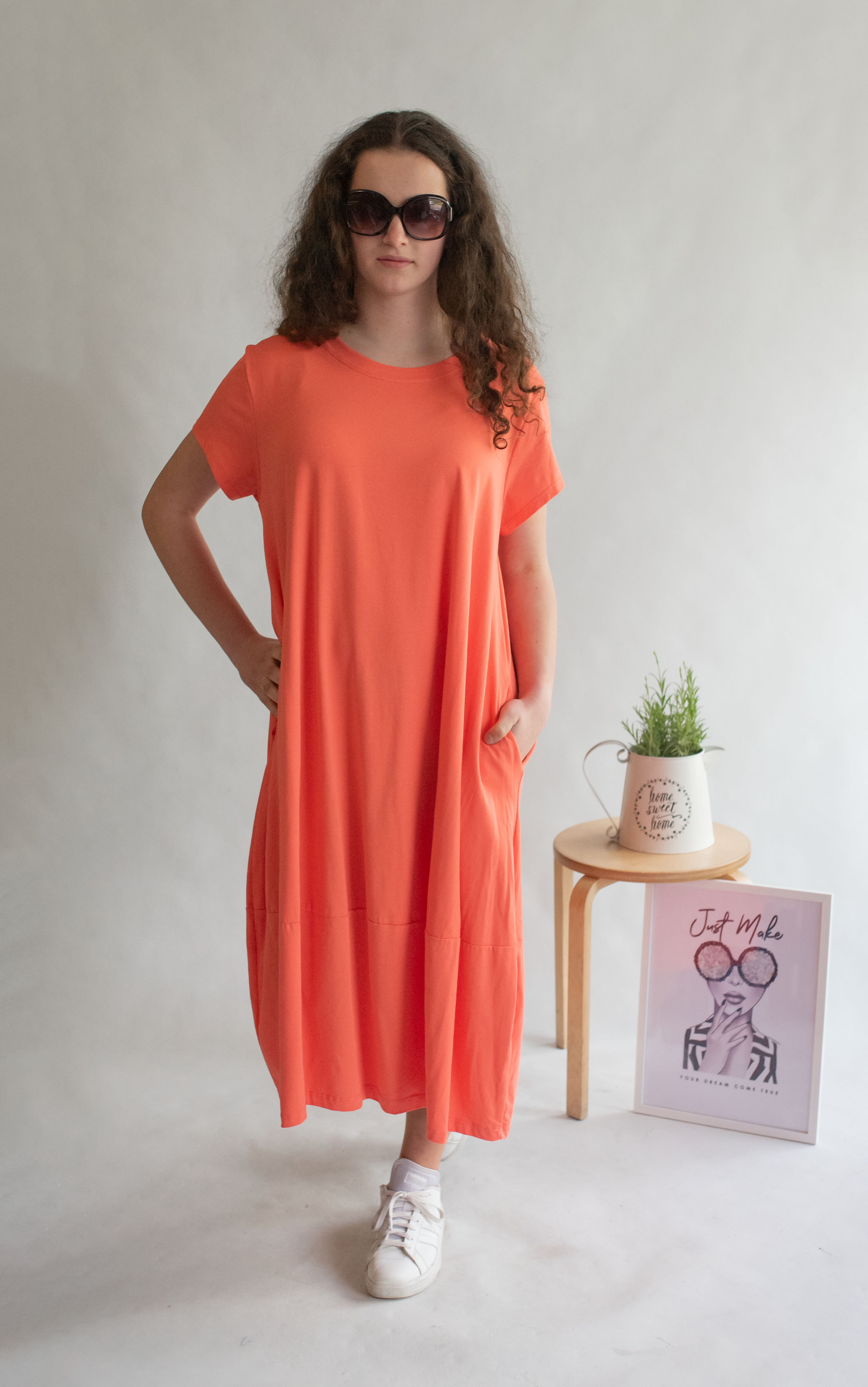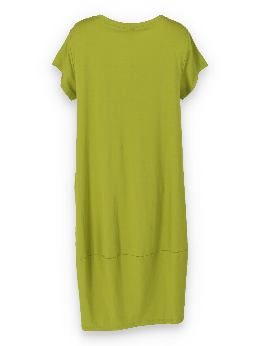 Dlouhé šaty s krátkým rukávem, všité kapsy po stranách, kulatý výstřih.