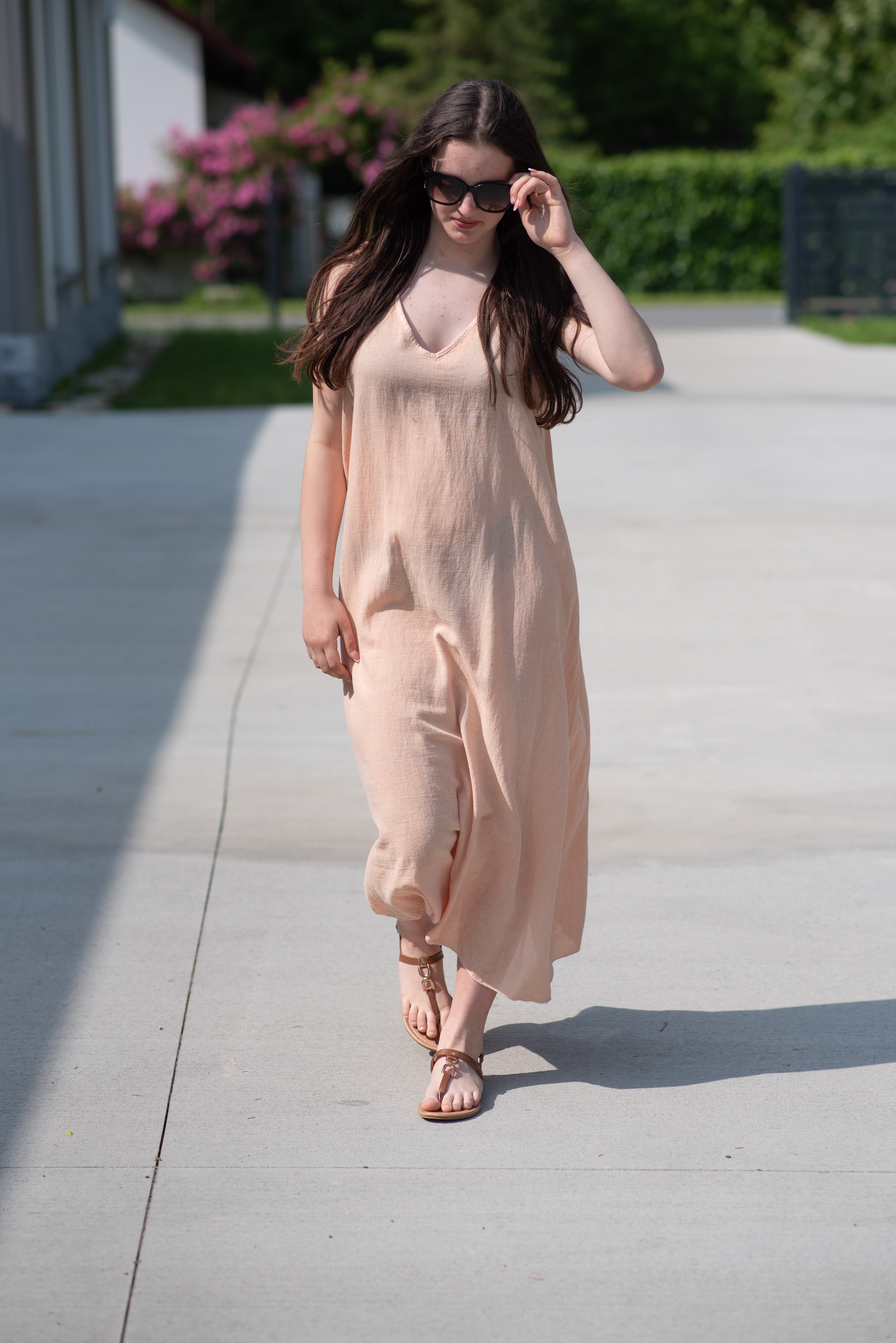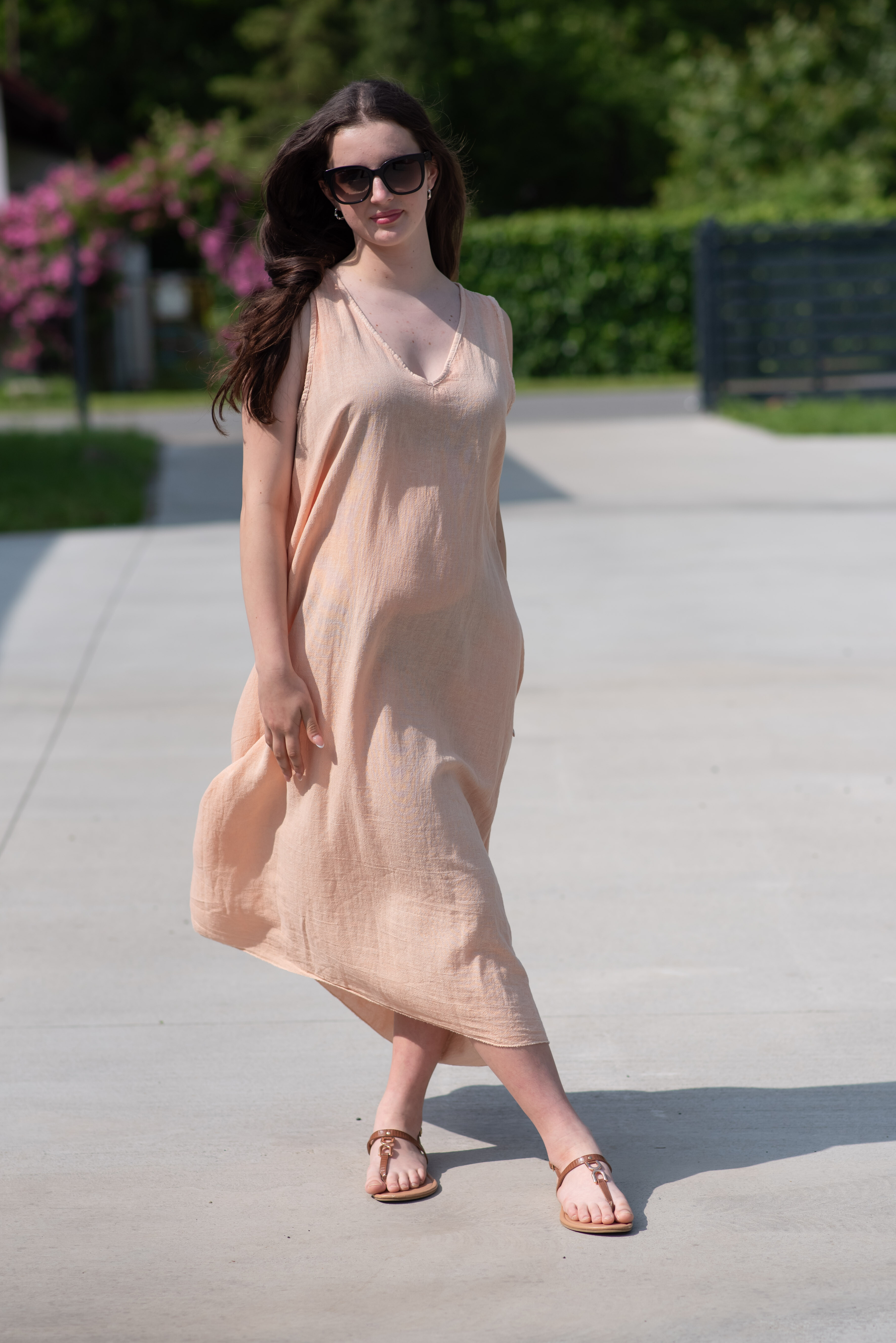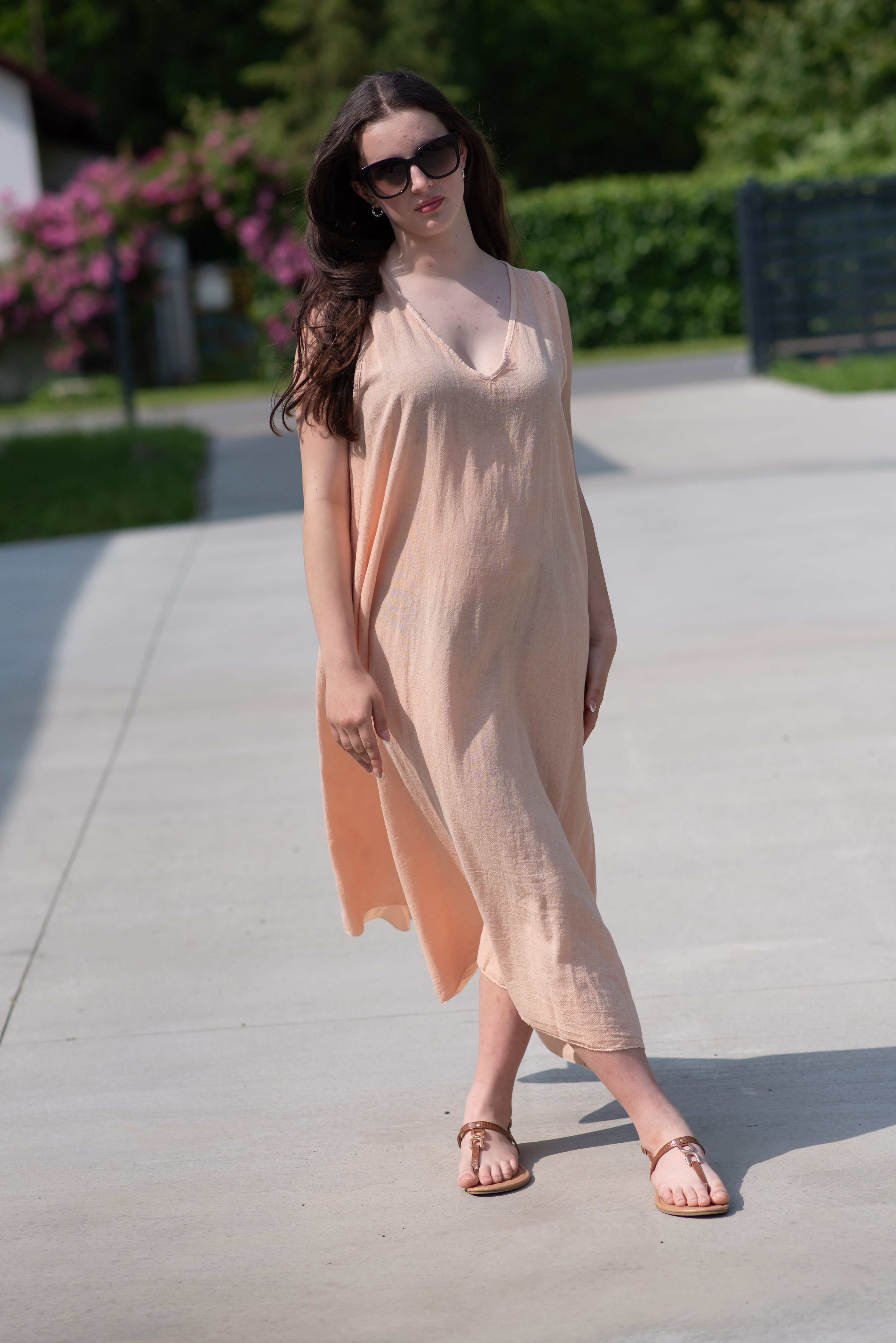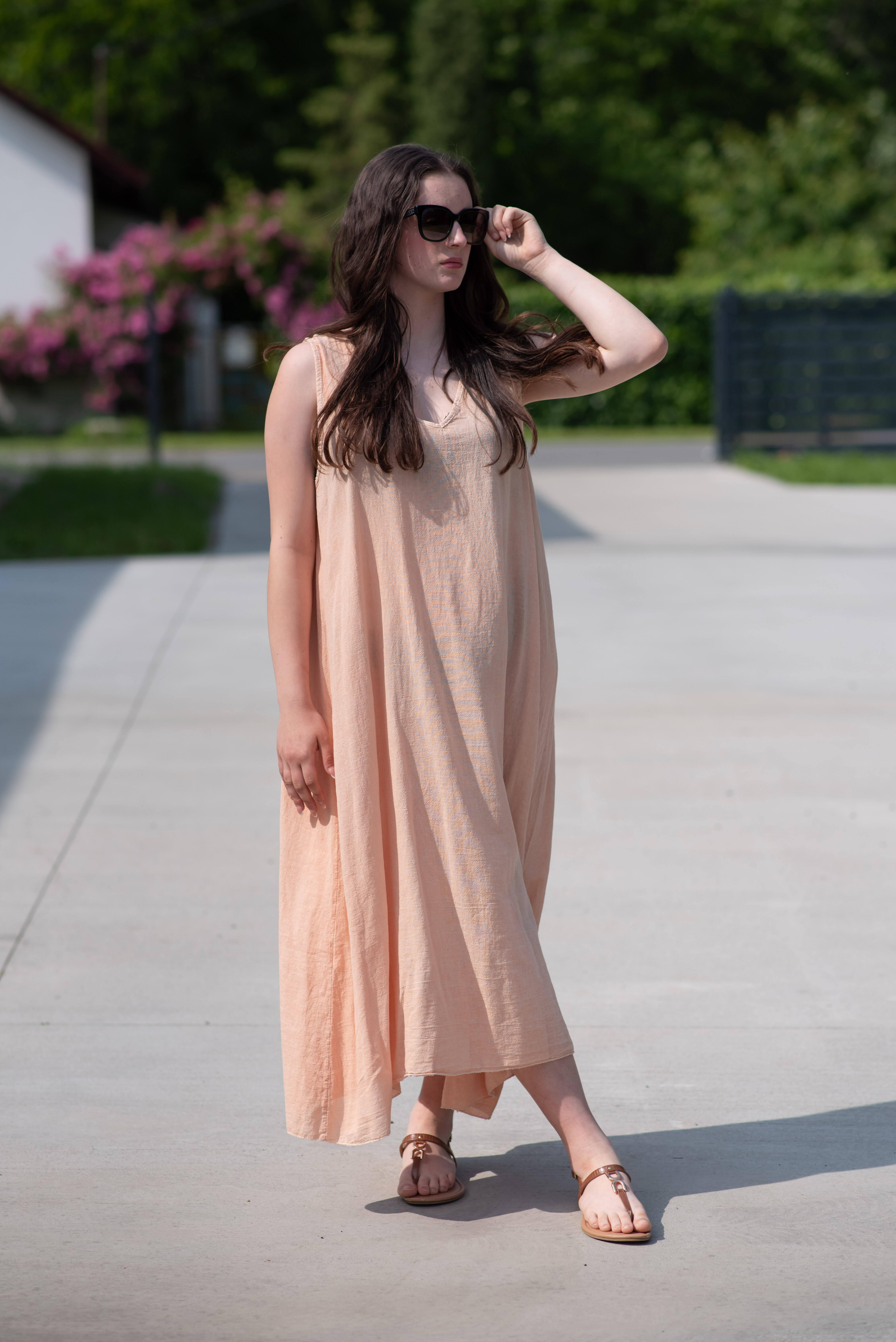 Dámské dlouhé šaty bez rukávu s véčkovým výstřihem. Šaty jsou z velmi lehkého příjemného a vzdušného materiálu.