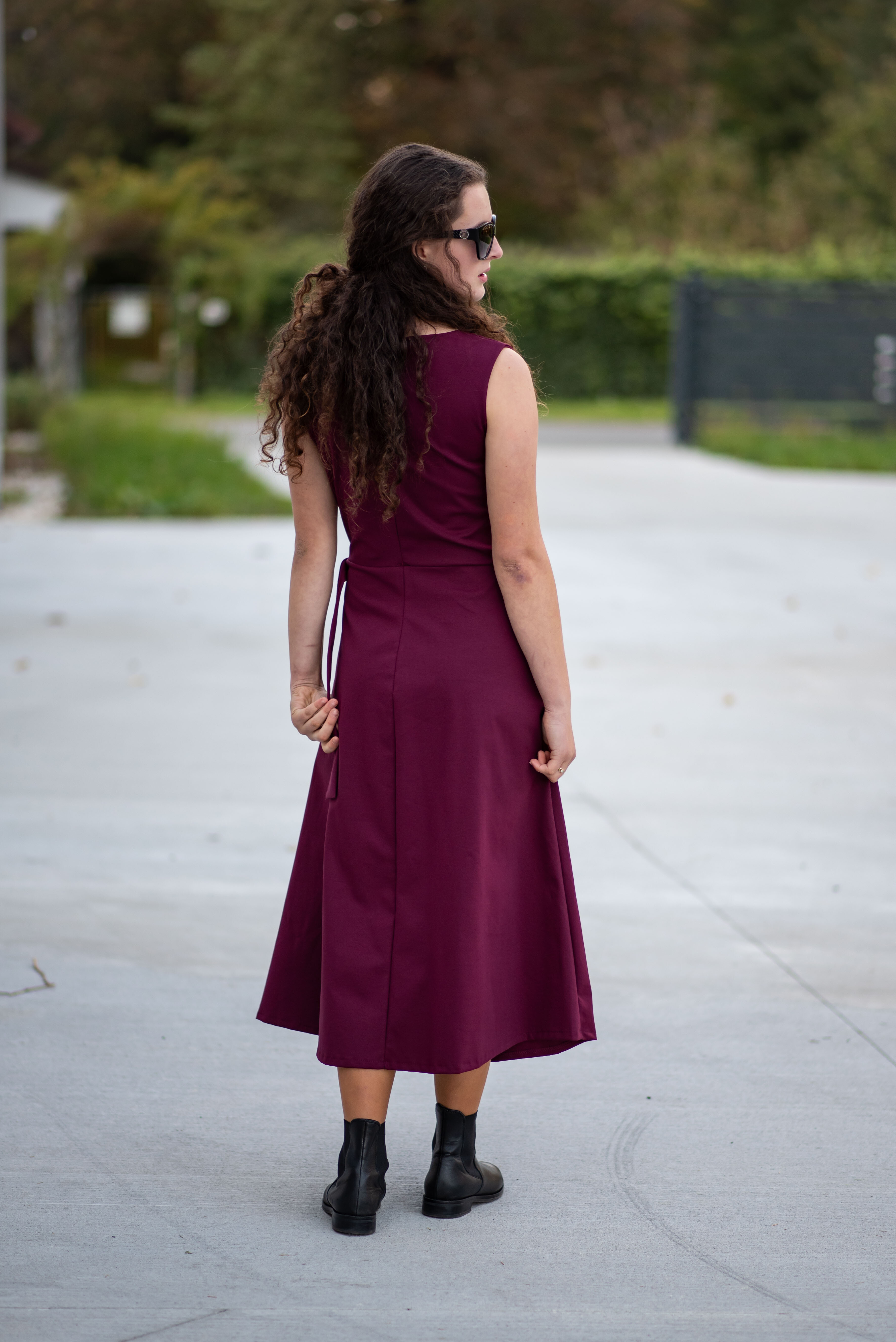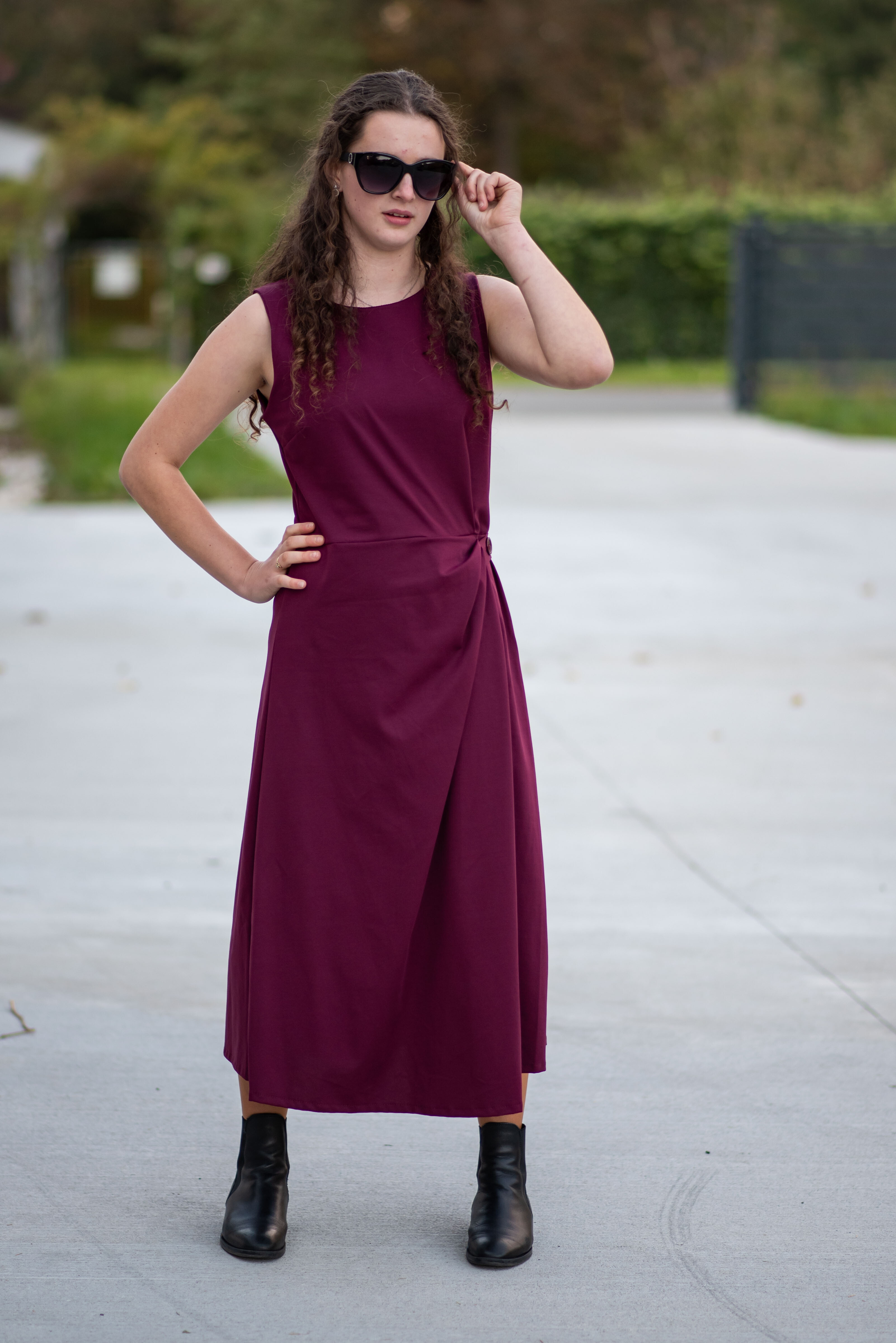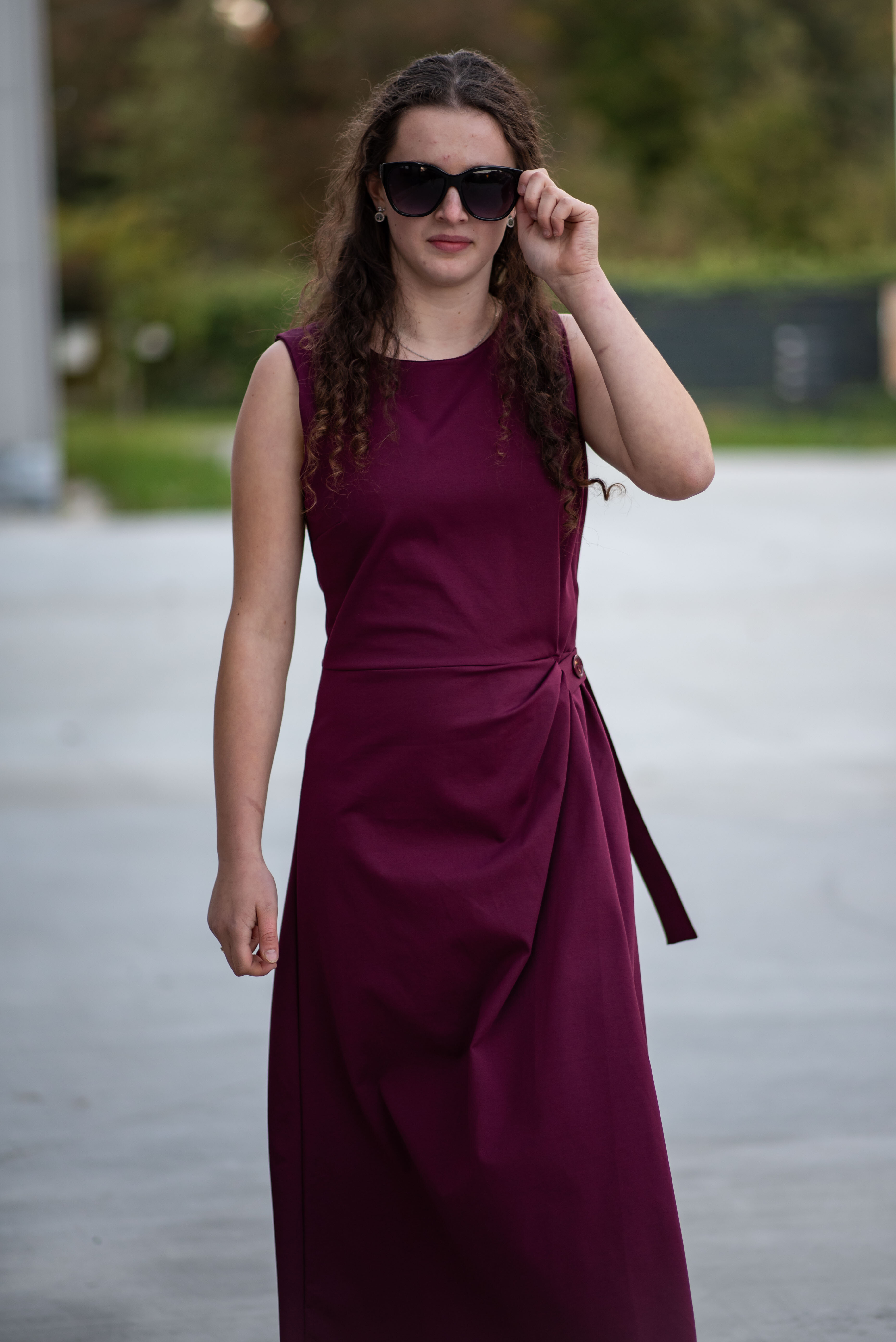 Elegantní šaty dlouhé bez rukávu a s kulatým výstřihem. Šaty jsou na zadní straně na zip a v oblasti pasu mají regulaci na knoflík.