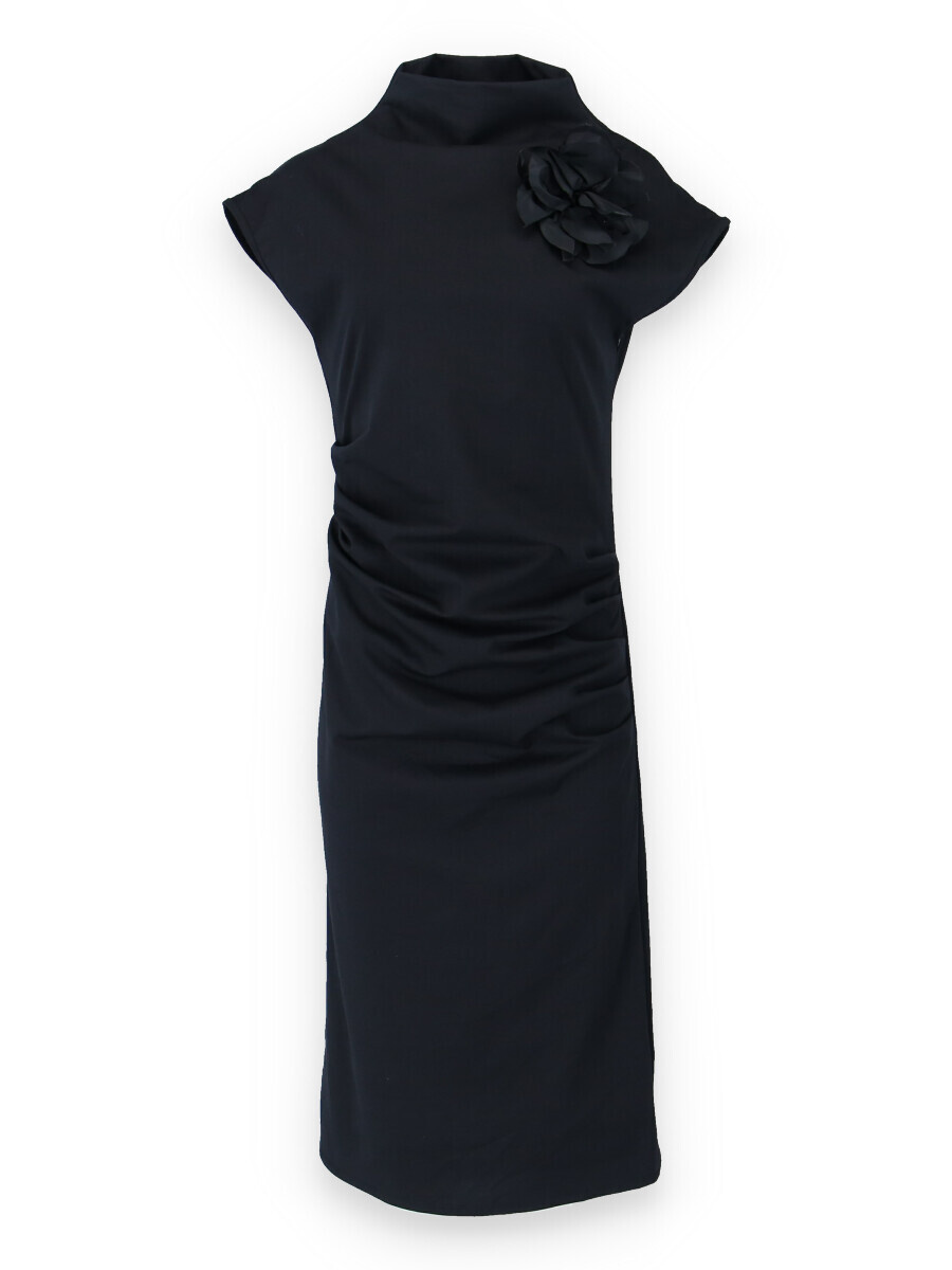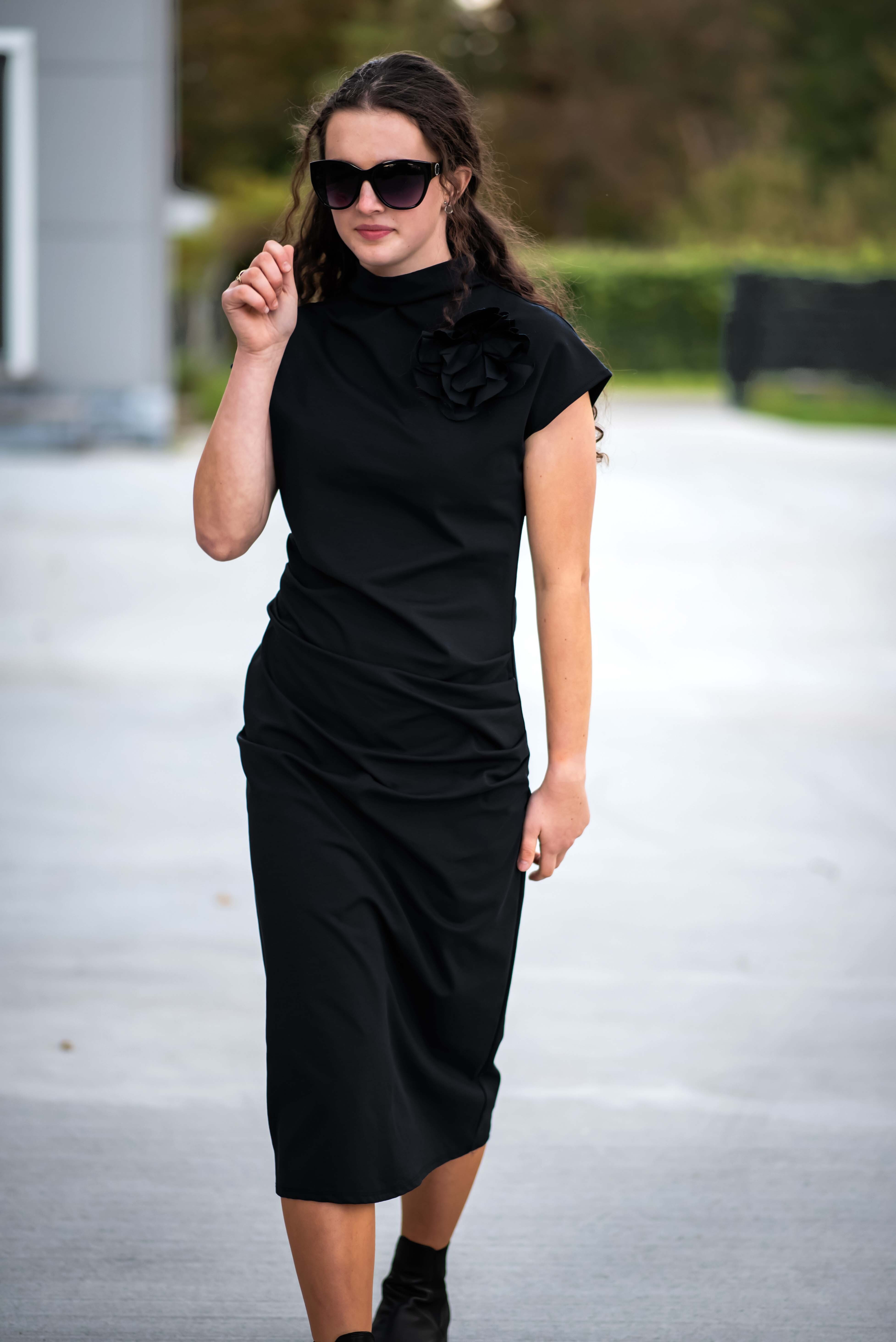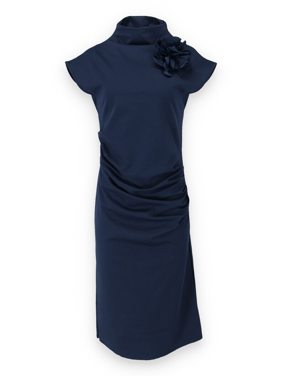 Elegantní dlouhé šaty, vhodné ke společenským příležitostem. Šaty jsou doplněny odnímatelnou broží, u krku jsou řešeny stojáčkem a v oblasti břicha mají rafinované řasení.