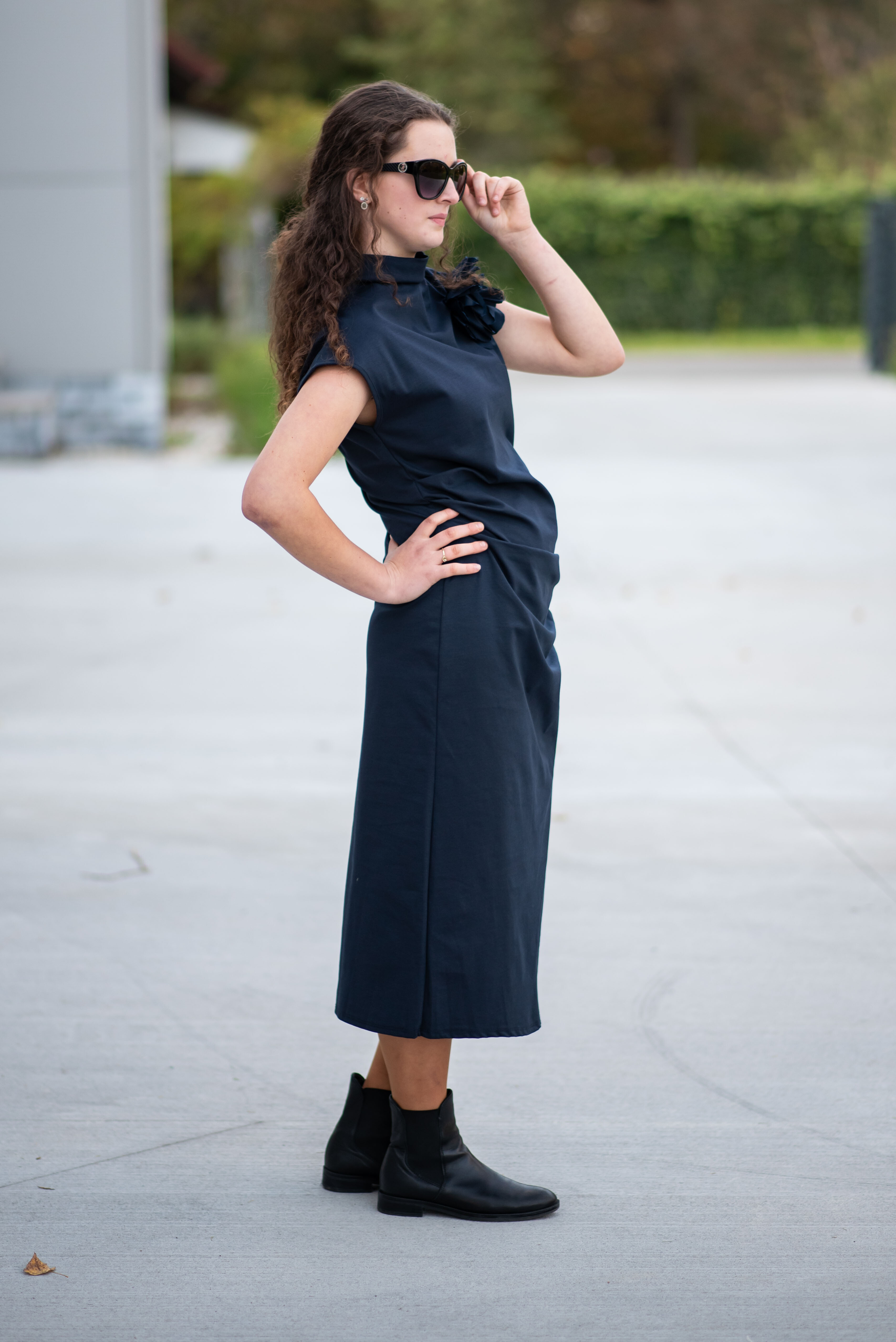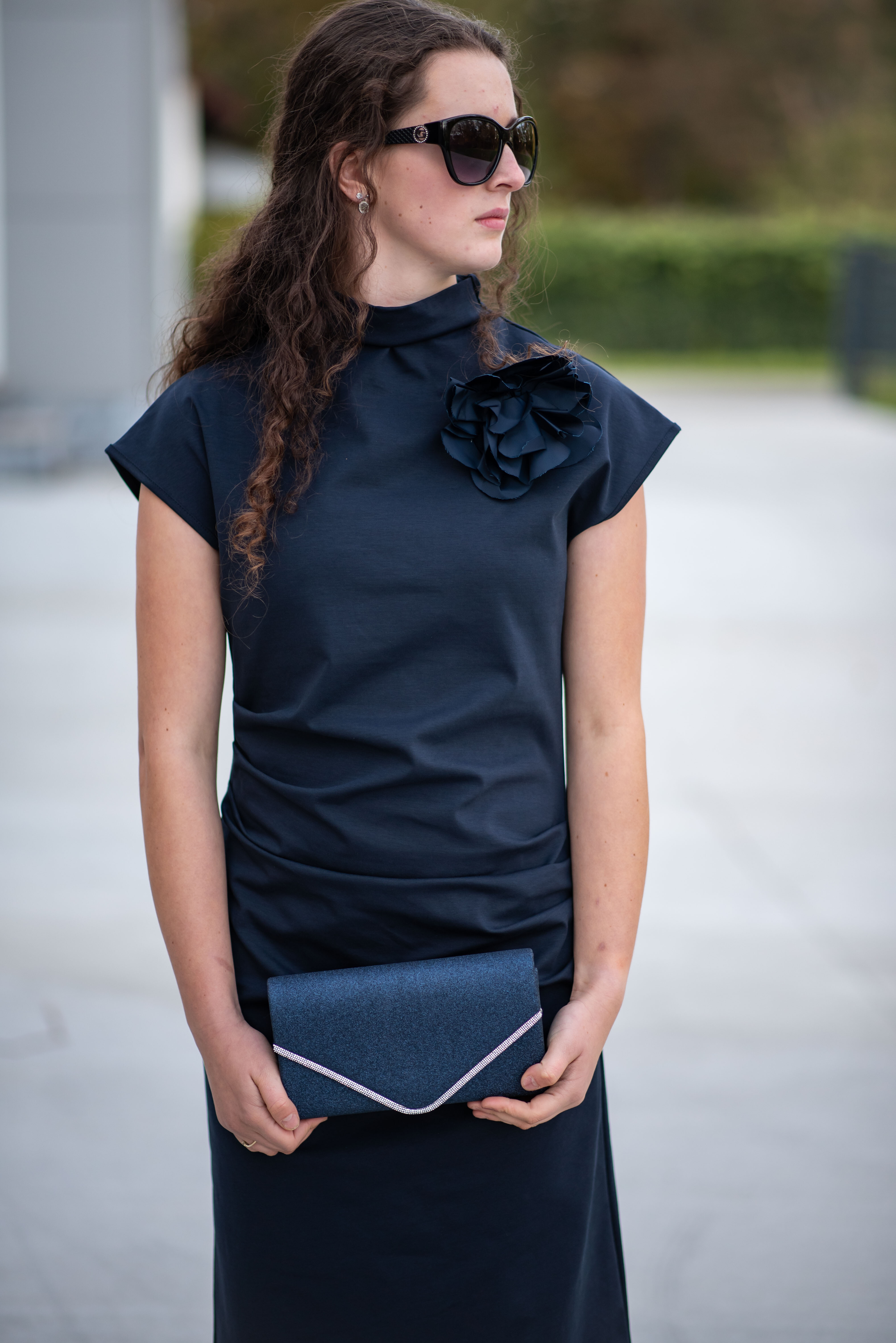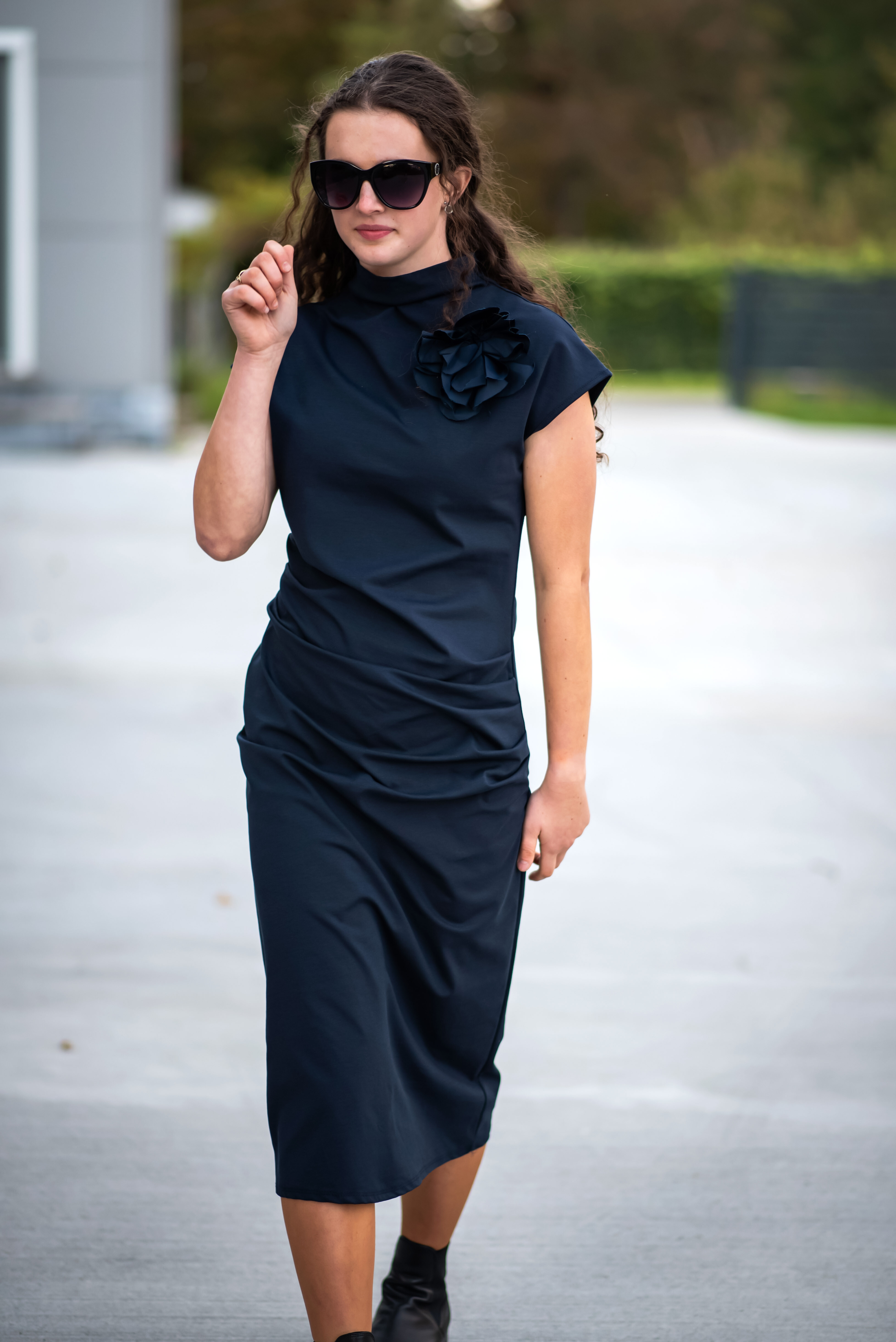 Elegantní dlouhé šaty, vhodné ke společenským příležitostem. Šaty jsou doplněny odnímatelnou broží, u krku jsou řešeny stojáčkem a v oblasti břicha mají rafinované řasení.