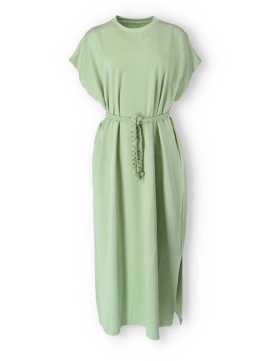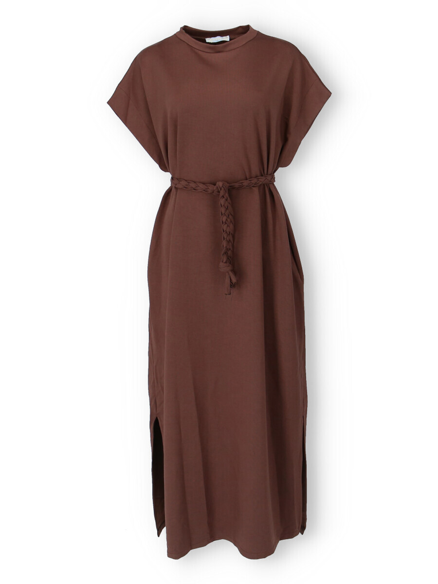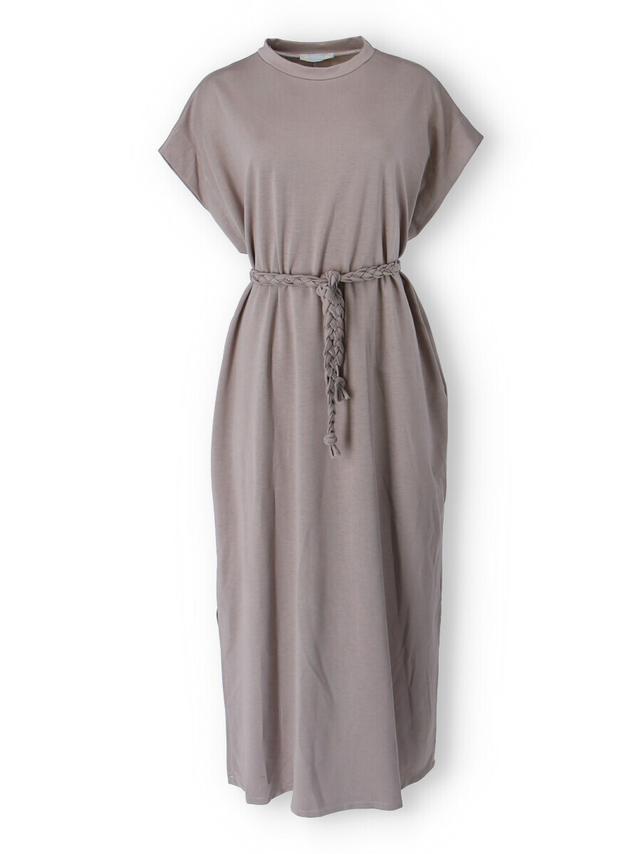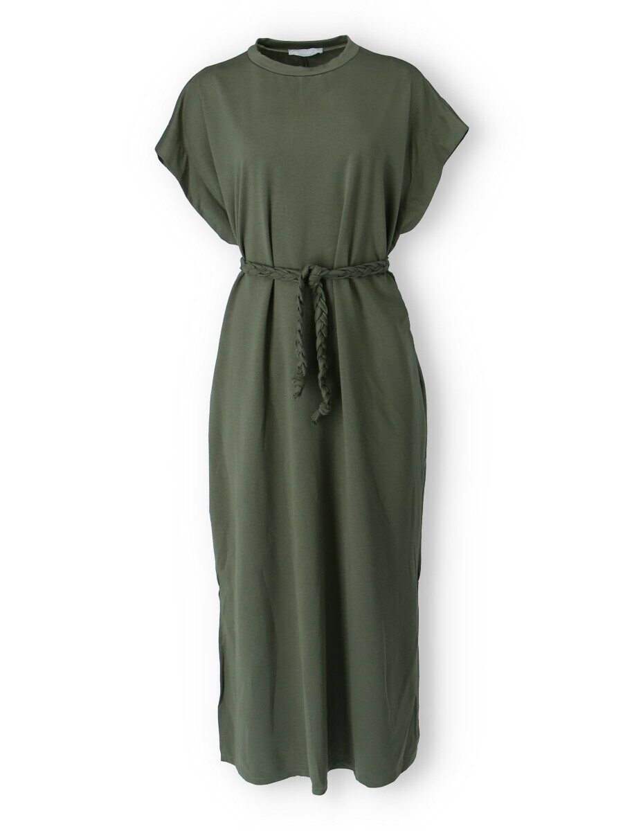 Dlouhé oversize MAXI šaty. Šaty mají všité kapsy a ve spodní části rozparky po stranách, jsou doplněny copánkovým páskem.