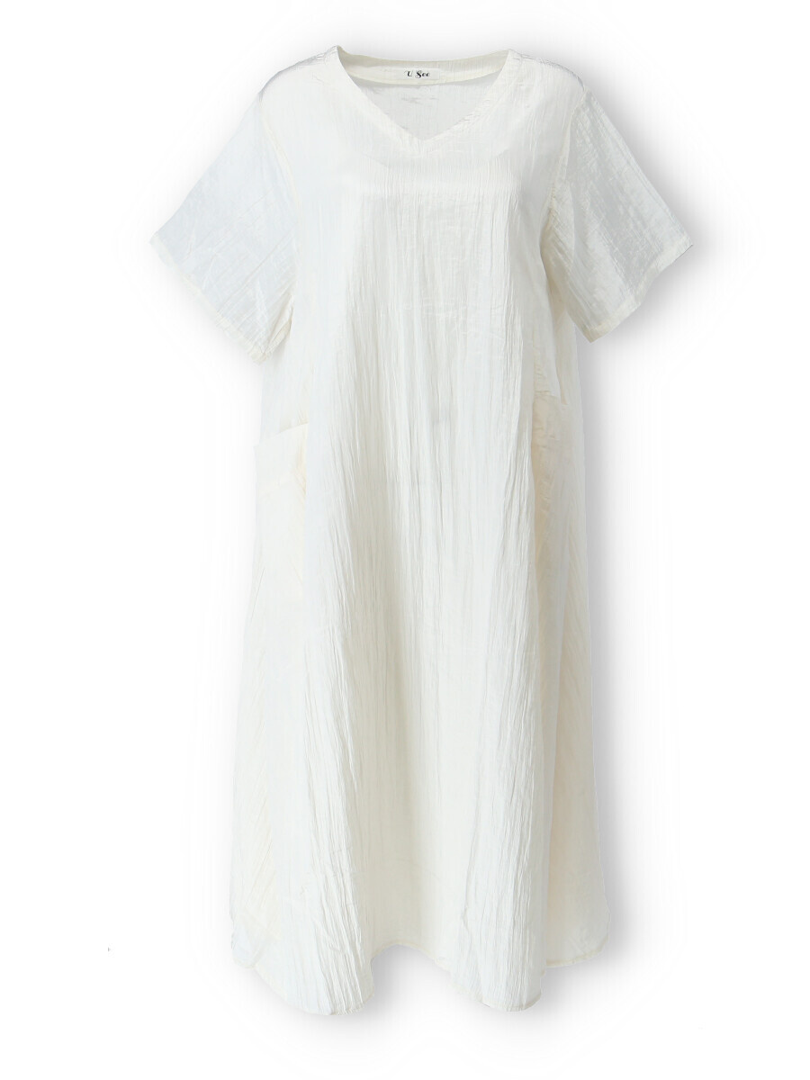 Dámské dlouhé šaty s našitými kapsami na přední straně, šaty jsou z velice příjemného materiálu, trendy krčený materiál. Šaty mají krátký rukáv a véčkový výstřih.