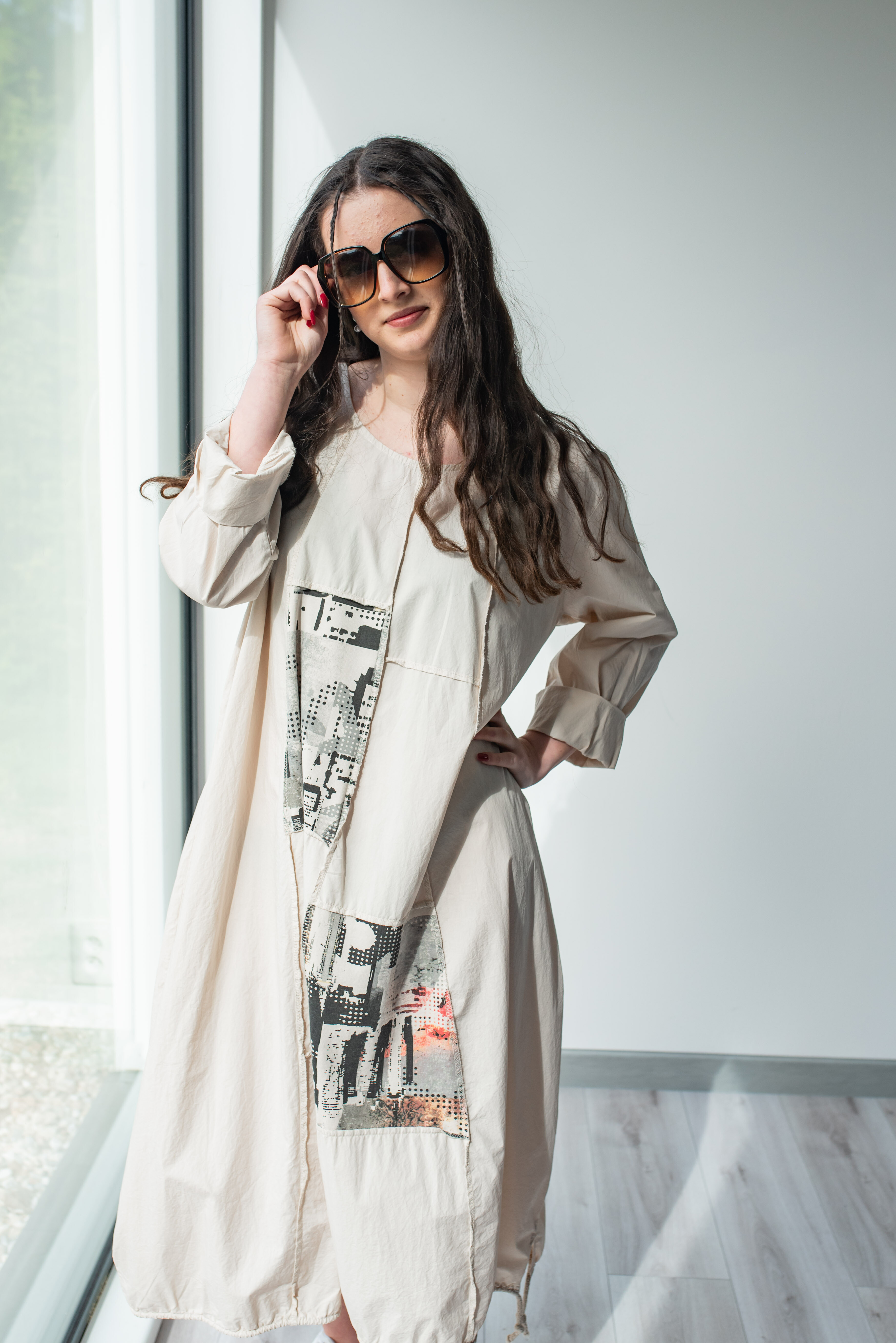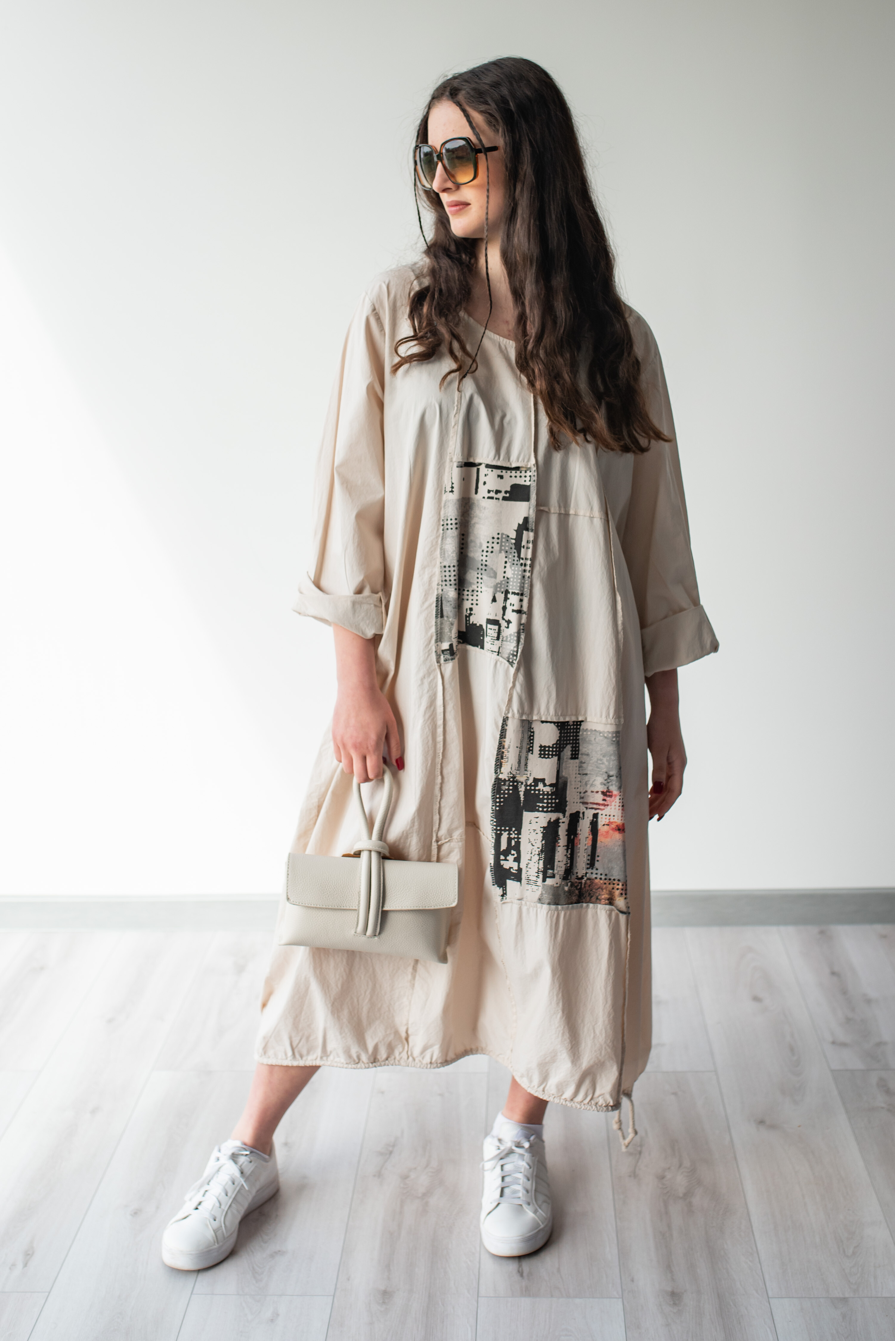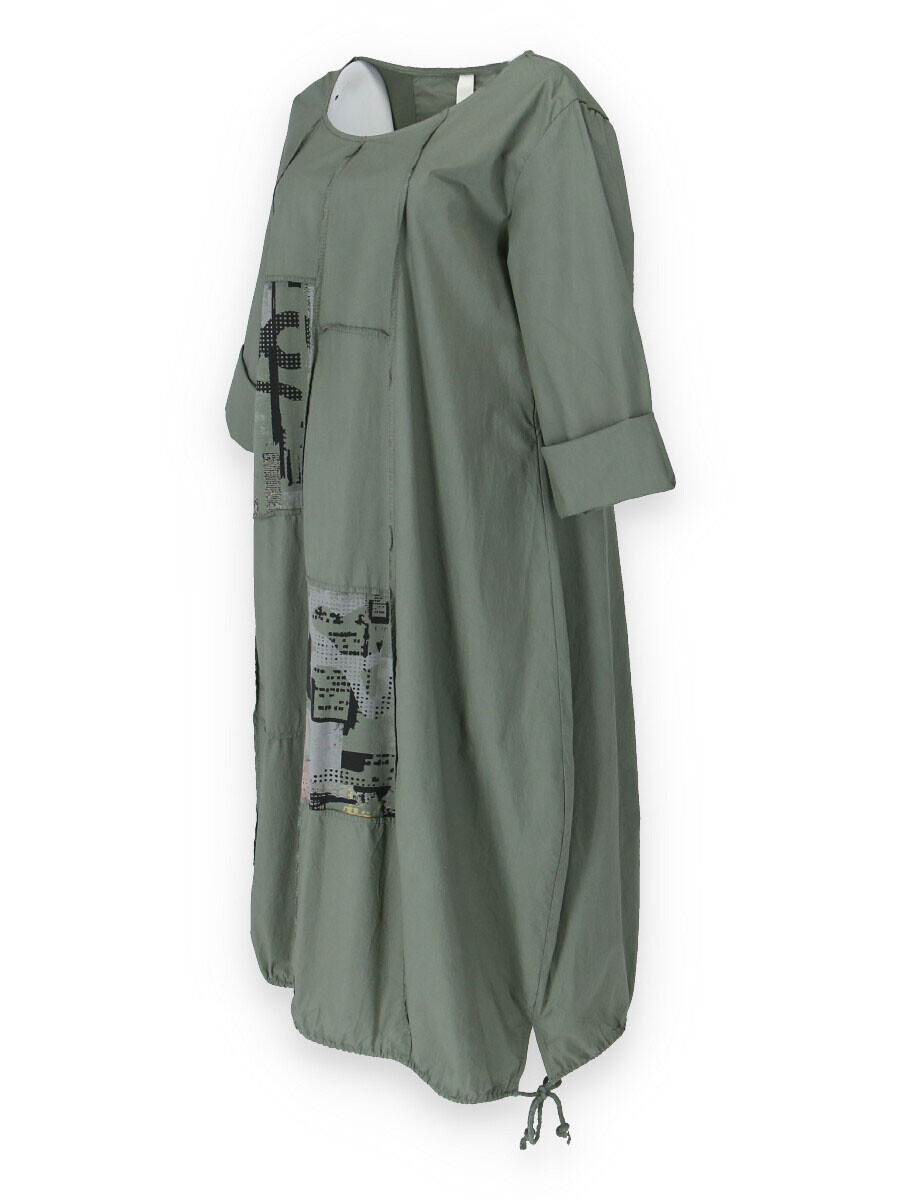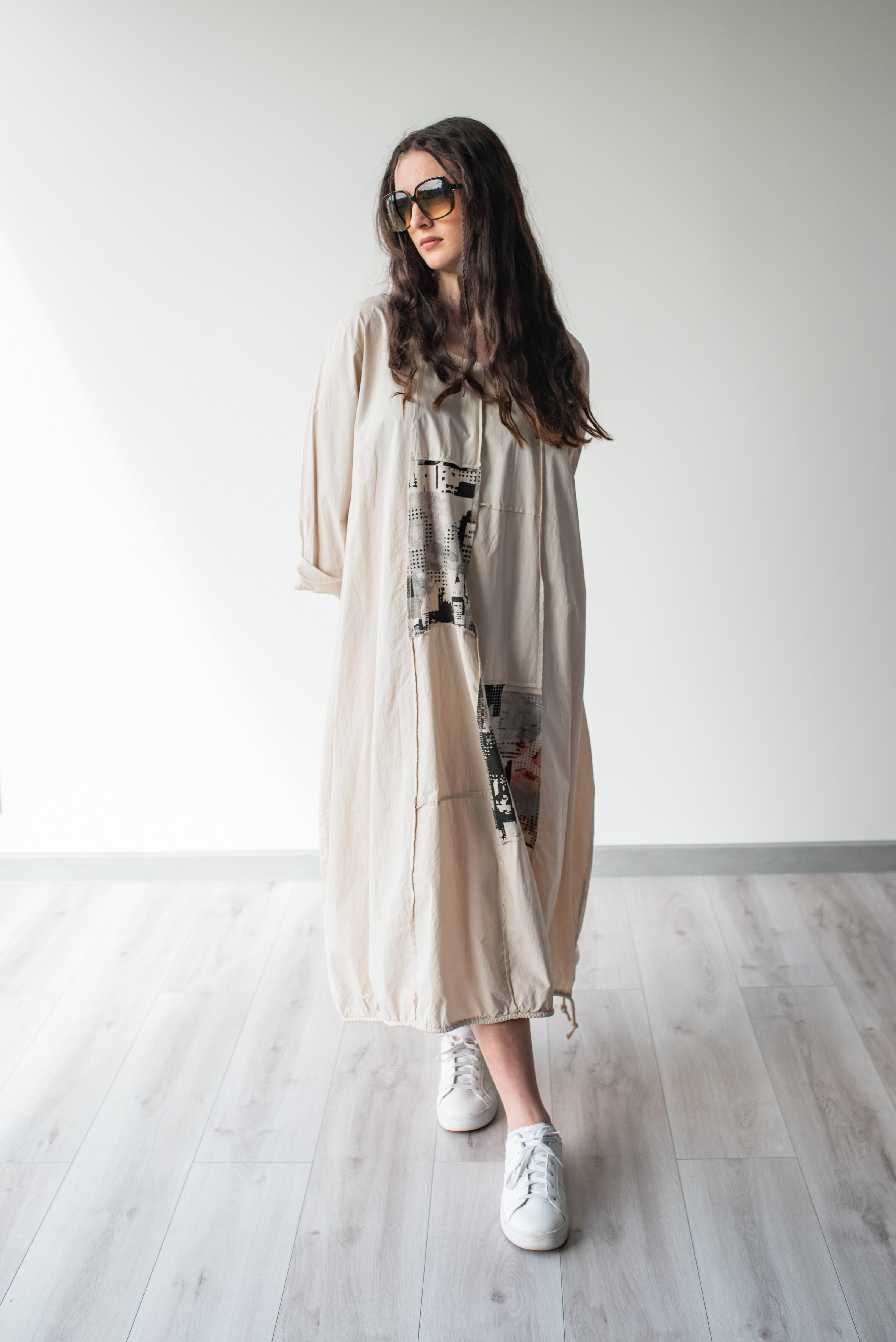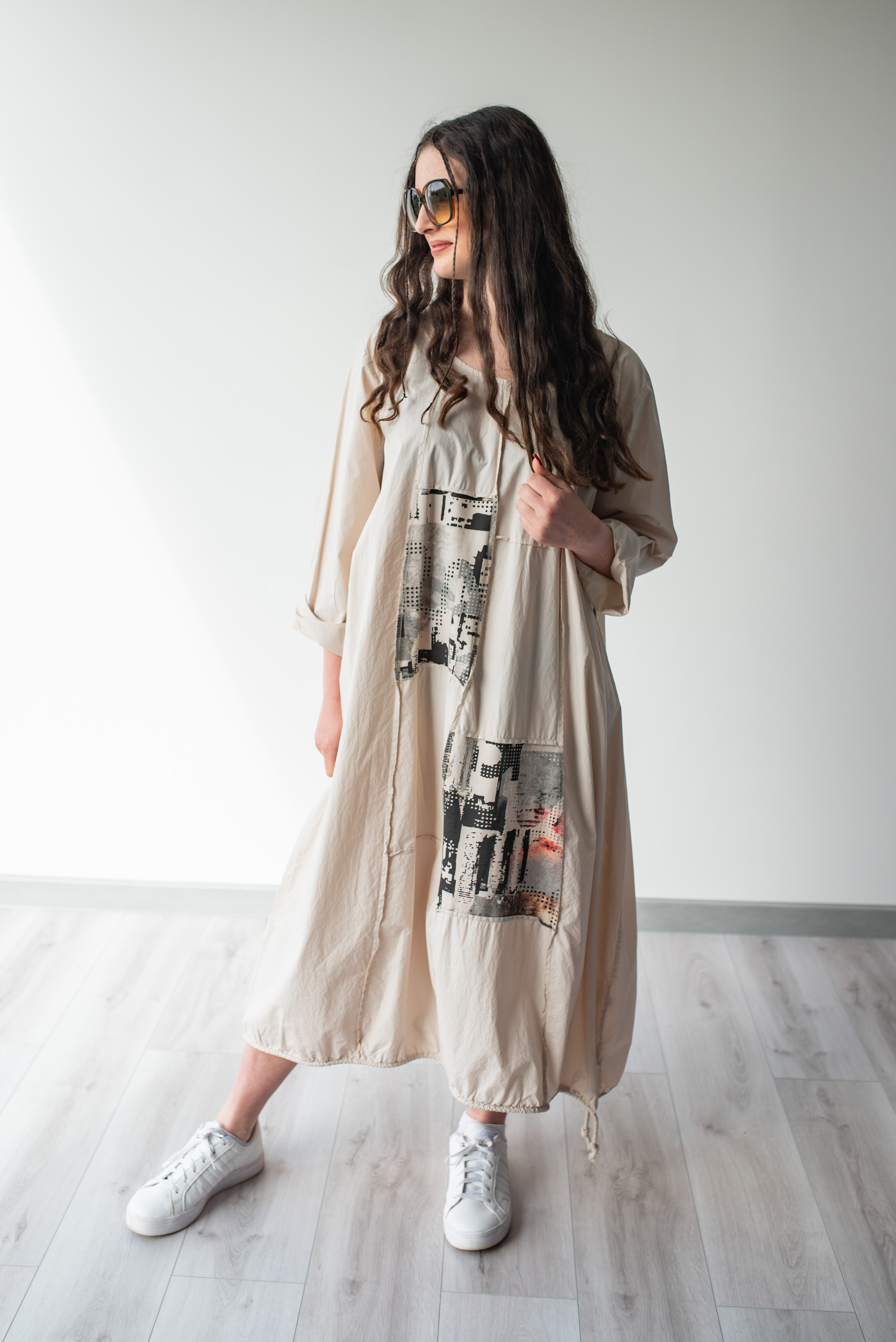 Dlouhé šaty s potiskem. Šaty jsou volnějšího balónového střihu. Ve spodní části regulace utažení na šňůrku.