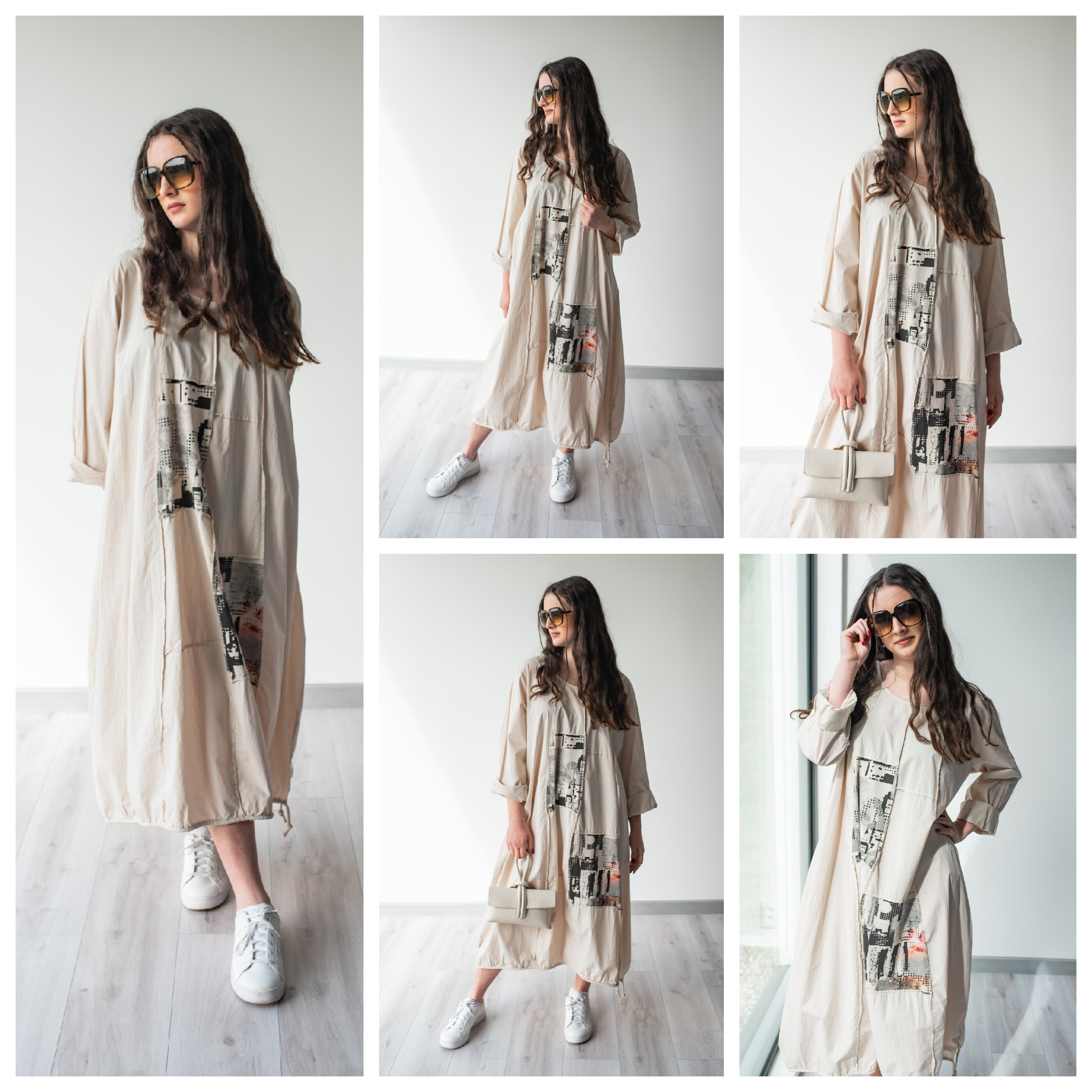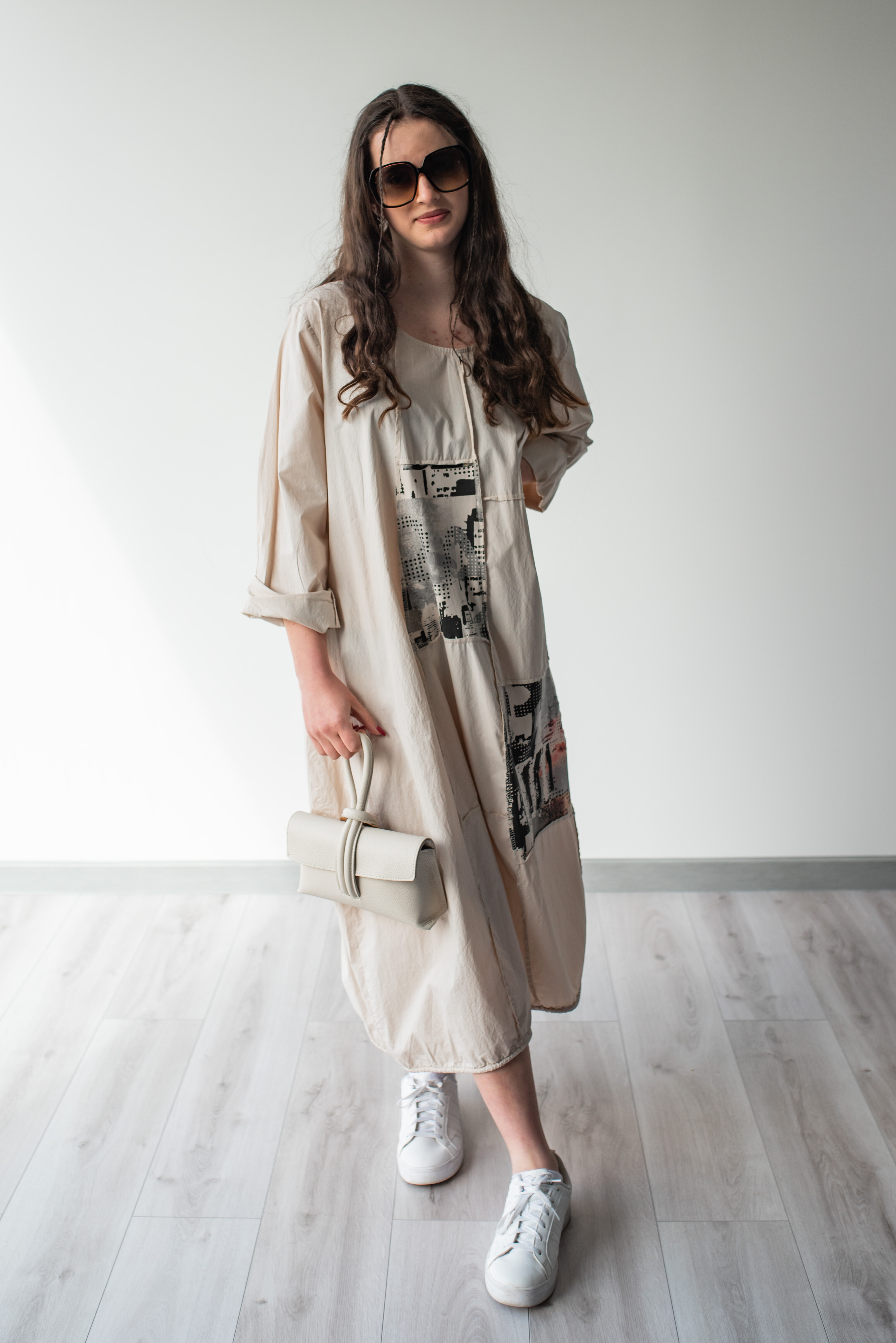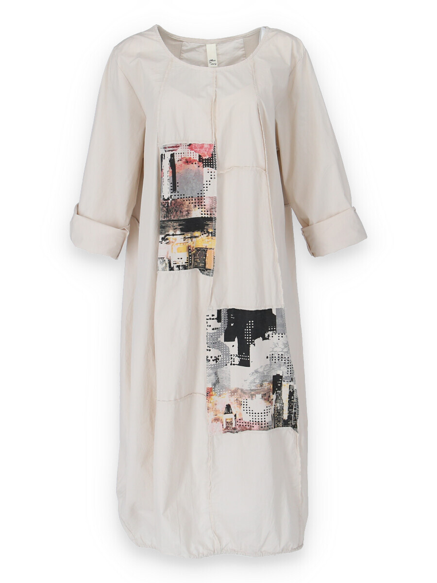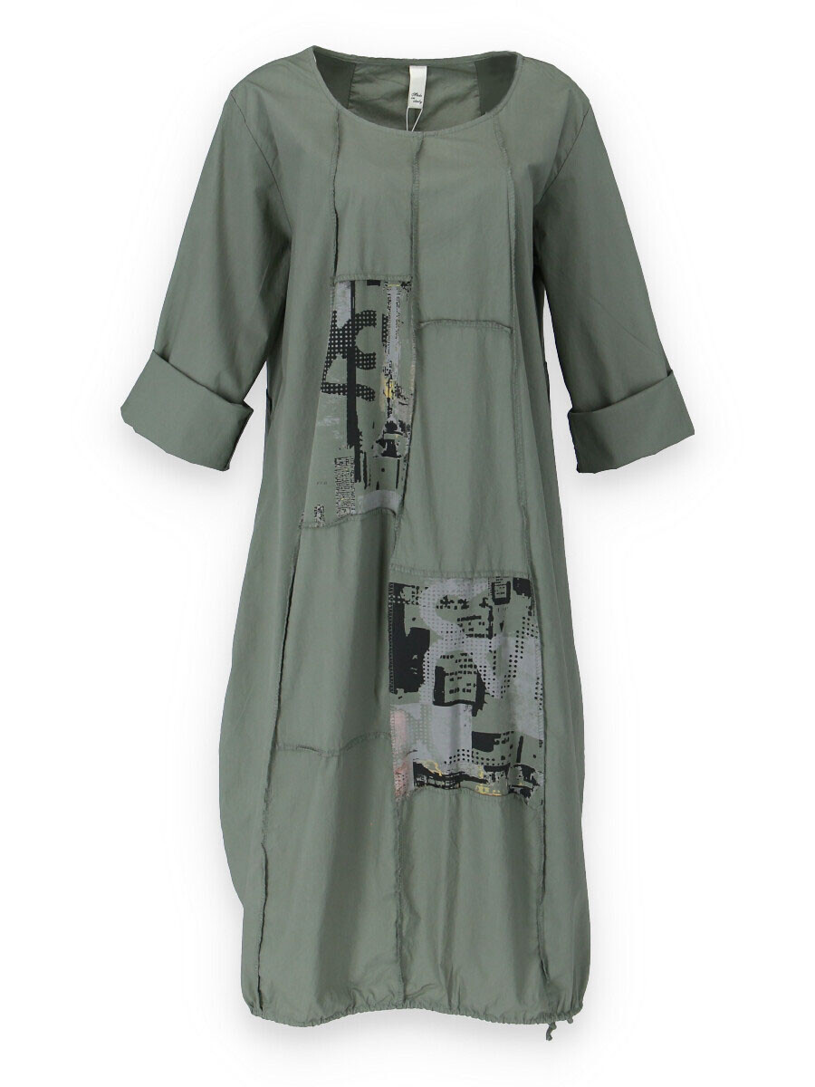 Dlouhé šaty s potiskem. Šaty jsou volnějšího balónového střihu. Ve spodní části regulace utažení na šňůrku.