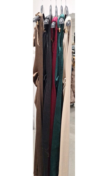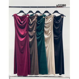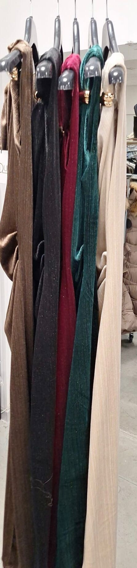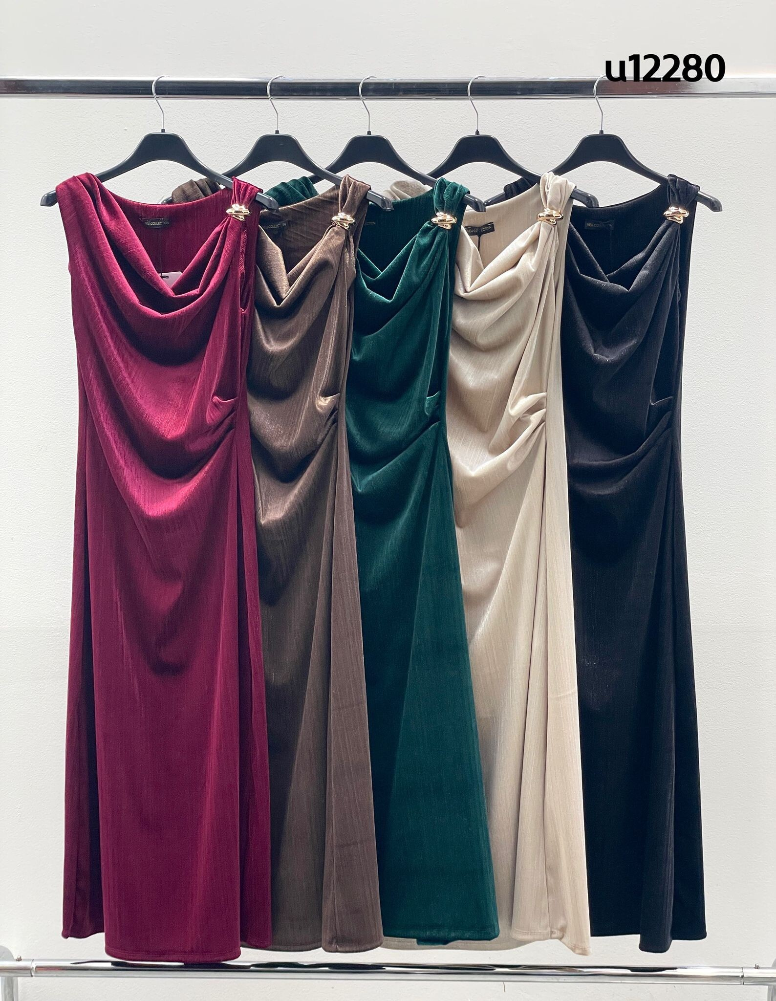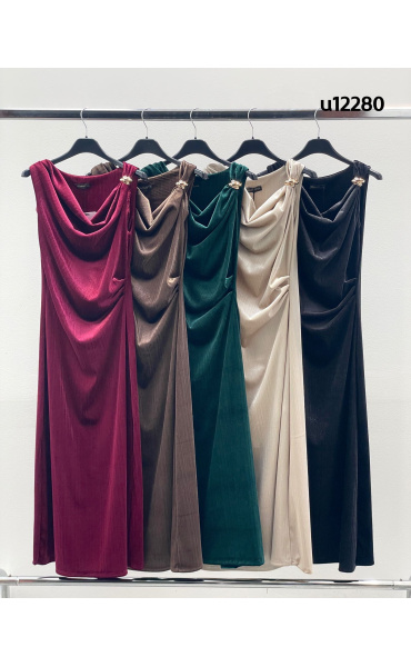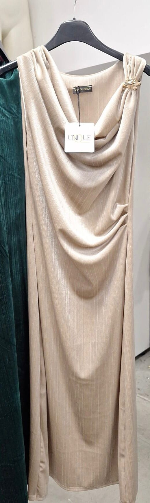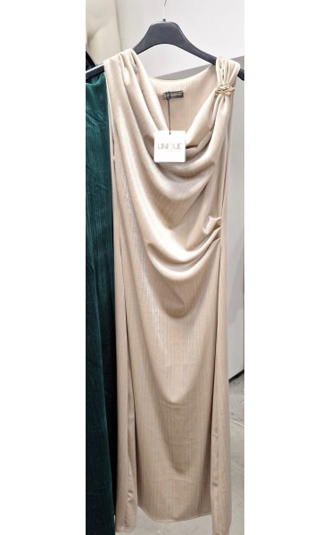 Dlouhé společenské šaty s lurexem. Šaty mají řasení na boku a aplikaci spony na rameni.