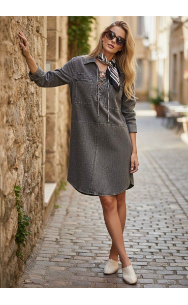 Trendy džínová šatovka s límečkem. Šatovka je volnějšího střihu, má aplikaci vázání v oblasti hrudníku a našité kapsy na prsou. Stylový jarní kousek.