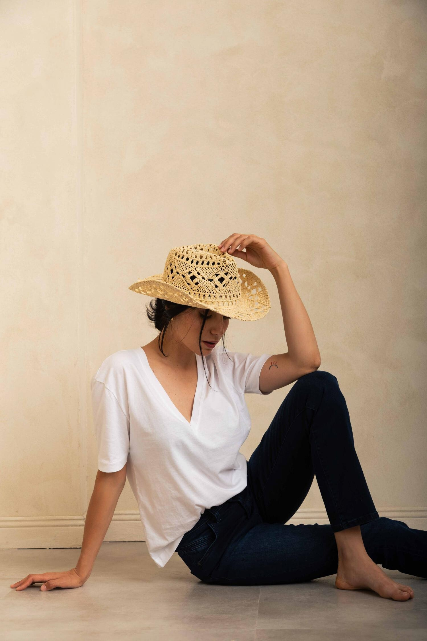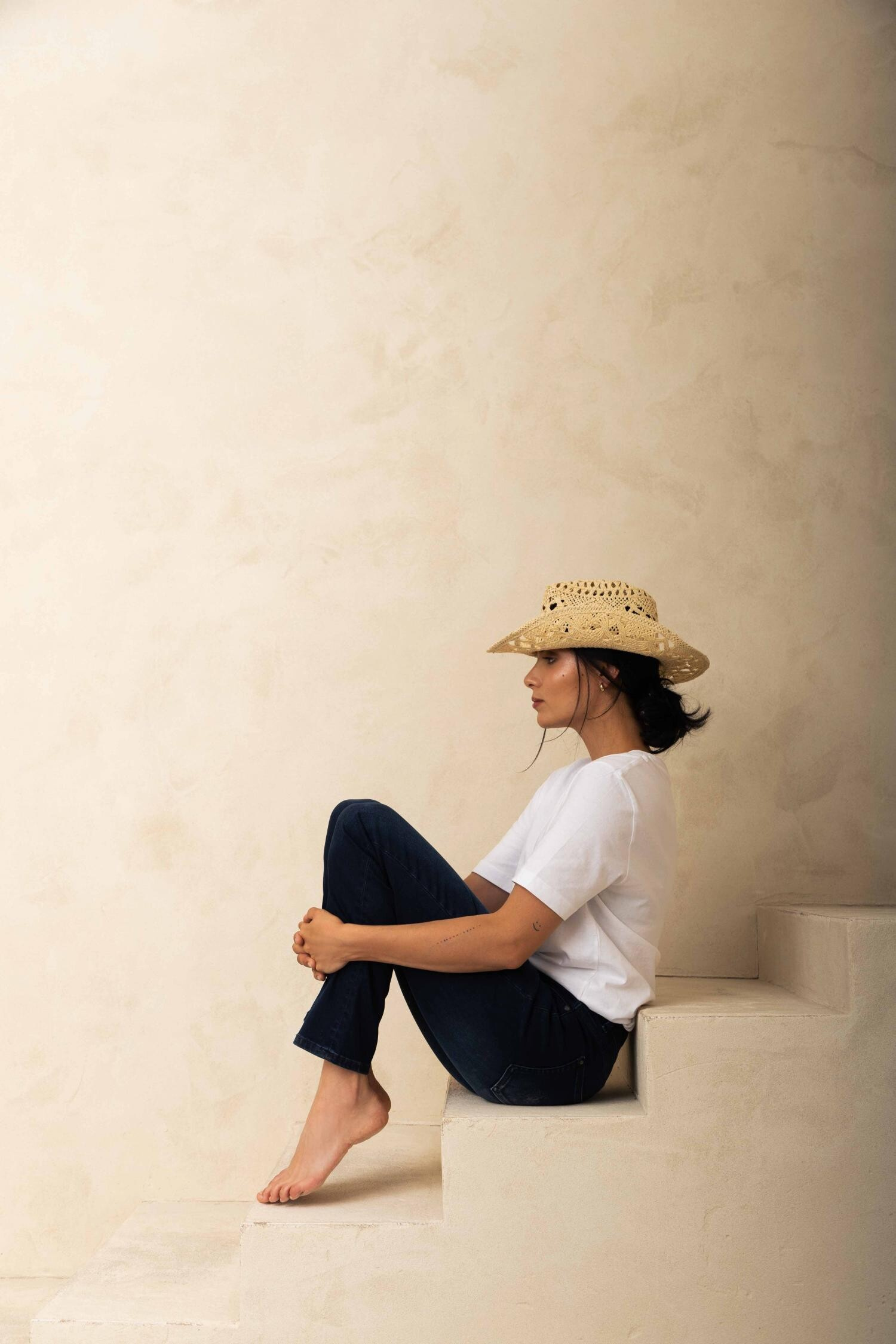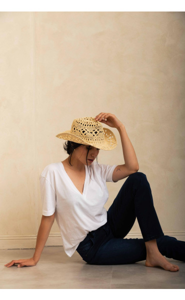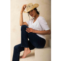 Džíny s vysokým pasem a rovnými nohavicemi se zipem. Vyrobeny z velmi měkké a pružné tkaniny obsahující speciální typ PBT polyesteru, díky kterému jsou džíny odolné, nemění při nošení svůj tvar a mají extrémně měkký úchop. Díky jemným oděrkám vypadají nohy štíhlejší. Velikost je standardní - látka je velmi pružná a přizpůsobivá.