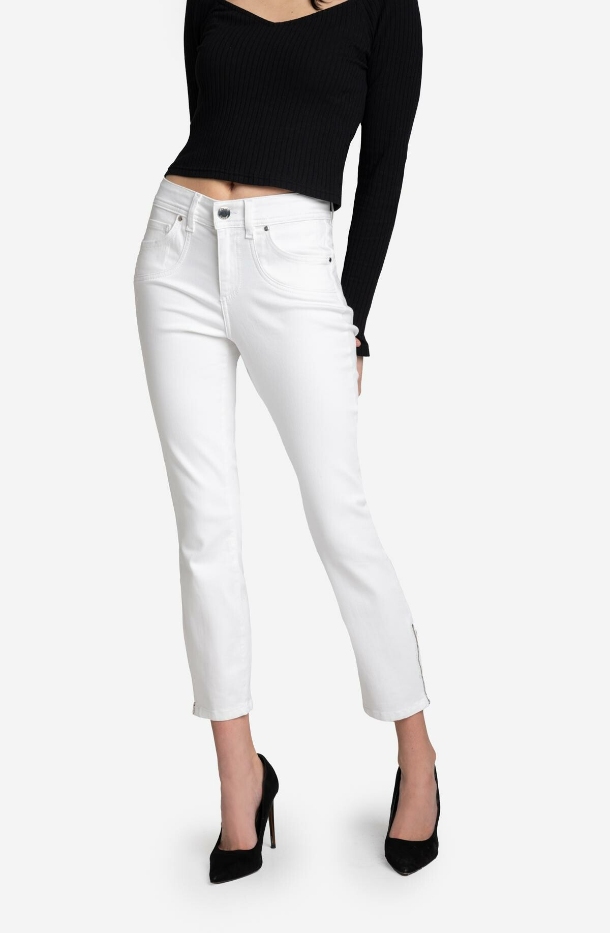 NOVINKA! Kalhoty VANESSA s perfektní, mírně kratší délkou, zakončené zipy ve spodní části nohavic. Vyrobeno z neuvěřitelně měkké a pružné tkaniny, ideální pro teplejší dny. Modelka je vysoká 173 cm a má na sobě velikost S/27.
