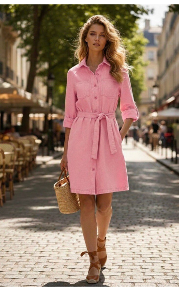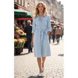 Trendy džínové košilové šaty ke kolenům. Šaty jsou celo propínací s vázáním v pase. Šaty mají dlouhý rukáv s možností regulace na knoflík.