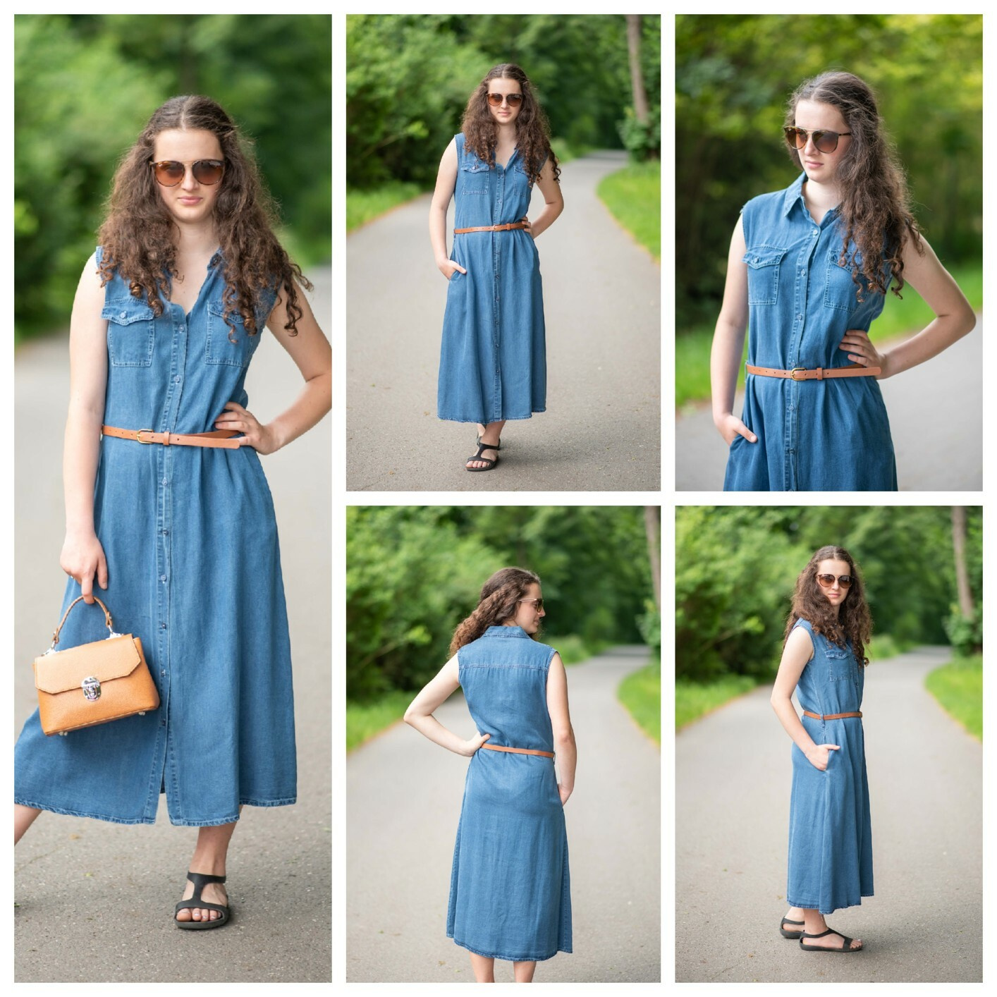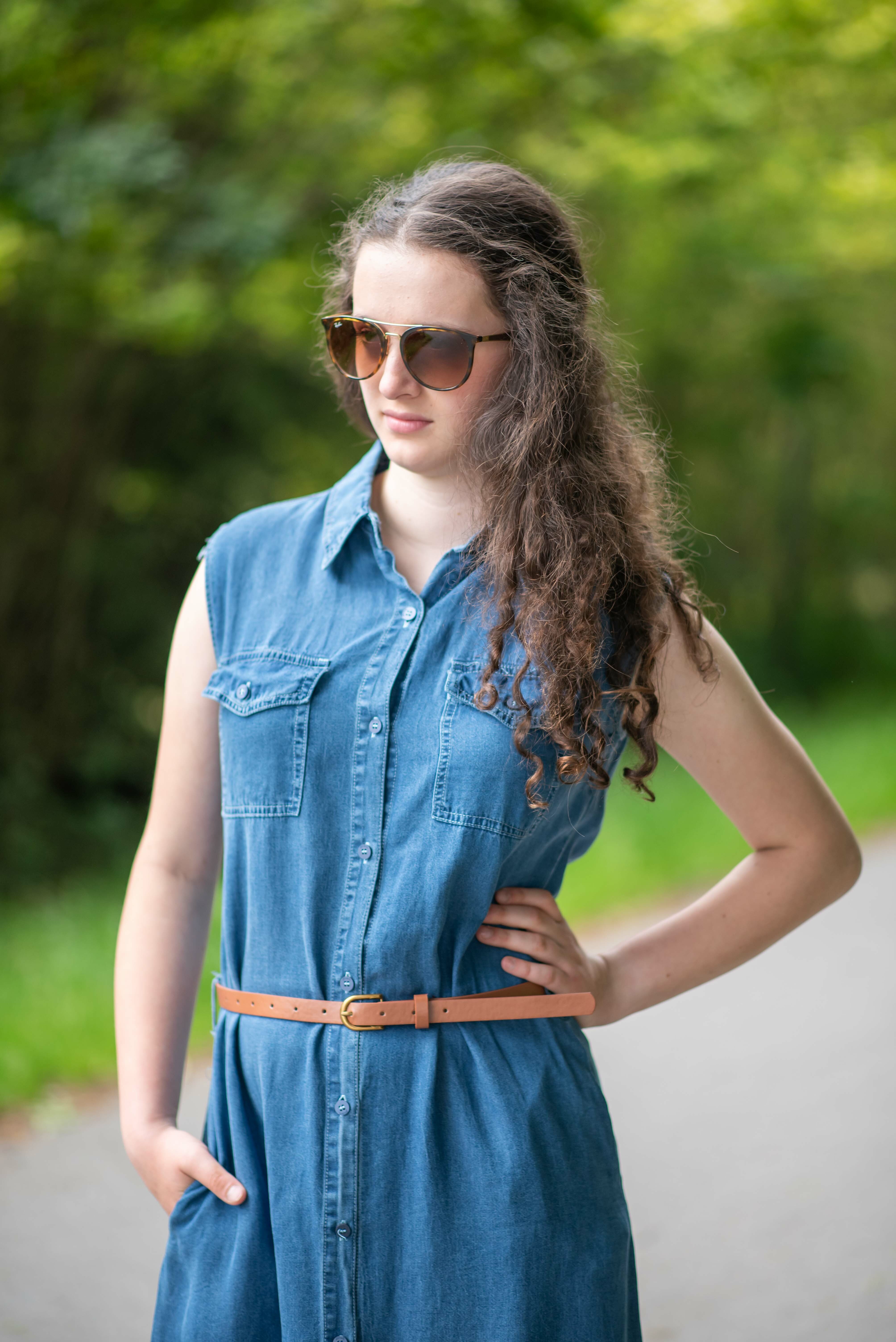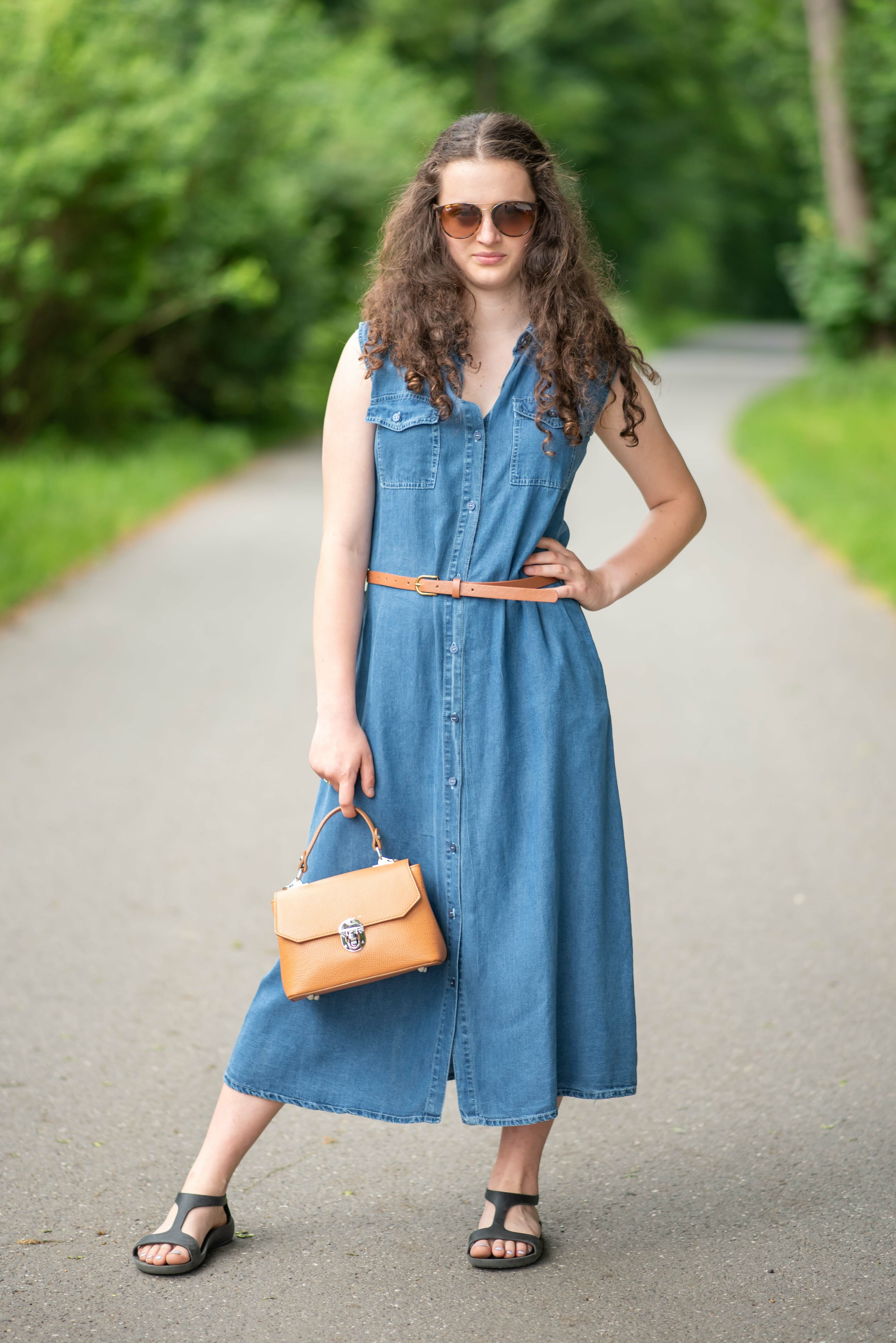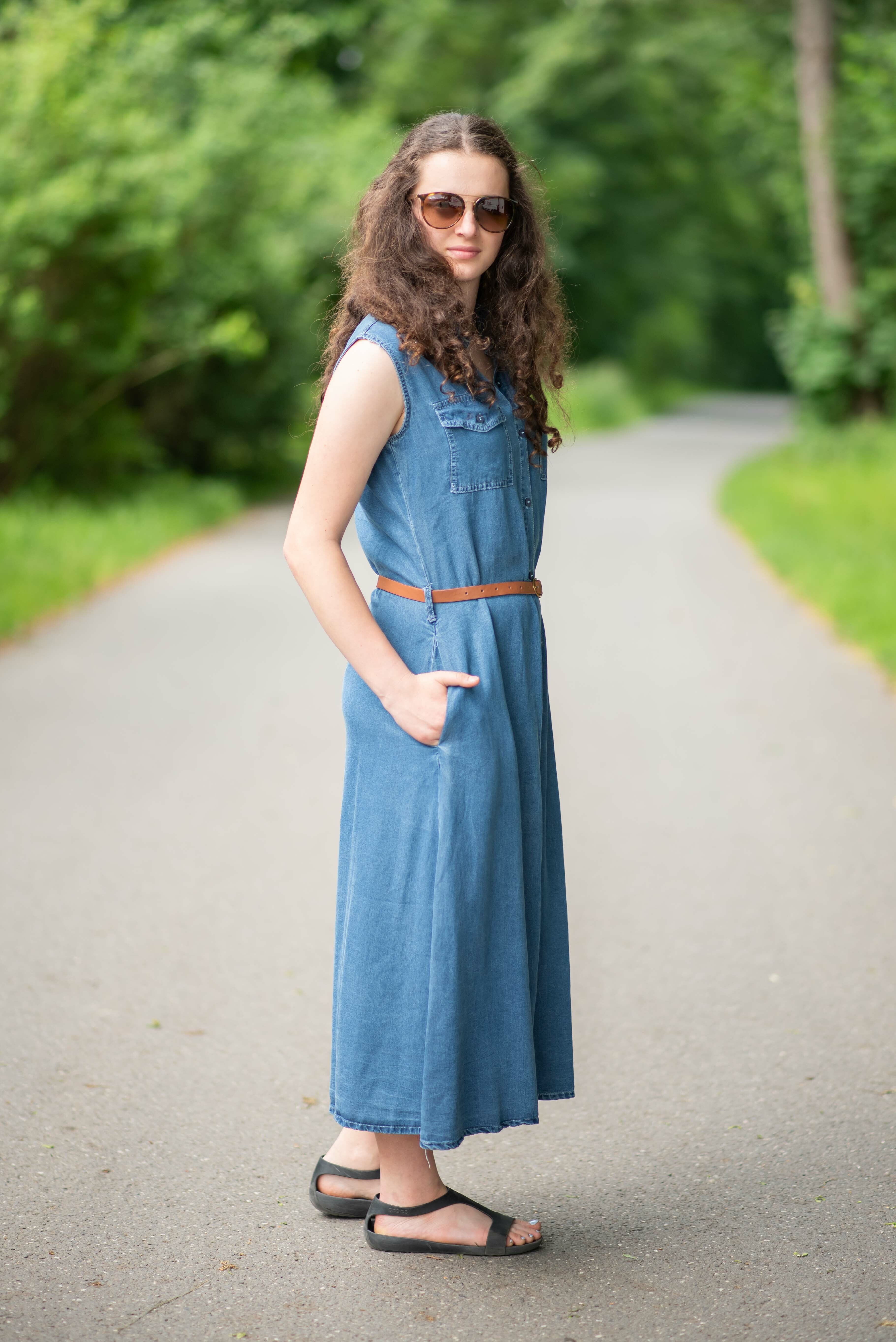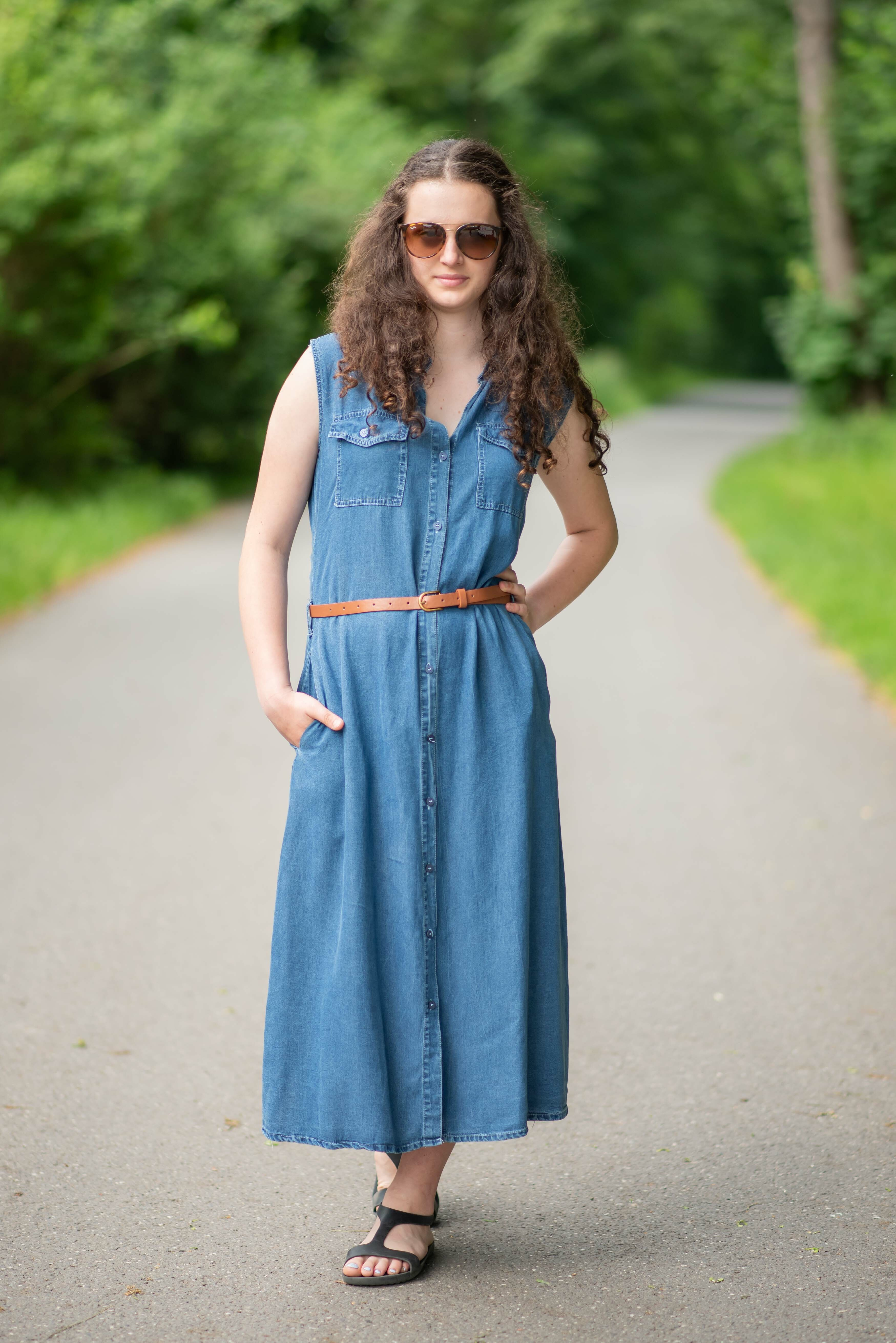 Dlouhé džínové šaty bez rukávu, košilového střihu, celopropínací. Šaty jsou velice vzdušné, vybeny z odlehčené džínoviny.