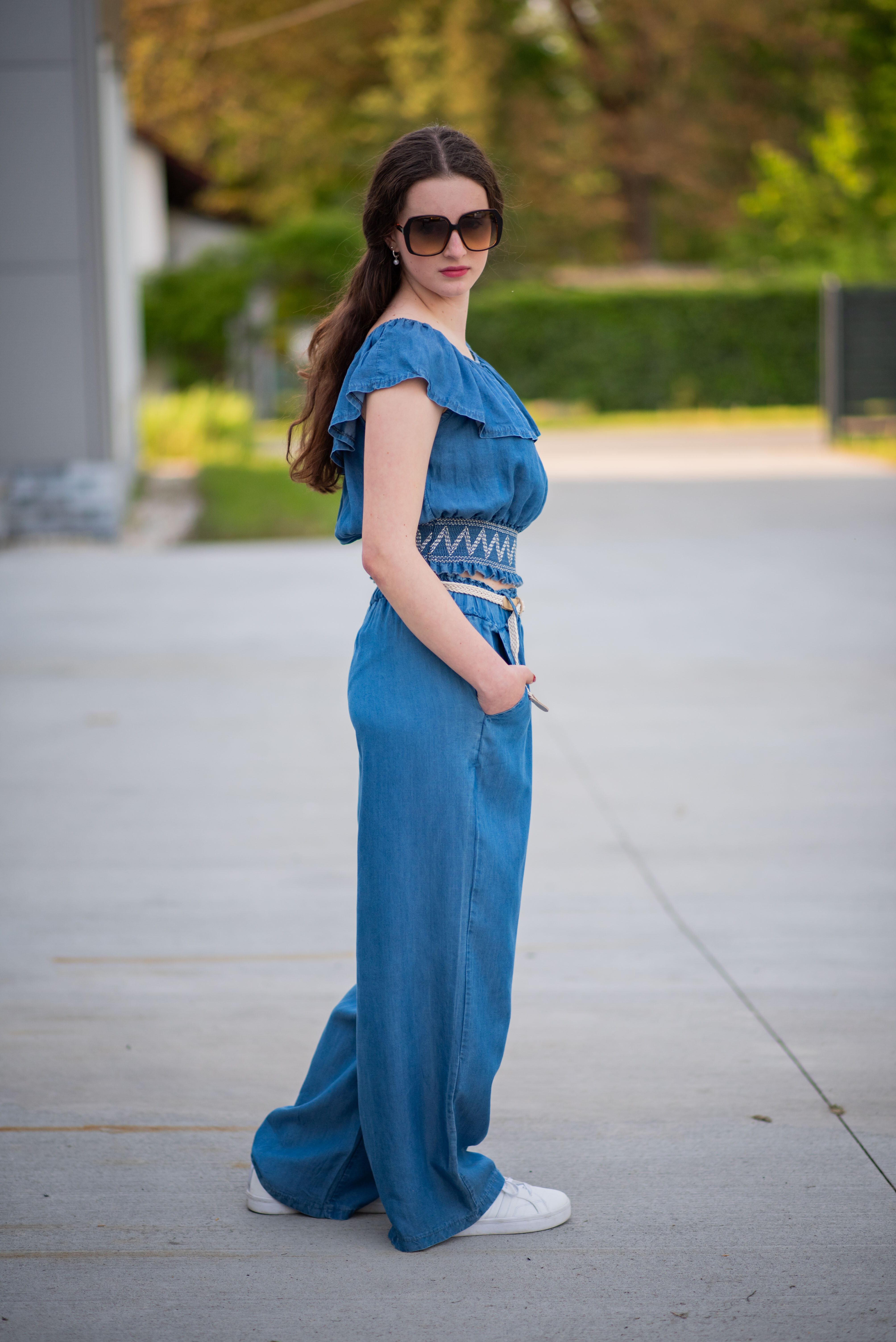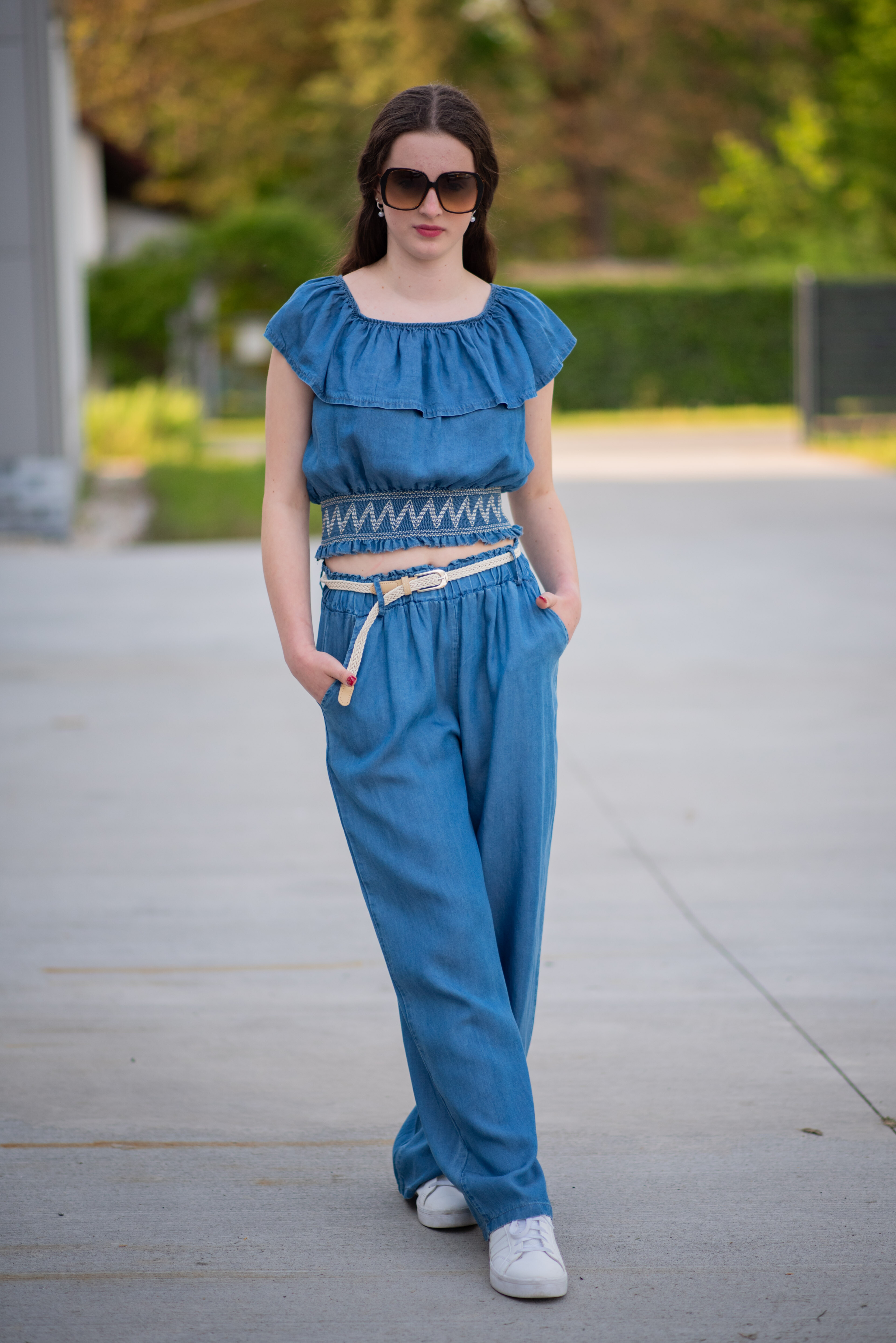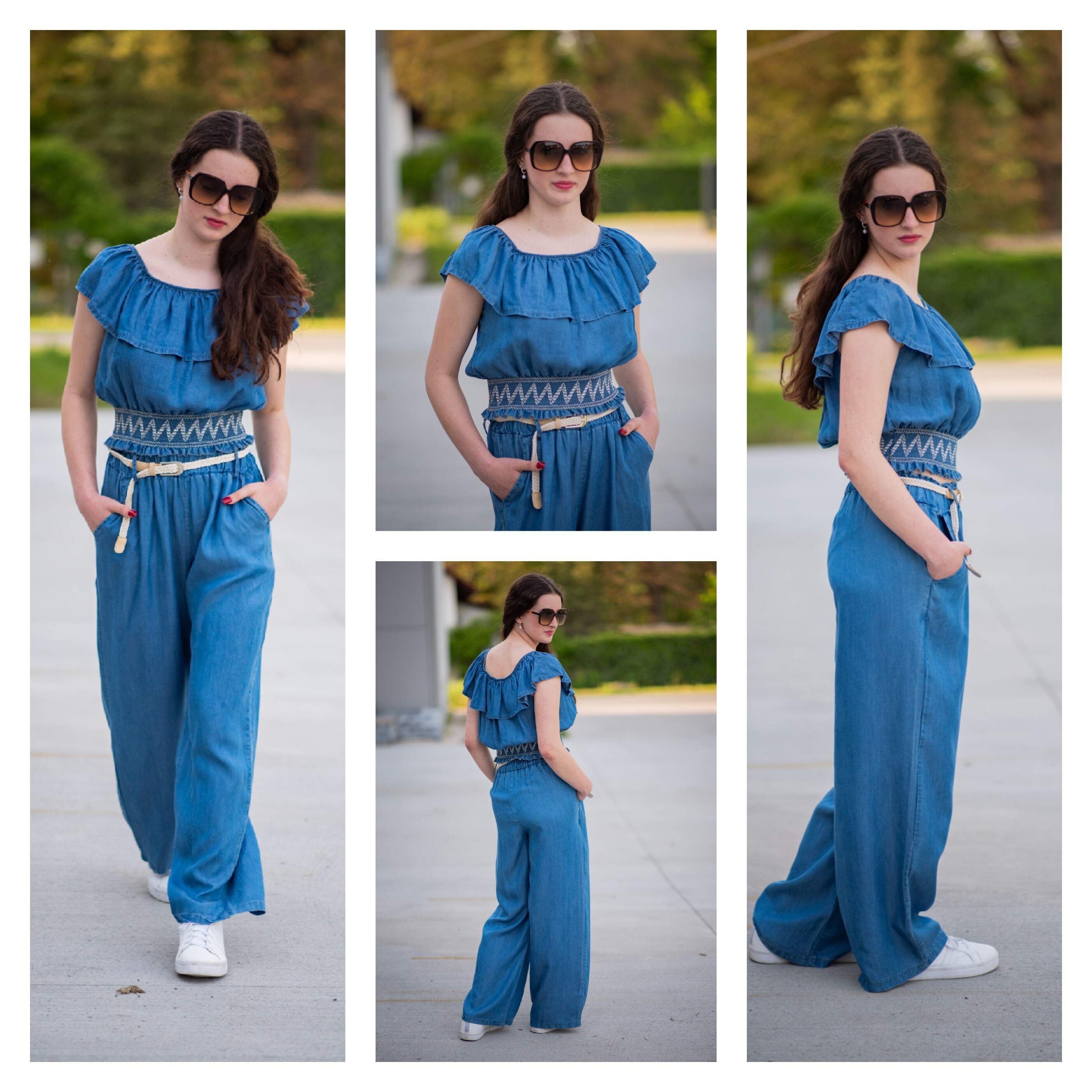 Džínové široké kalhoty v pase do gumy. Kalhoty jsou doplněny páskem, jsou z velmi příjemného a lehkého materiálu.