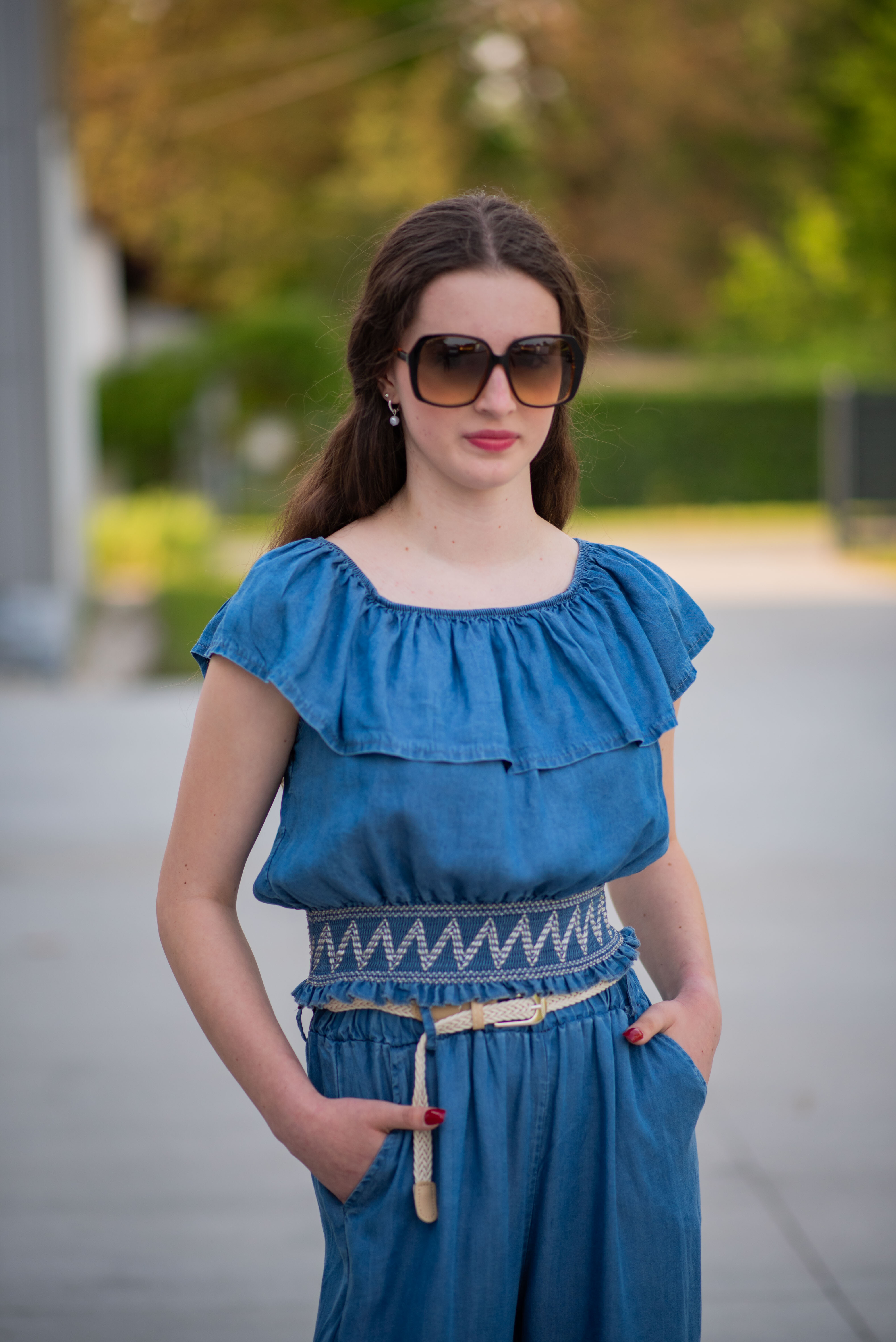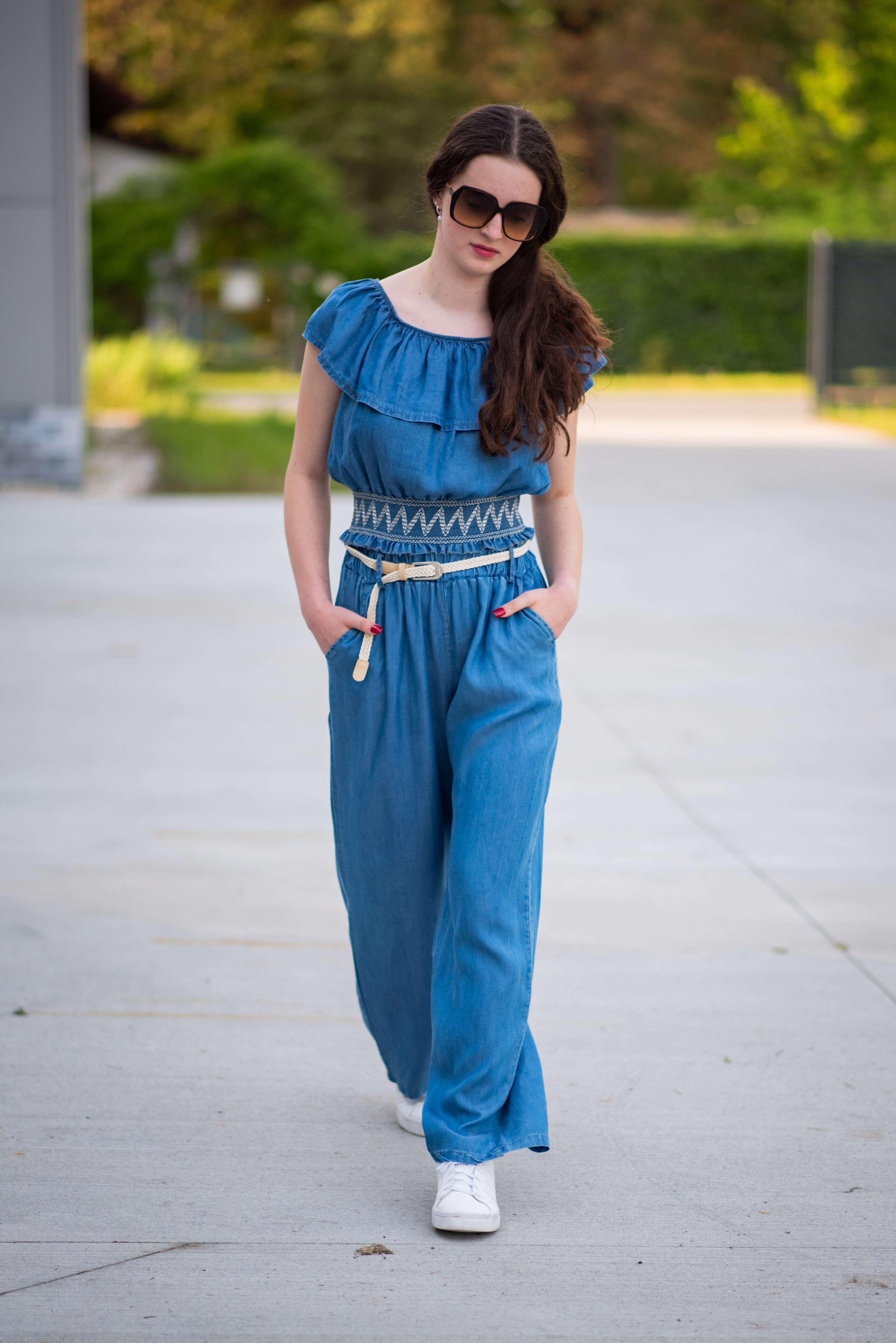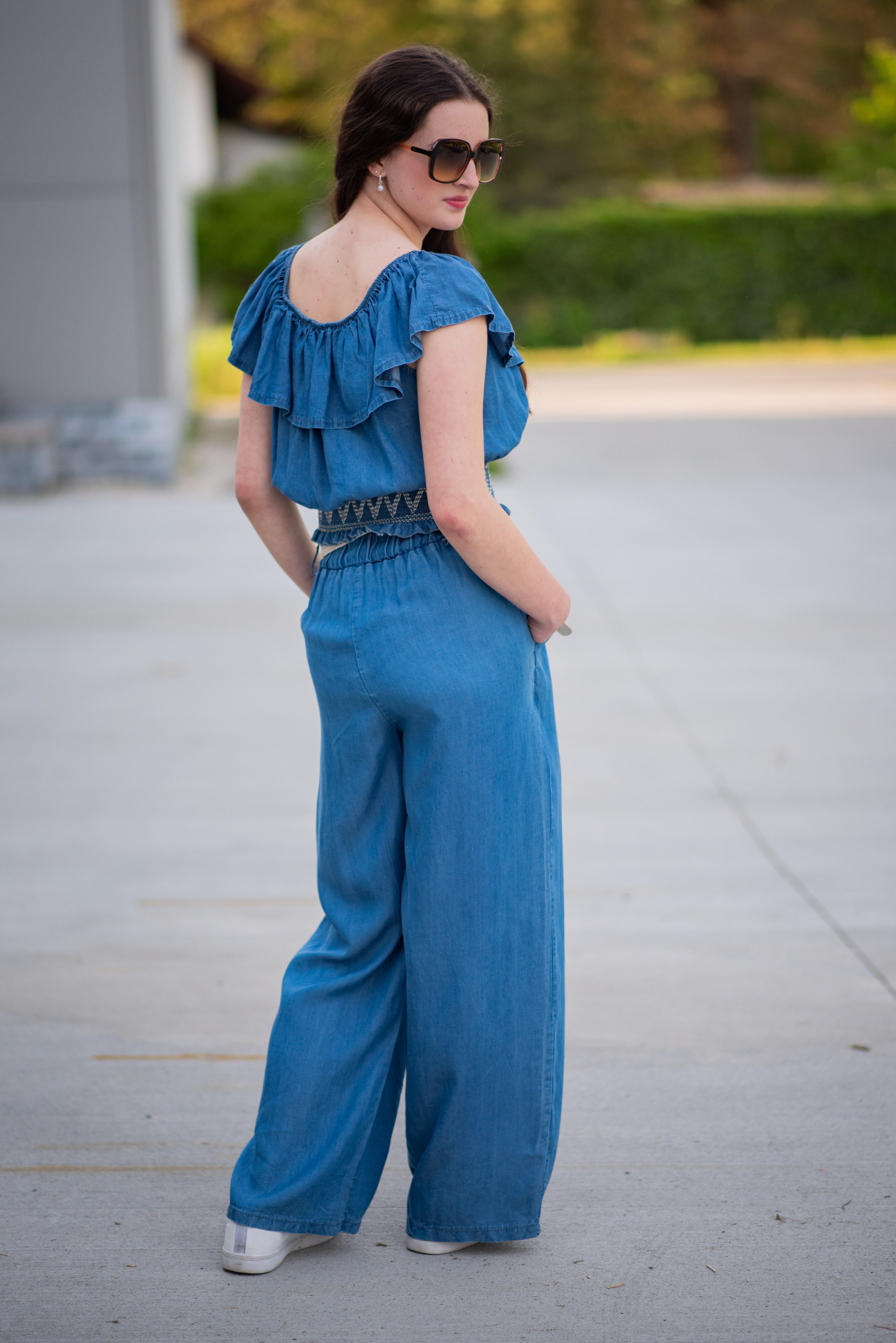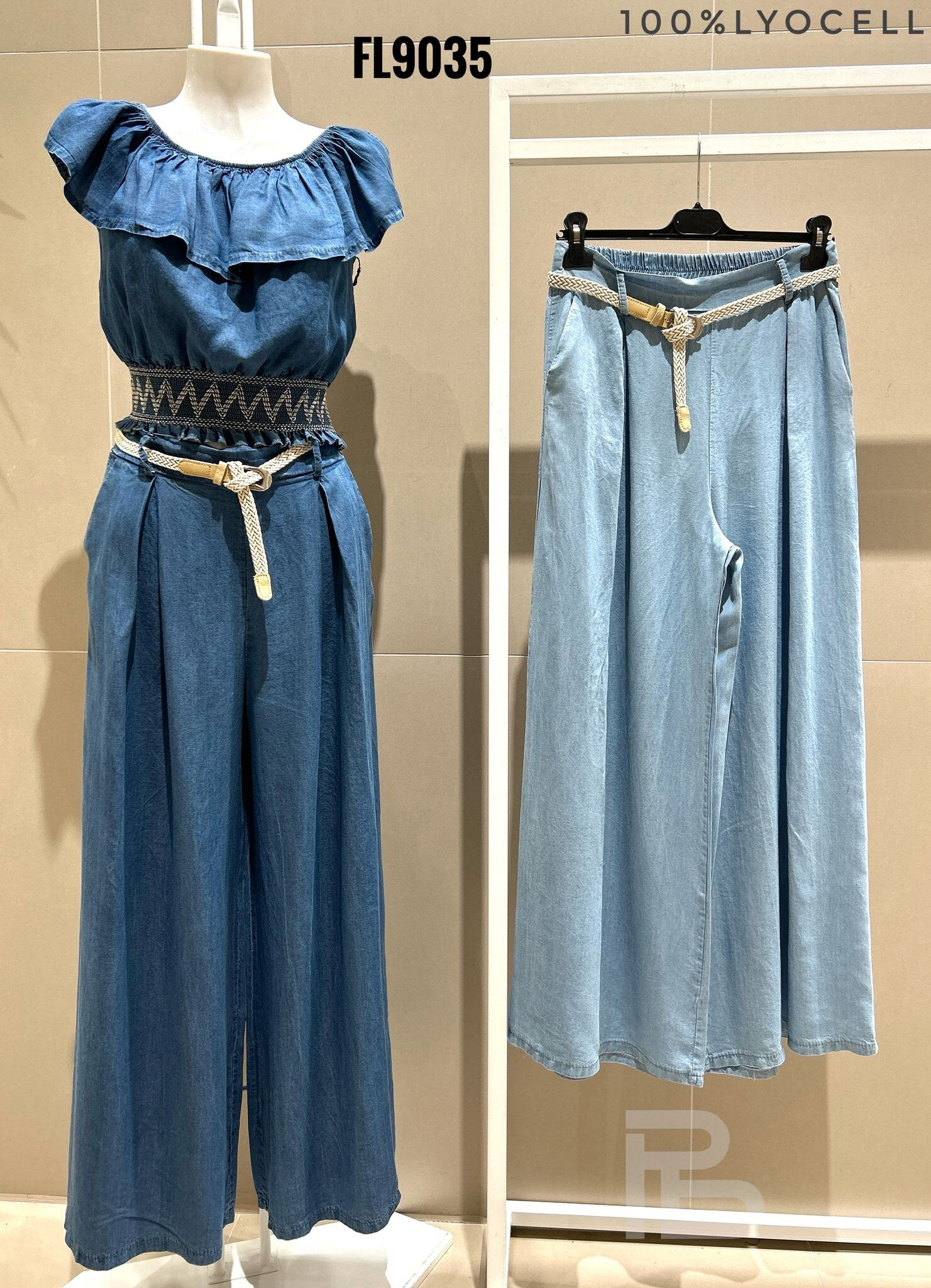 Džínové široké kalhoty v pase do gumy. Kalhoty jsou doplněny páskem, jsou z velmi příjemného a lehkého materiálu.